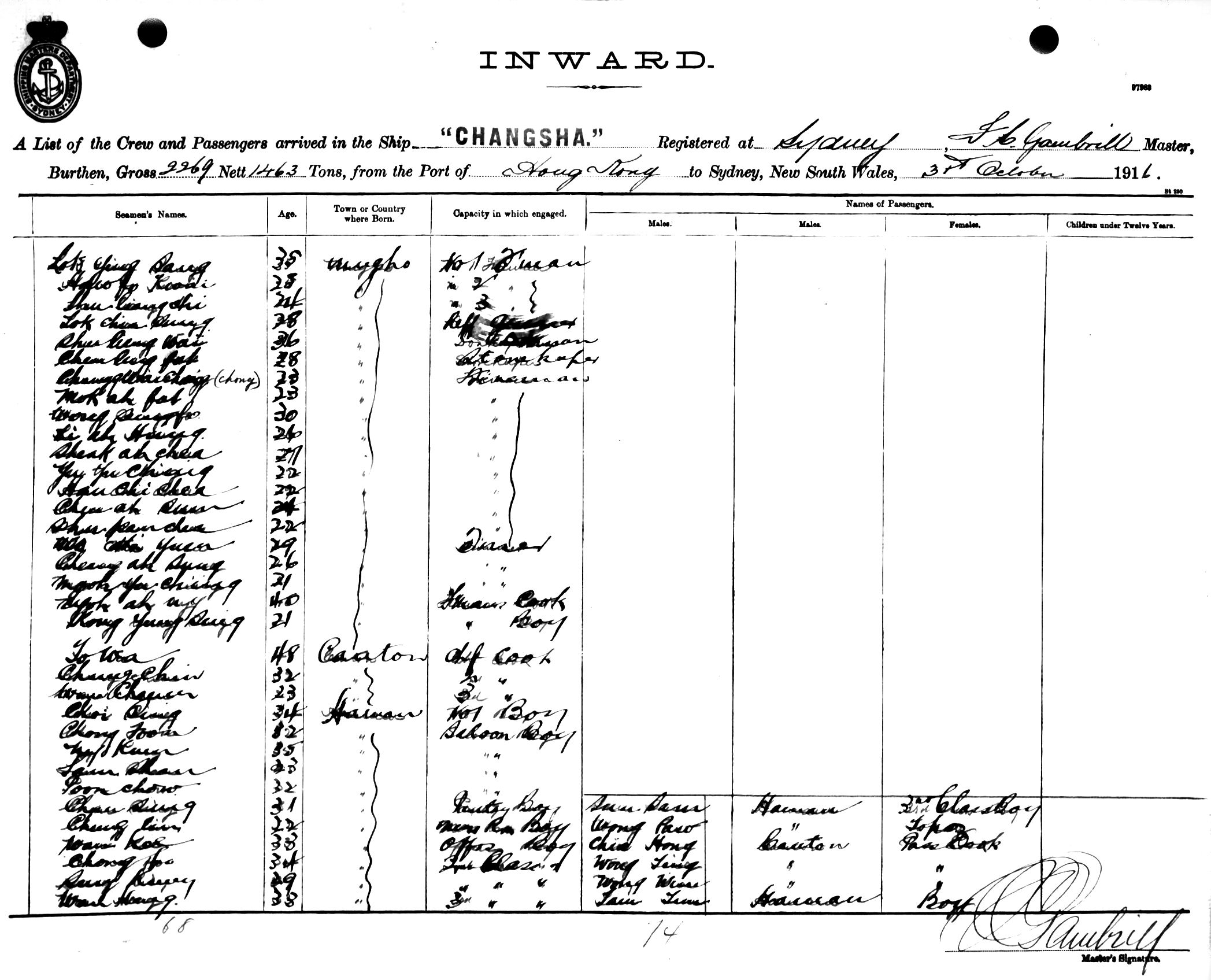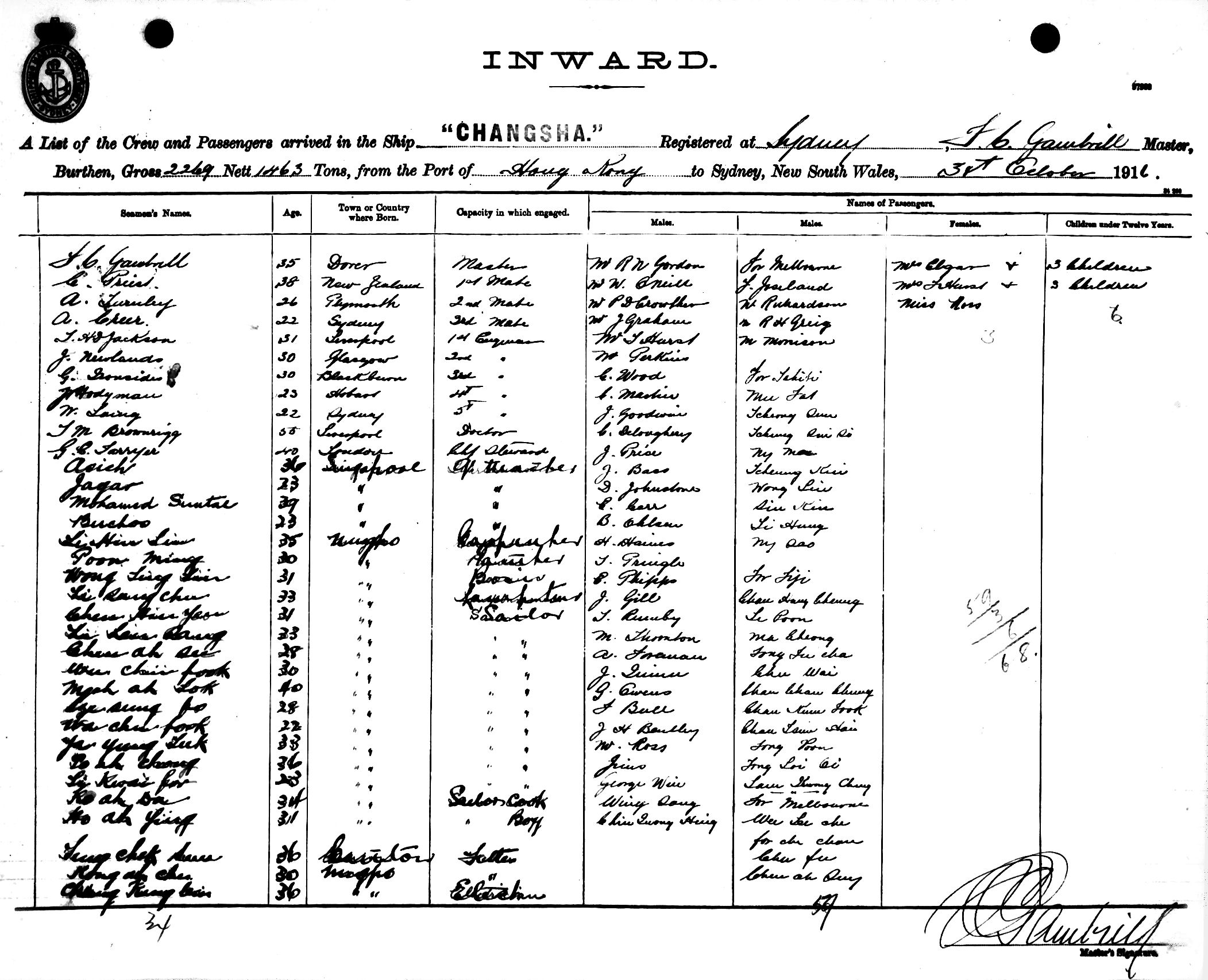 CHANGSHAOF SYDNEY, F. C. GAMBRILL, MASTER, BURTHEN 2269/1463 TONS FROM THE PORT OF HONG KONG TO SYDNEY, NEW SOUTH WALES, 31ST OCTOBER 1916 |