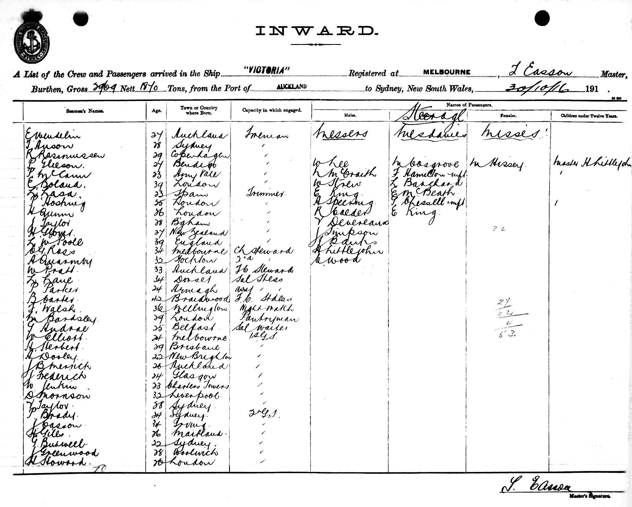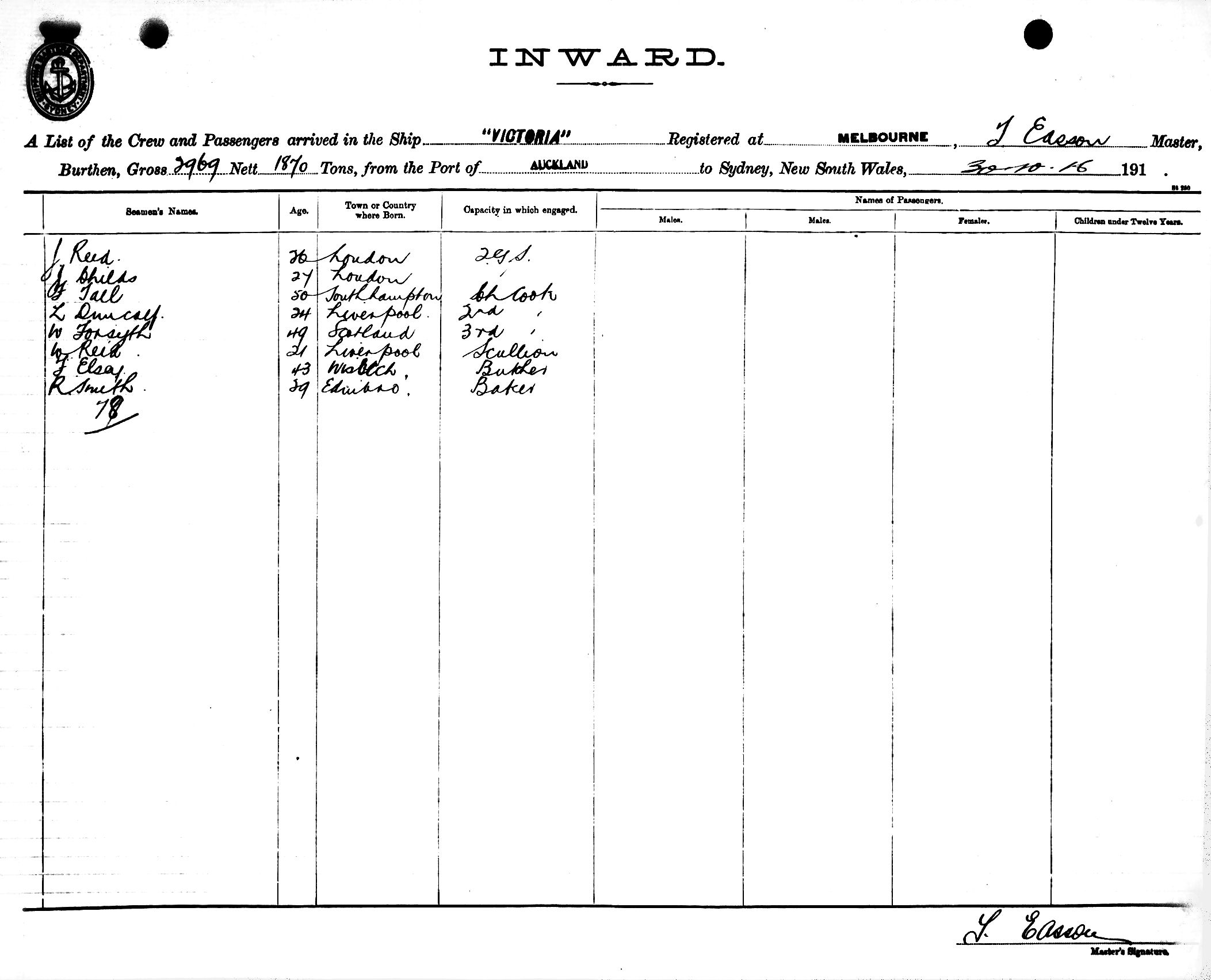 VICTORIAOF MELBOURNE, T. EASSON, MASTER, BURTHEN 2969/1870 TONS FROM THE PORT OF AUCKLAND TO SYDNEY, NEW SOUTH WALES, 30TH OCTOBER 1916 |
