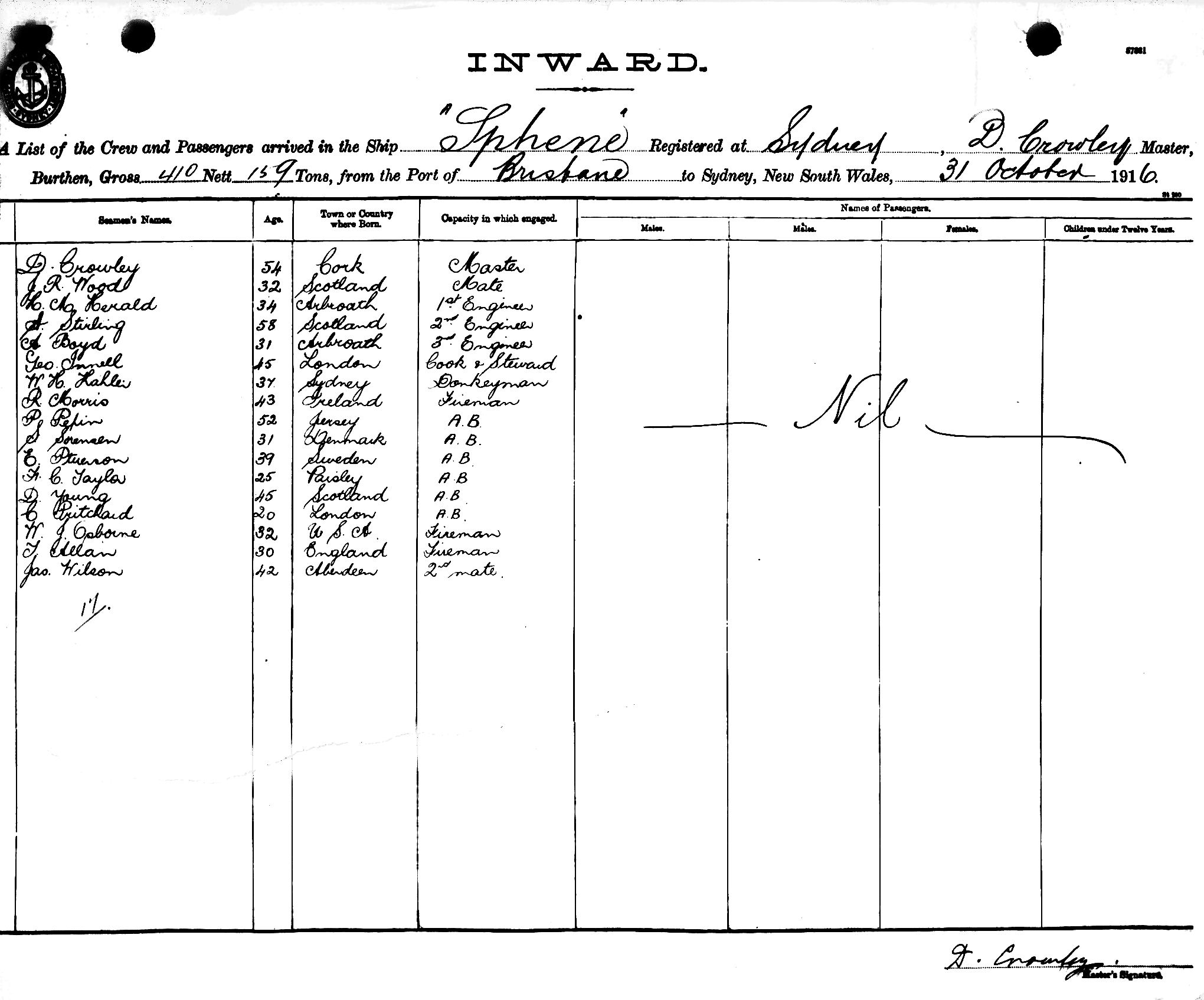 SPHENEOF SYDNEY, D. CROWLEY, MASTER, BURTHEN 410/159 TONS FROM THE PORT OF BRISBANE TO SYDNEY, NEW SOUTH WALES, 31ST OCTOBER 1916 |