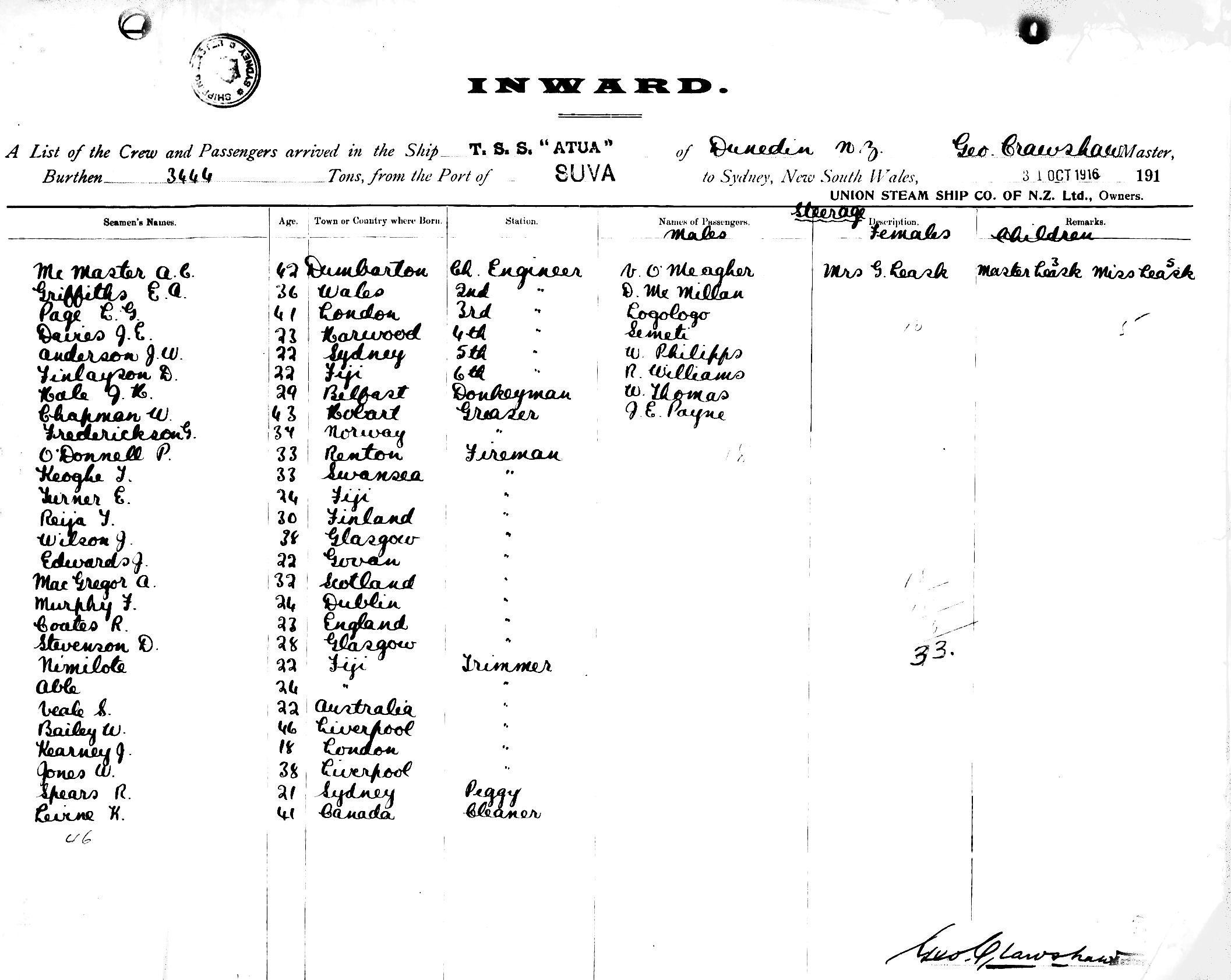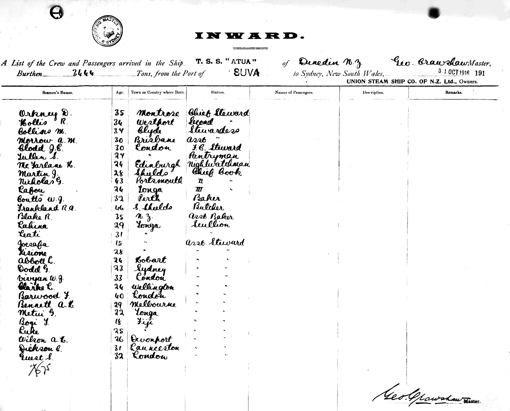 ATUAOF DUNEDIN, GEORGE CRAWSHAW, MASTER, BURTHEN 3444 TONS FROM THE PORT OF SUVA TO SYDNEY, NEW SOUTH WALES, 31ST OCTOBER 1916 |