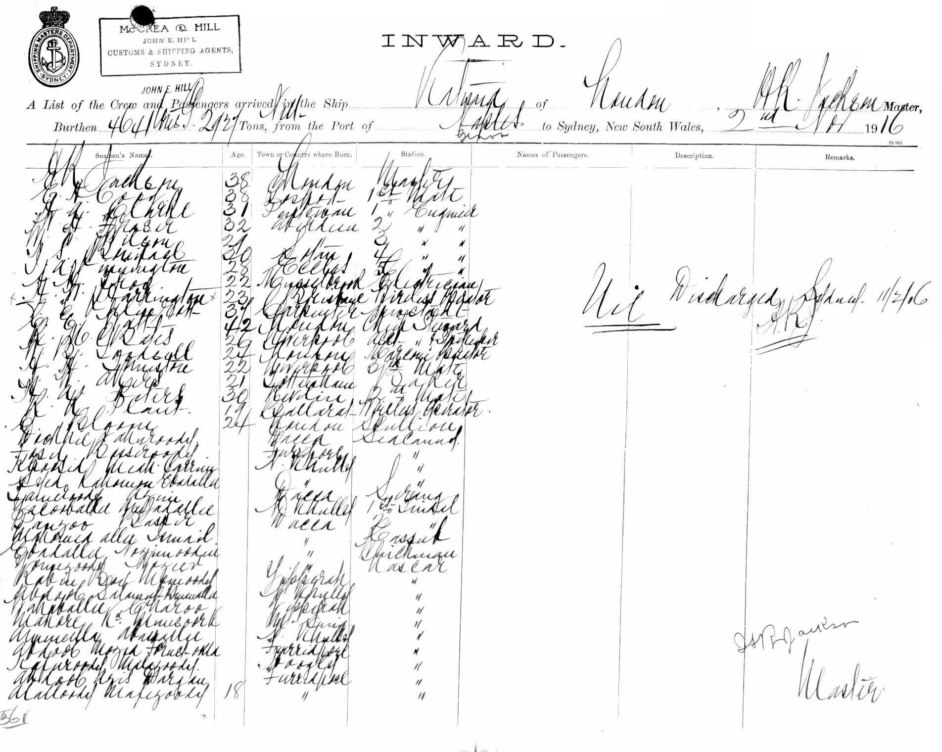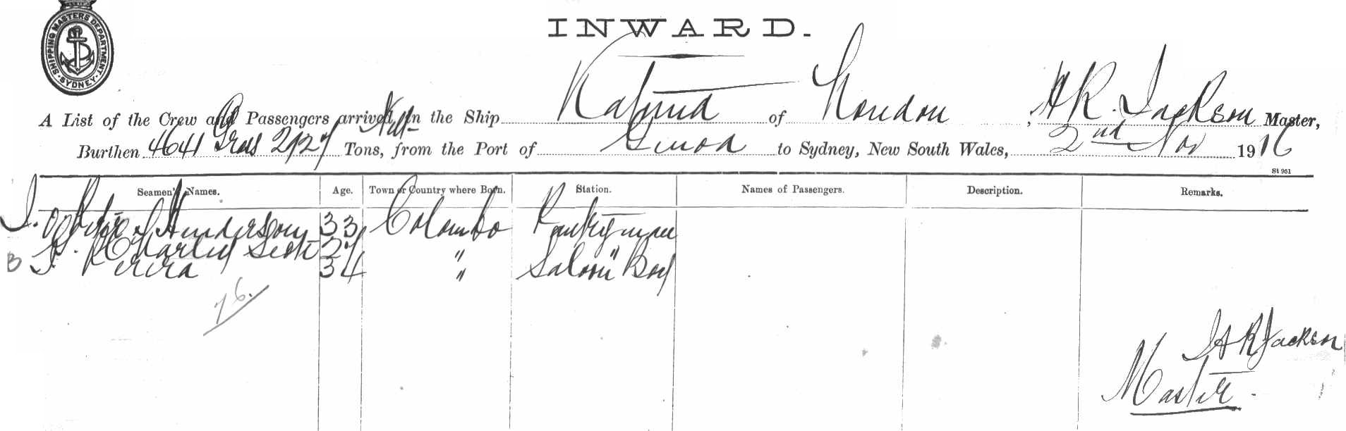 KATUNAOF LONDON, H. R. JACKSON, MASTER, BURTHEN 4641/2927 TONS FROM THE PORTS OF NAPLES & GENOA TO SYDNEY, NEW SOUTH WALES, 2ND NOVEMBER 1916 |