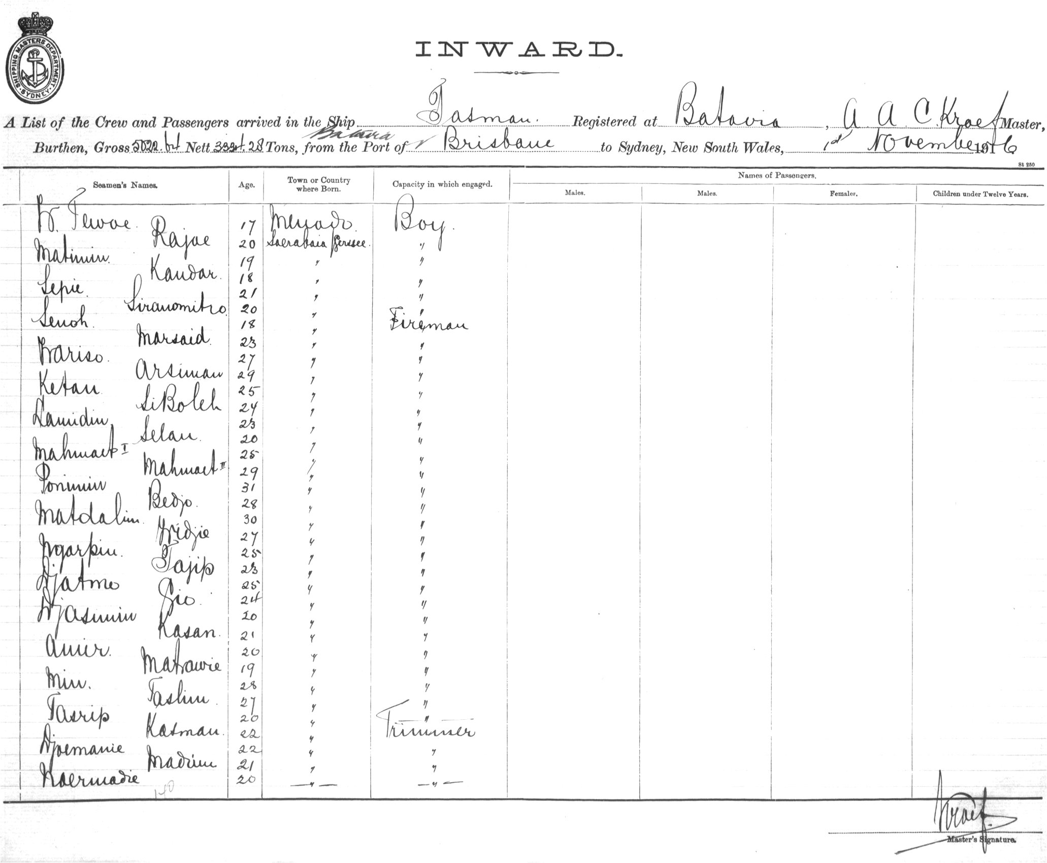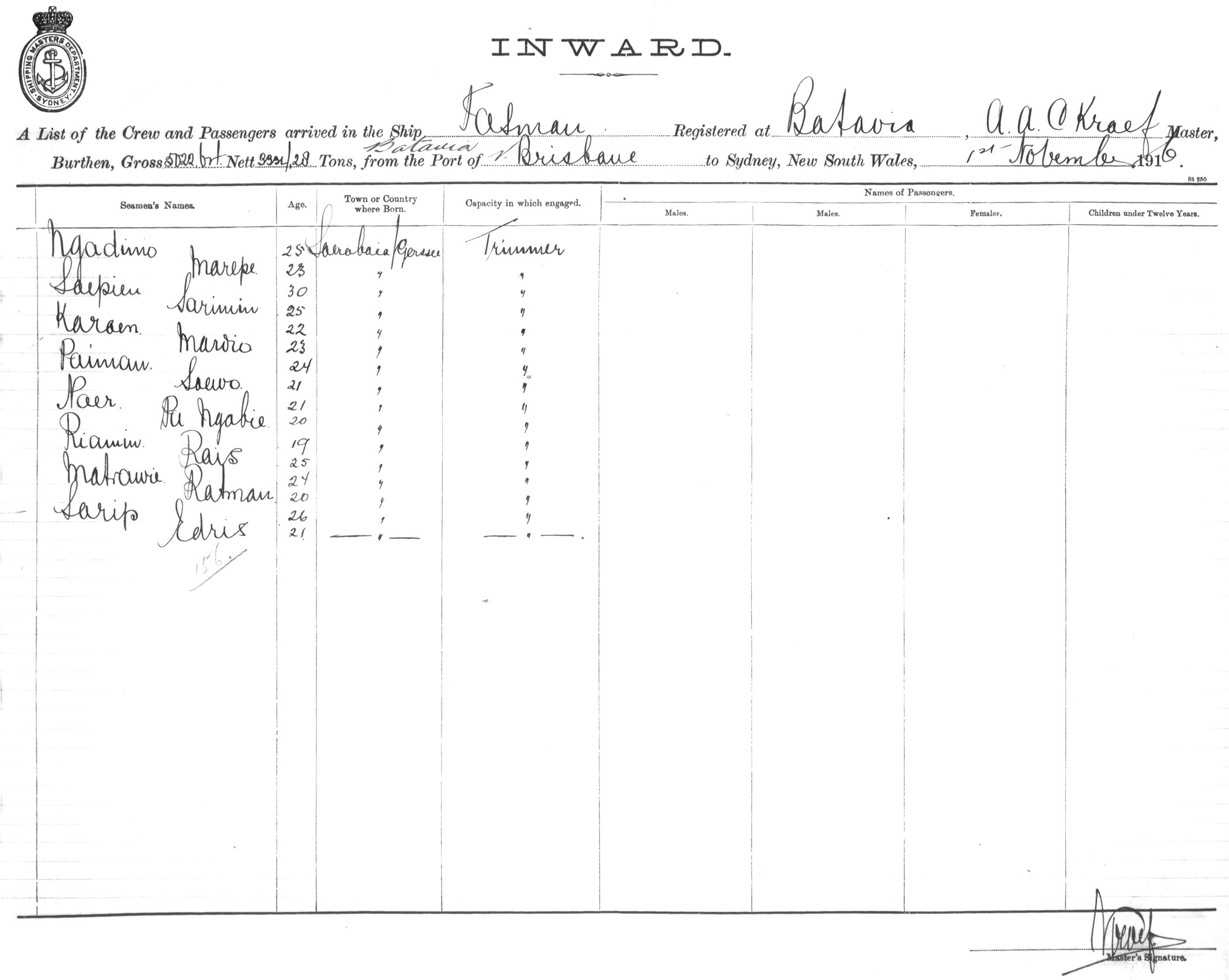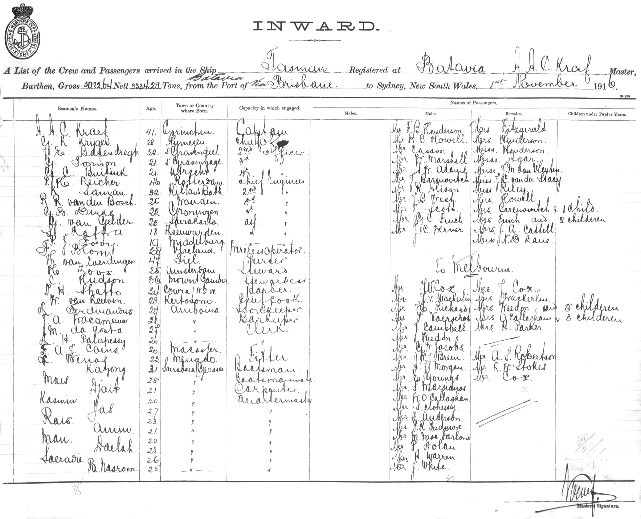 TASMANOF BATAVIA, A.A.C. KROEF, MASTER, BURTHEN 5022/3334 TONS FROM THE PORT OF BATAVIA via BRISBANE TO SYDNEY, NEW SOUTH WALES, 1ST NOVEMBER 1916 |