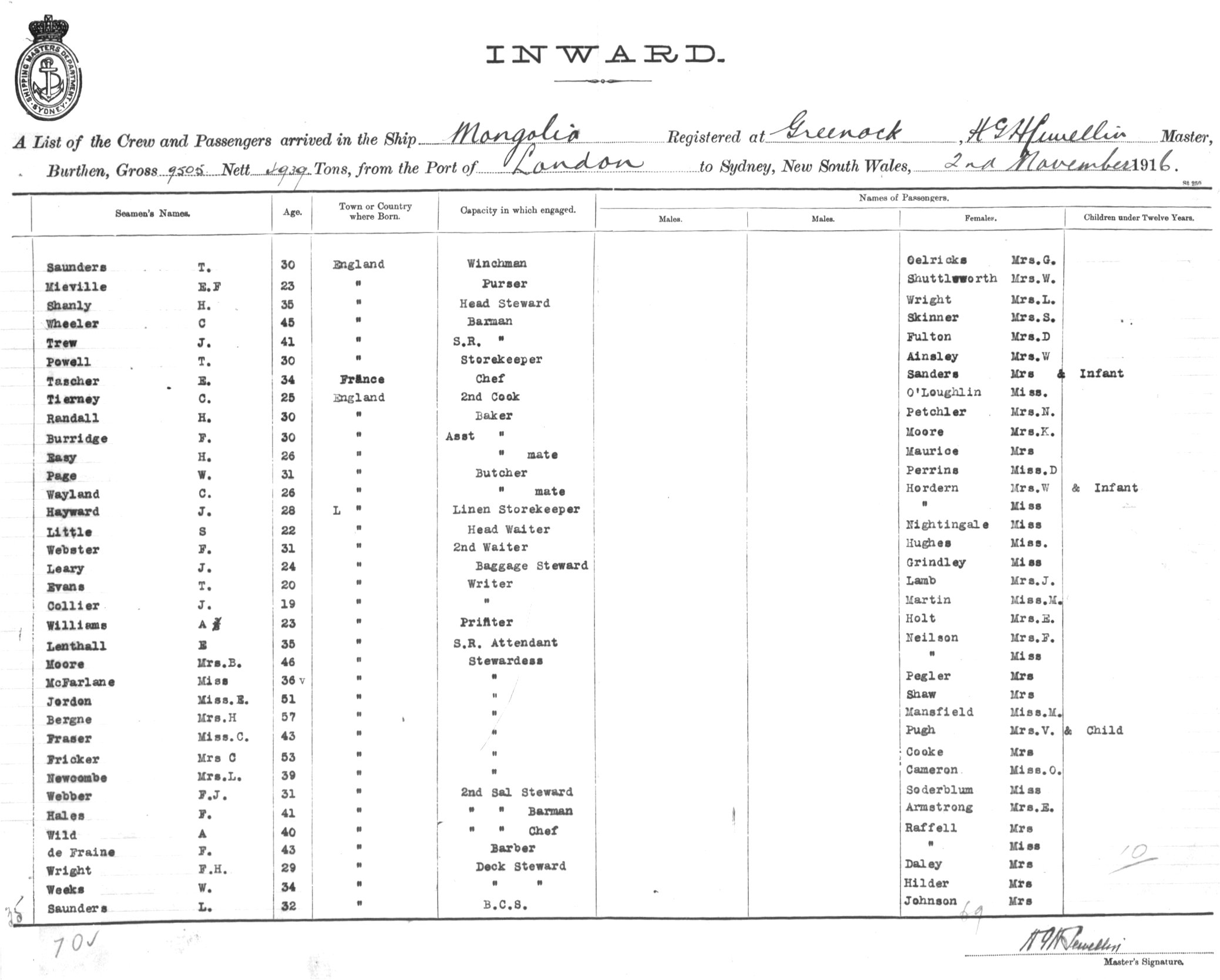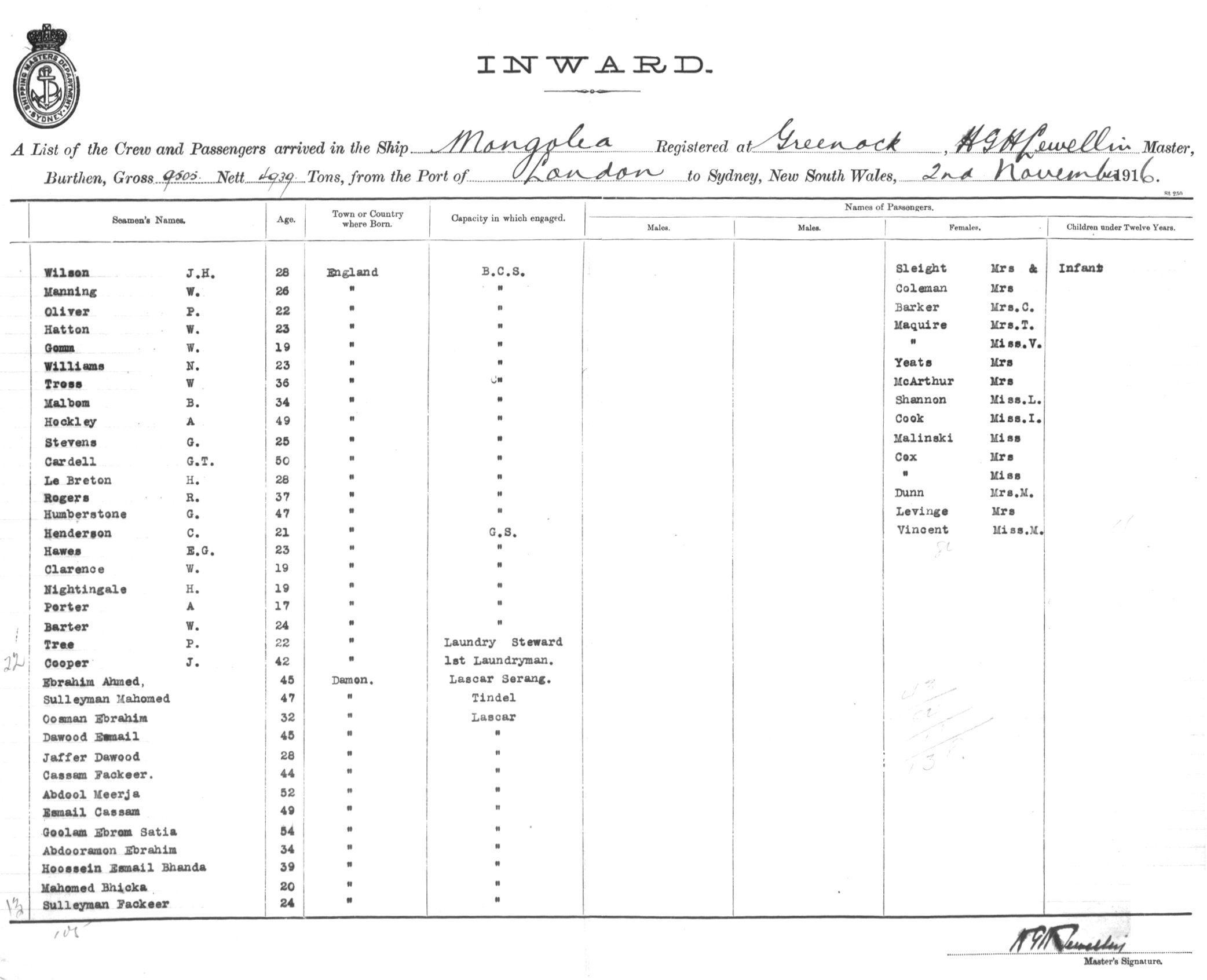 OF GREENOCK, H. G. H. LEWELLIN, MASTER, BURTHEN 9505/4939 TONS FROM THE PORT OF LONDON TO SYDNEY, NEW SOUTH WALES, 2ND NOVEMBER 1916