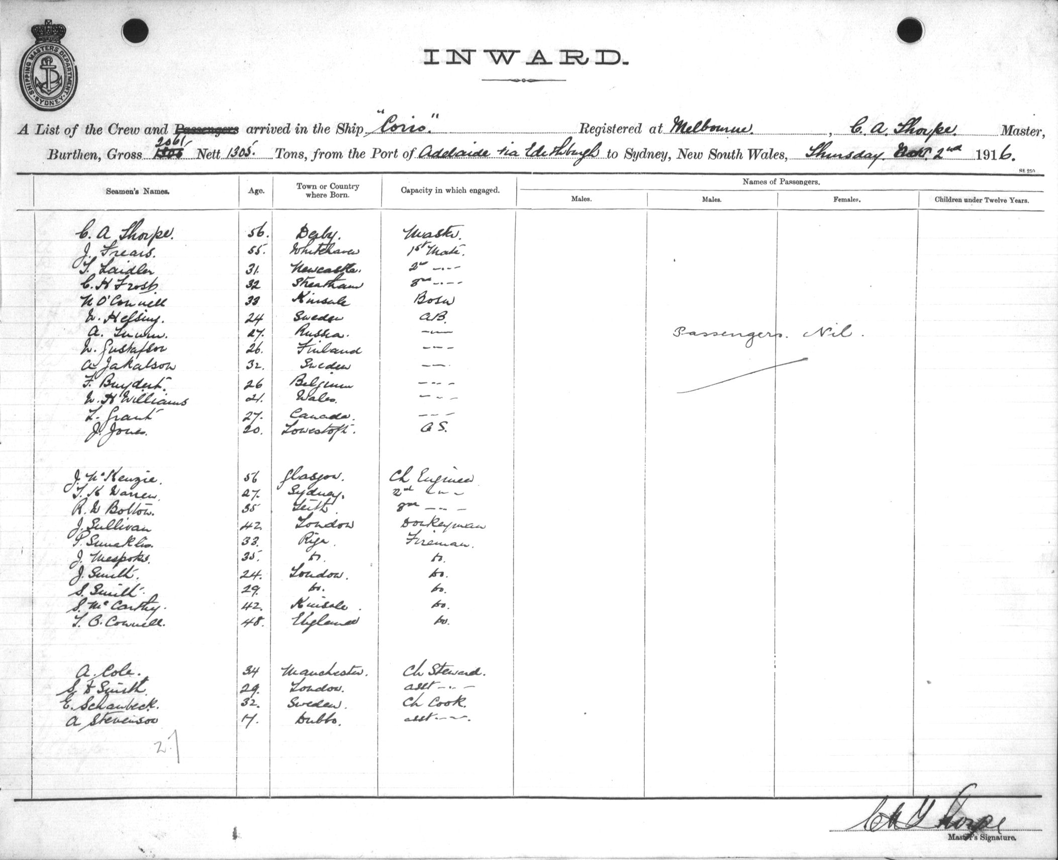 CORIOOF MELBOURNE, C. A. THORPE, MASTER, BURTHEN 2061/1305 TONS FROM THE PORT OF ADELAIDE via EDITHBURGH TO SYDNEY, NEW SOUTH WALES, 2ND NOVEMBER 1916 |