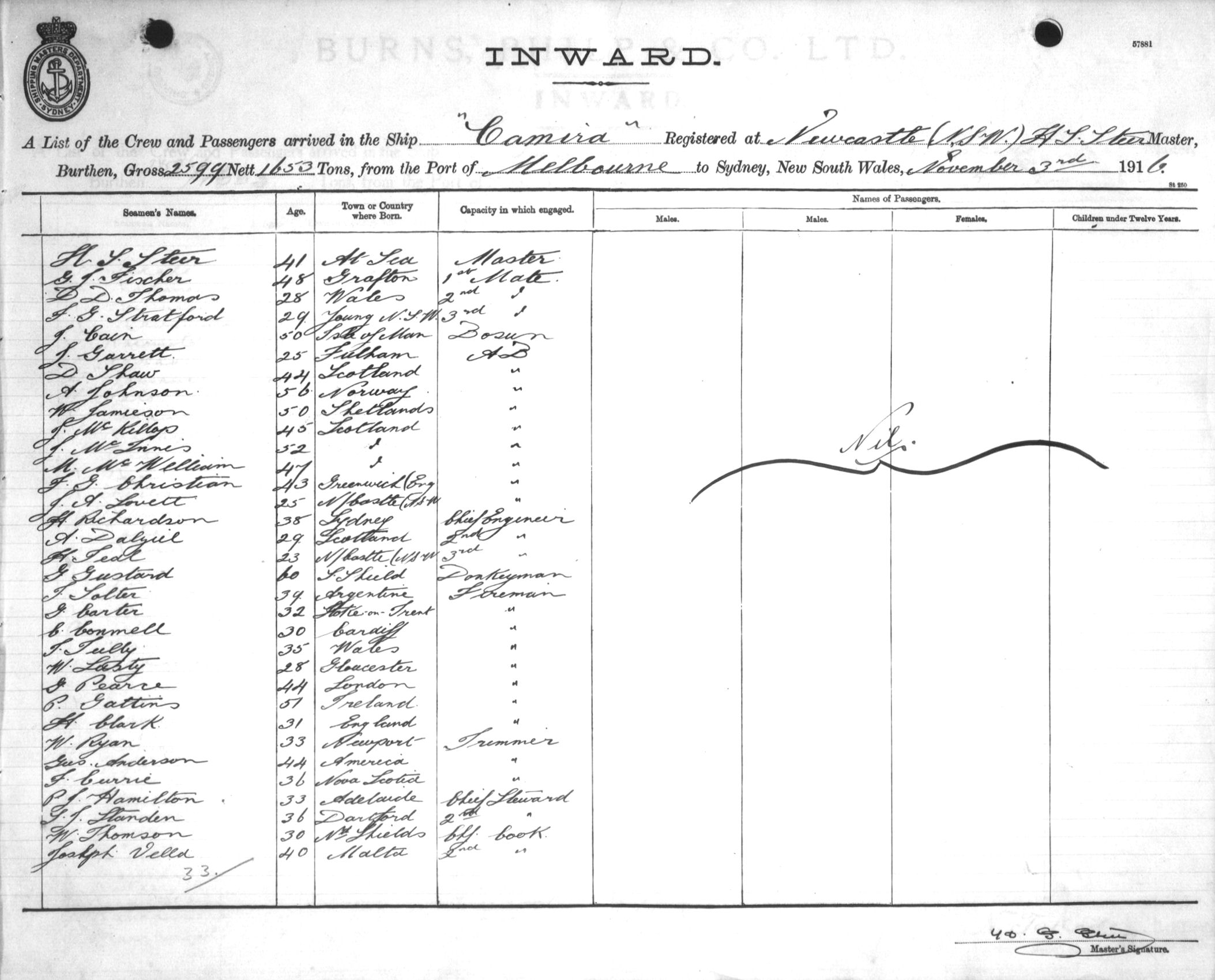 Mariners and ships in Australian Waters | CAMIRAOF NEWCASTLE, N.S.W., H. S. STEER, MASTER, BURTHEN 2599/1653 TONS FROM THE PORT OF MELBOURNE TO SYDNEY, NEW SOUTH WALES, 3RD NOVEMBER 1916 |