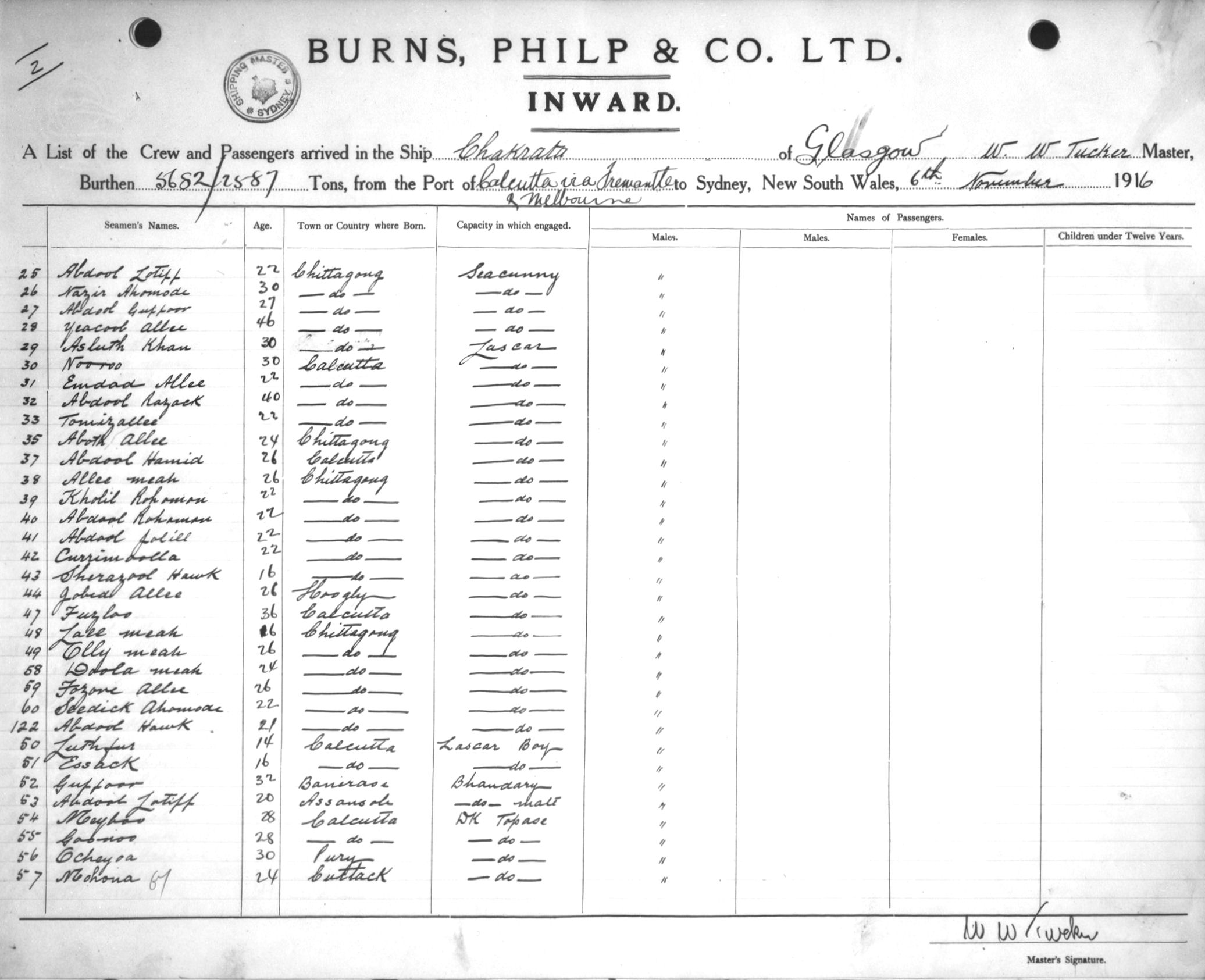 CHAKRATAOF GLASGOW, W. W. TUCKER, MASTER, BURTHEN 5682/2587 TONS FROM THE PORT OF CALCUTTA via FREMANTLE & MELBOURNE TO SYDNEY, NEW SOUTH WALES, 6TH NOVEMBER 1916 |