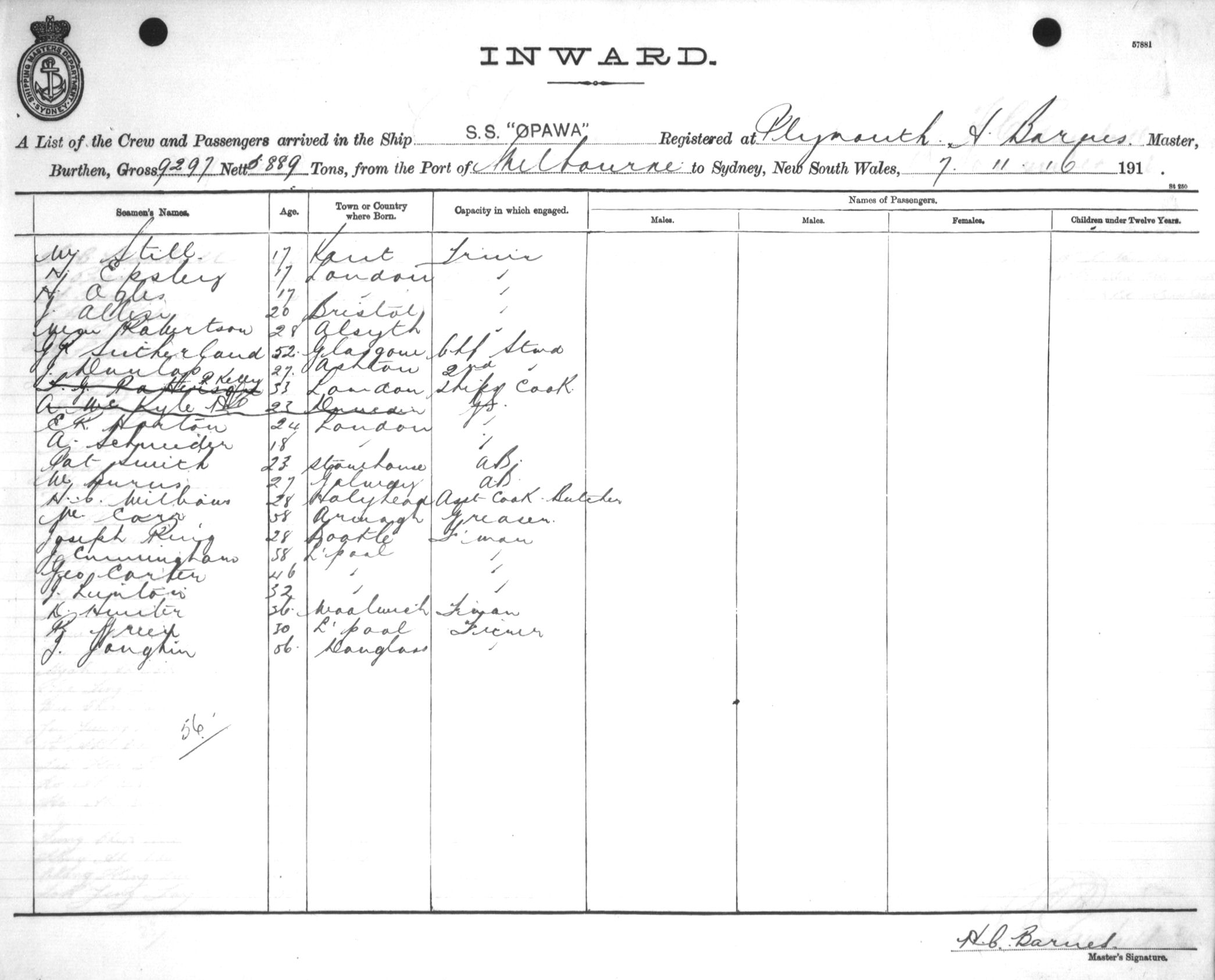 OPAWAOF PLYMOUTH, H. BARNES, MASTER, BURTHEN 9297/5889 TONS FROM THE PORT OF MELBOURNE TO SYDNEY, NEW SOUTH WALES, 7TH NOVEMBER 1916 |