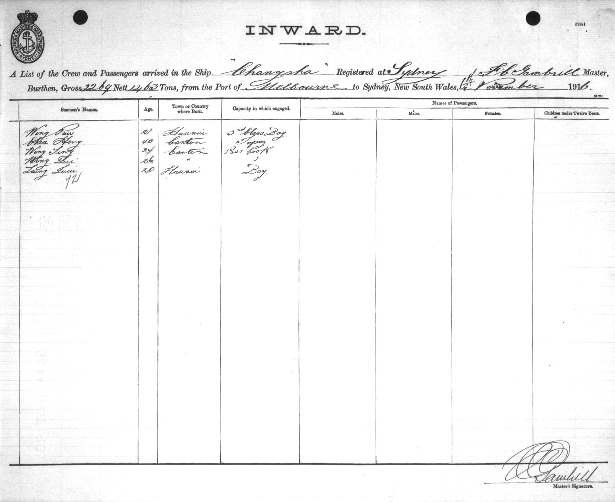 CHANGSHAOF SYDNEY, F. C. GAMBRILL, MASTER, BURTHEN 2269/1463 TONS FROM THE PORT OF MELBOURNE TO SYDNEY, NEW SOUTH WALES, 6TH NOVEMBER 1916 |
