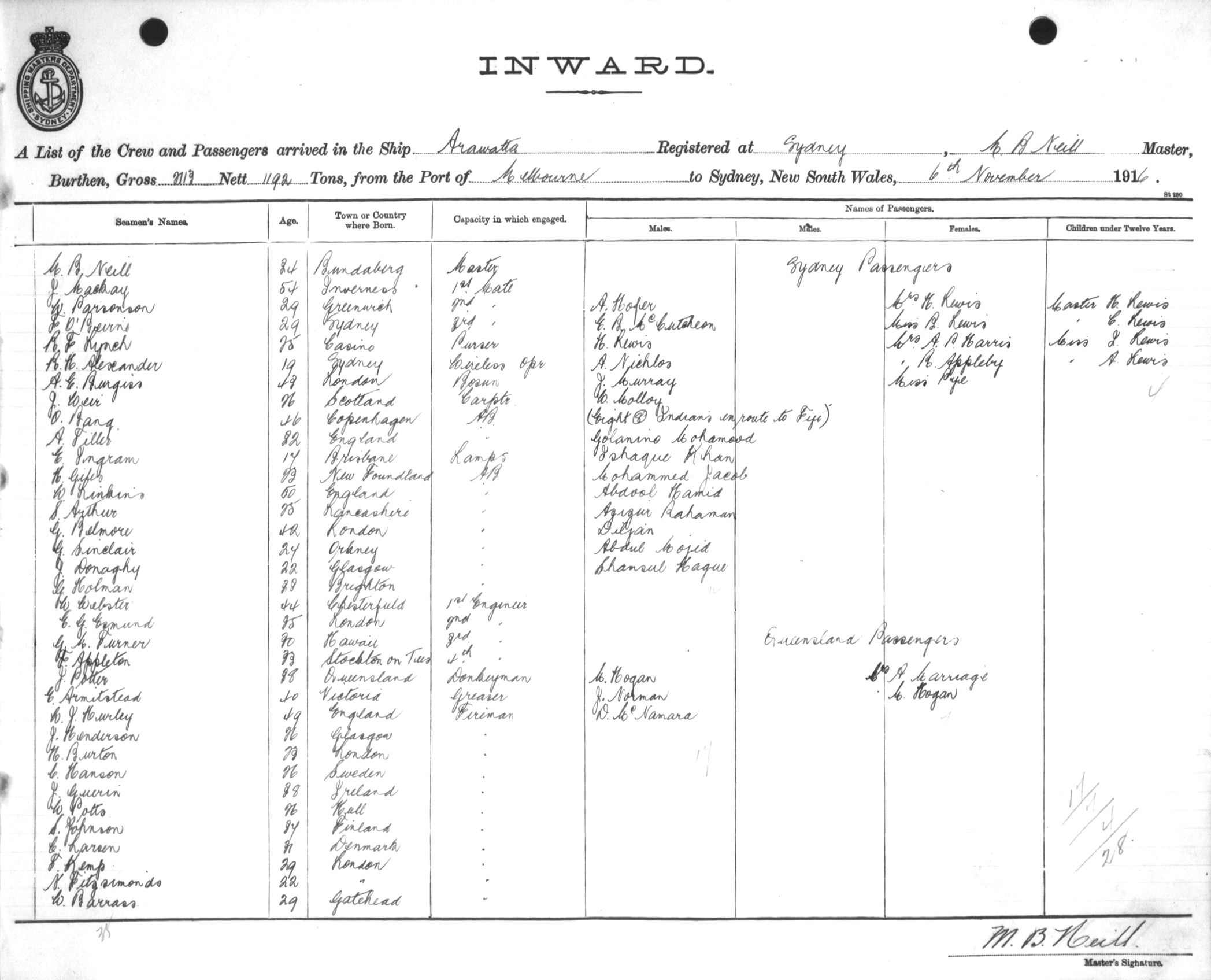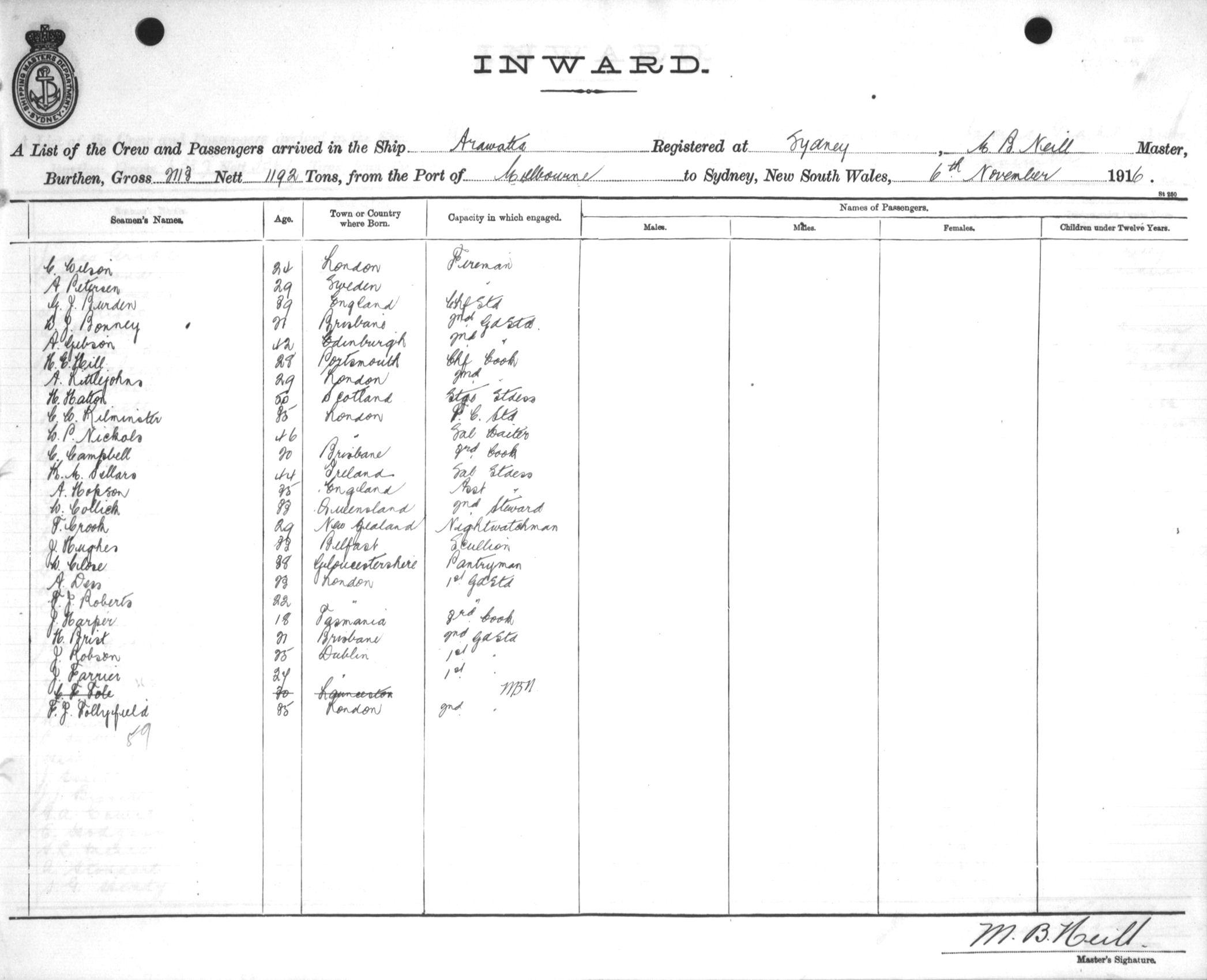 ARAWATTAOF SYDNEY, M. B. NEILL, MASTER, BURTHEN 2113/1192 TONS FROM THE PORT OF MELBOURNE TO SYDNEY, NEW SOUTH WALES, 6TH NOVEMBER 1916 |