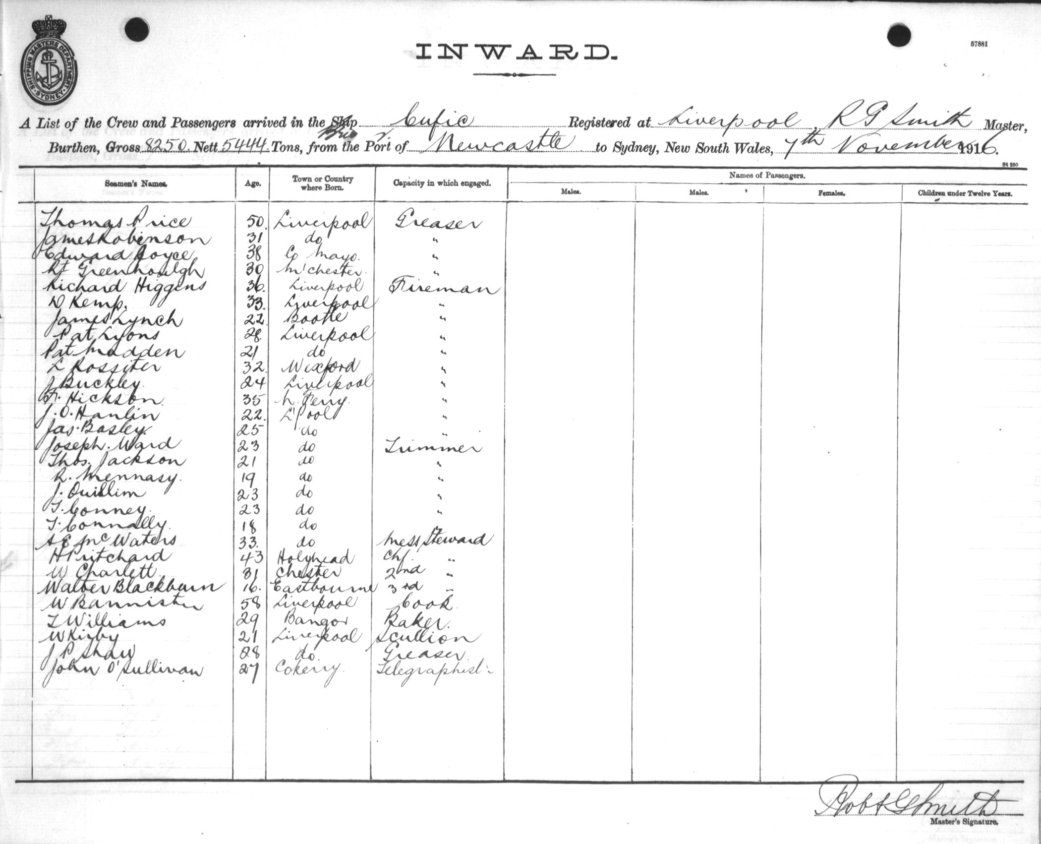 Mariners and ships in Australian Waters | CUFICOF LIVERPOOL, R. G. SMITH, MASTER, BURTHEN 8250/5444 TONS FROM THE PORT OF BRISBANE via NEWCASTLE TO SYDNEY, NEW SOUTH WALES, 9TH NOVEMBER 1916 |