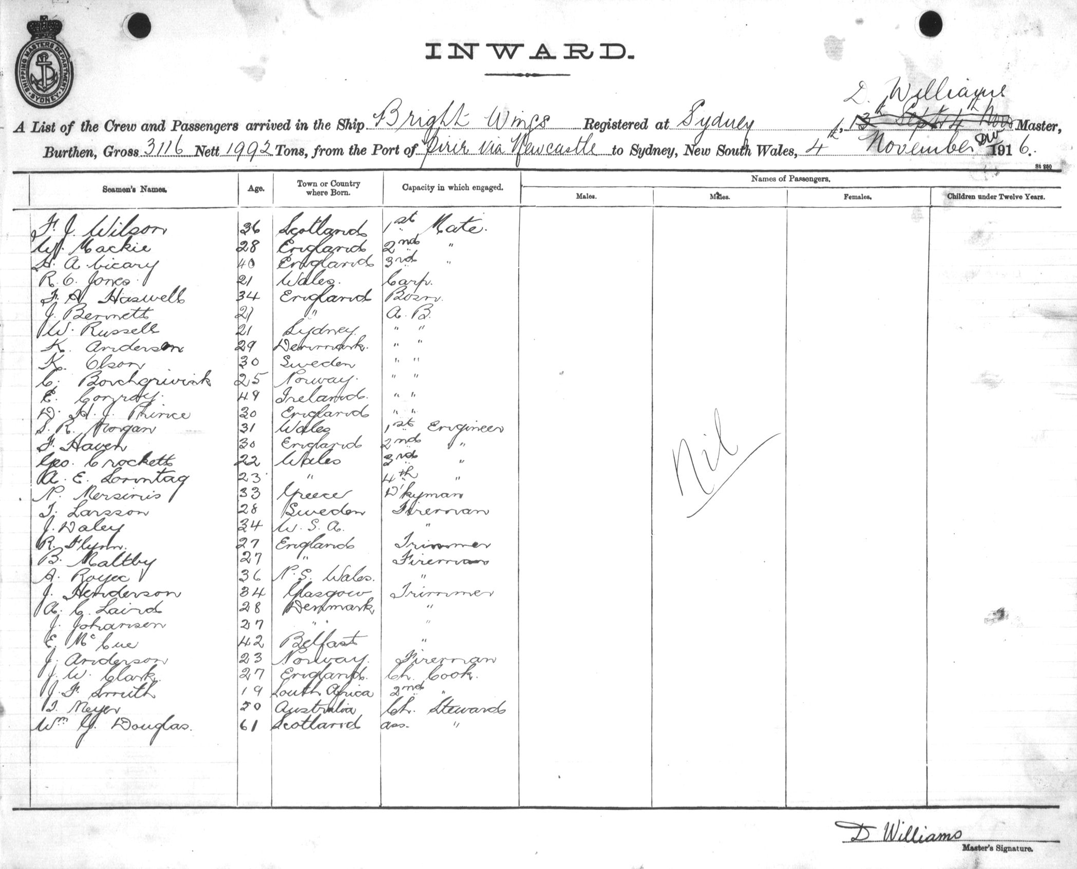 BRIGHT WINGSOF SYDNEY, D. WILLIAMS, MASTER, BURTHEN 3116/1992 TONS FROM THE PORT OF PORT PIRIE via NEWCASTLE TO SYDNEY, NEW SOUTH WALES, 4TH NOVEMBER 1916 |