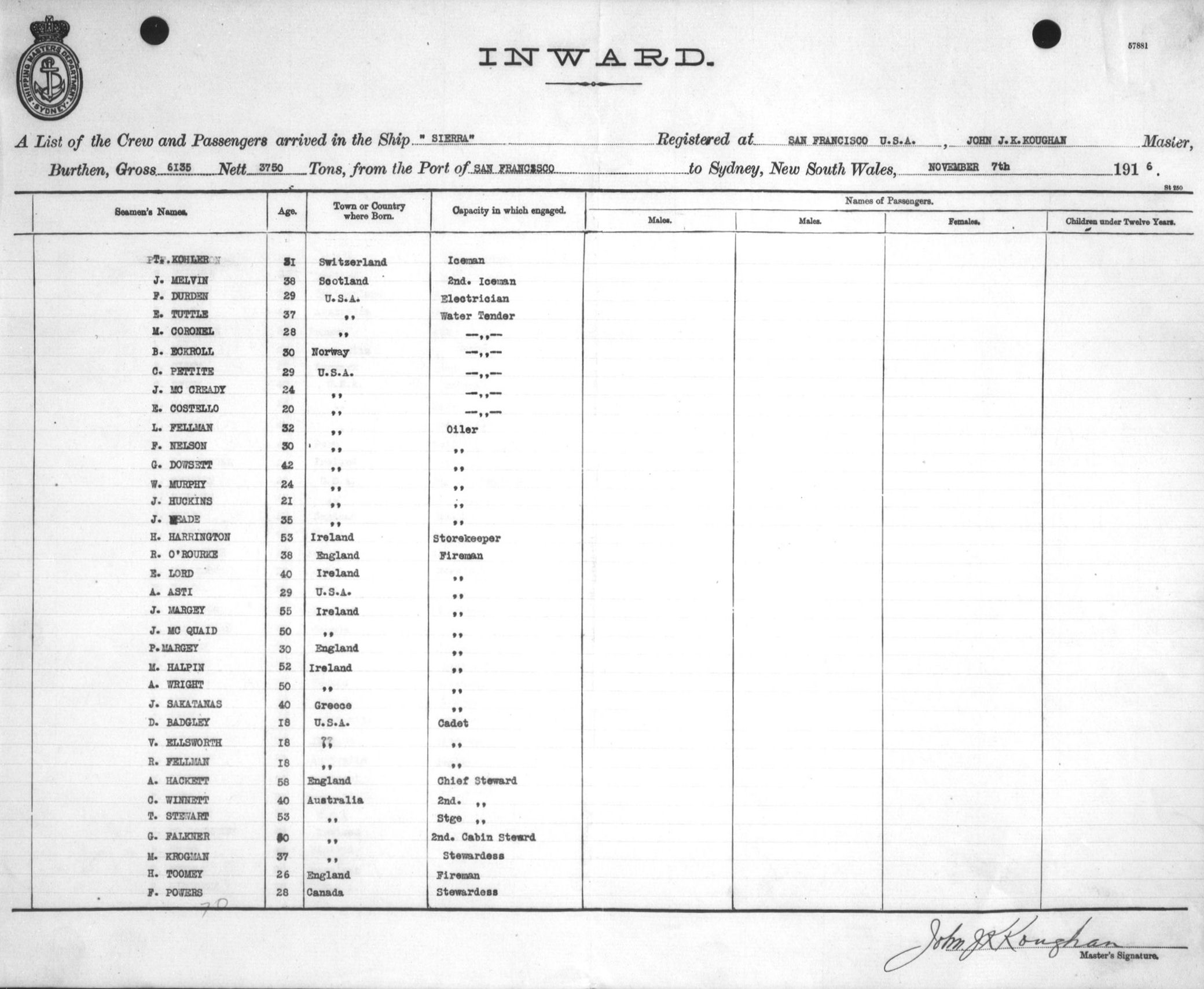 SIERRAOF SAN FRANCISCO, JOHN J. K. KOUGHAN, MASTER, BURTHEN 6155/3750 TONS FROM THE PORT OF SAN FRANCISCO TO SYDNEY, NEW SOUTH WALES, 7TH NOVEMBER 1916 |