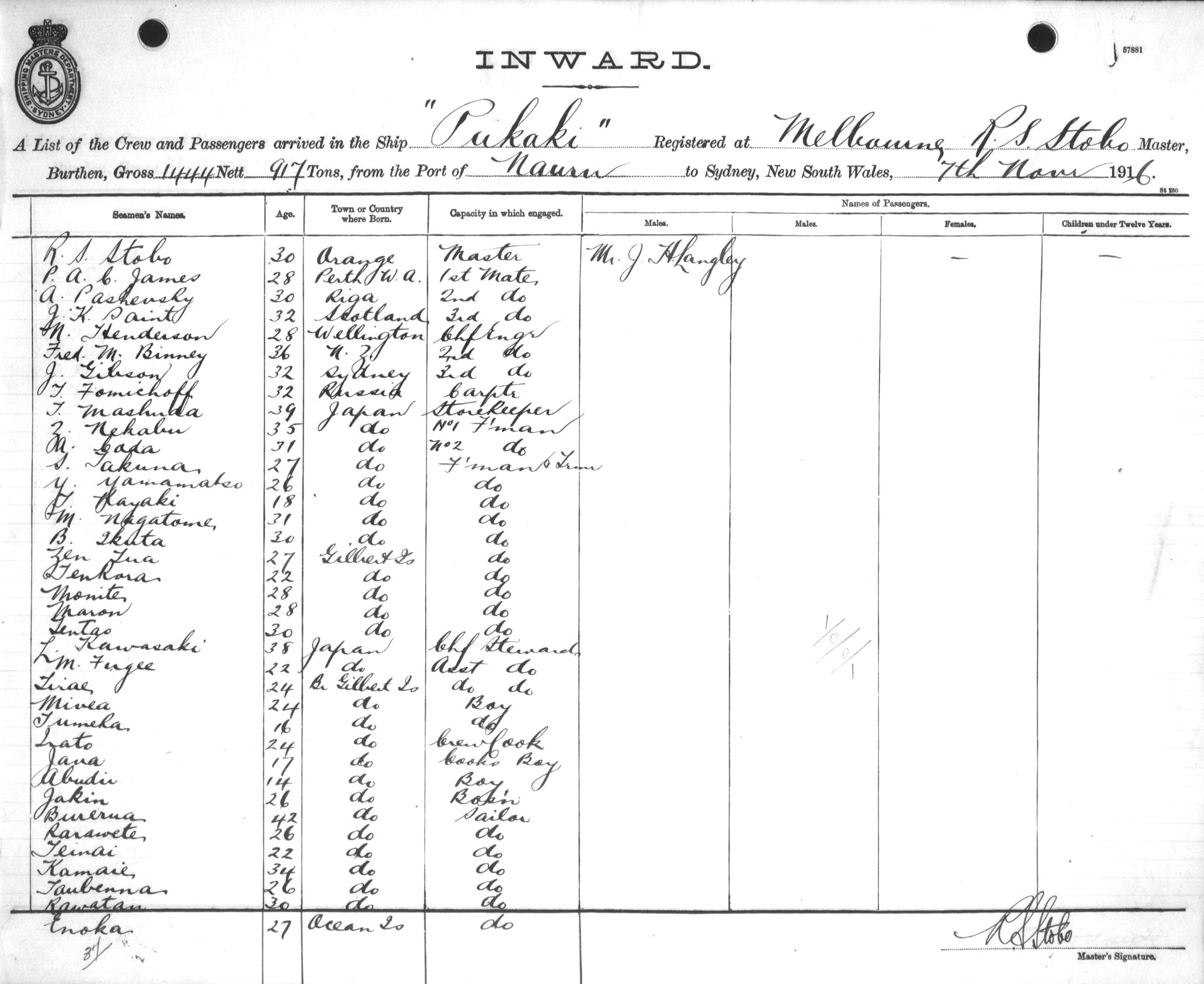 PUKAKIOF MELBOURNE, R. S. STOBO, MASTER, BURTHEN 1444/917 TONS FROM THE PORT OF NAURU TO SYDNEY, NEW SOUTH WALES, 7TH NOVEMBER 1916 |