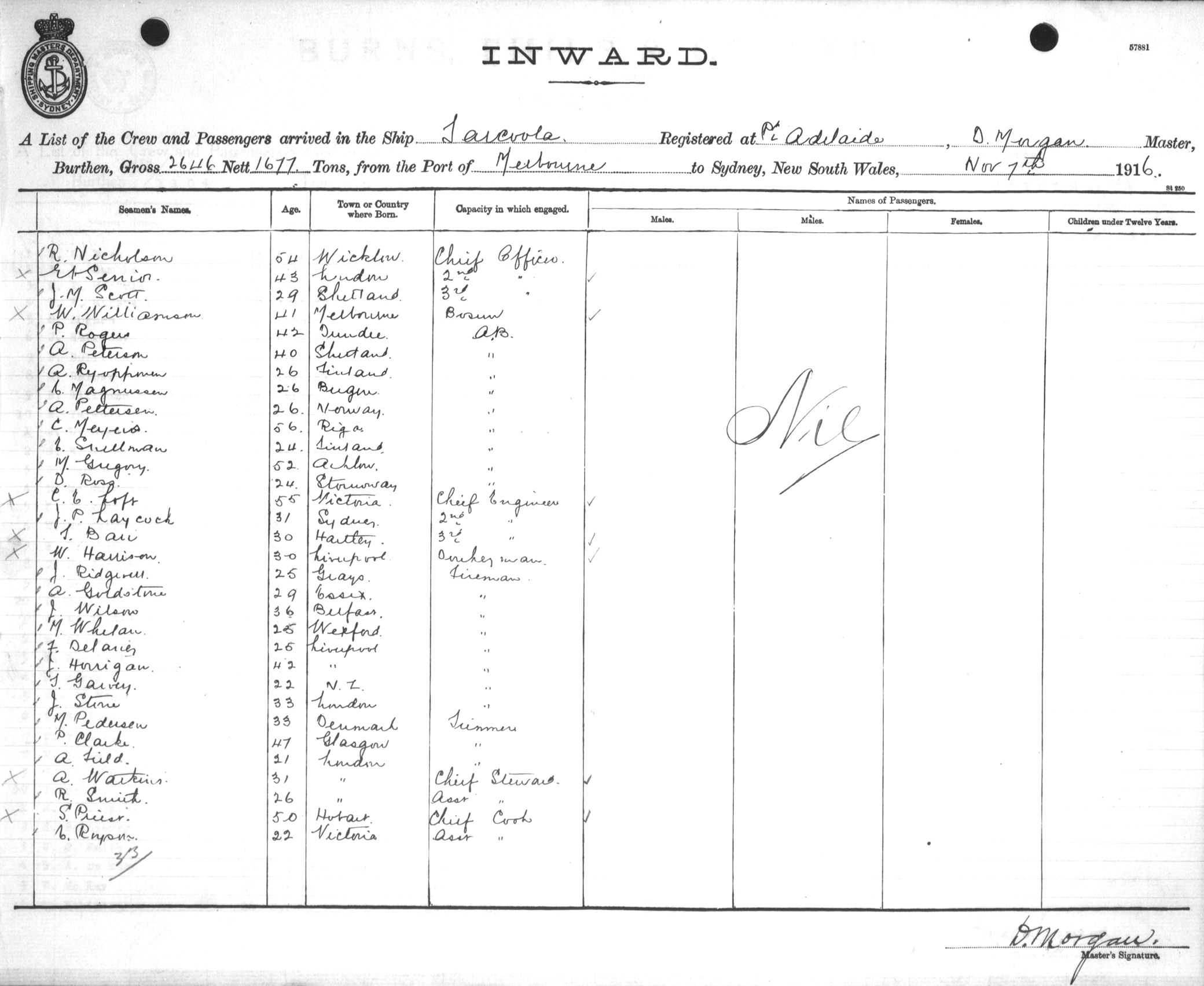 TARCOOLAOF PORT ADELAIDE, D. MORGAN, MASTER, BURTHEN 2646/1677 TONS FROM THE PORT OF MELBOURNE TO SYDNEY, NEW SOUTH WALES, 7TH NOVEMBER 1916 |