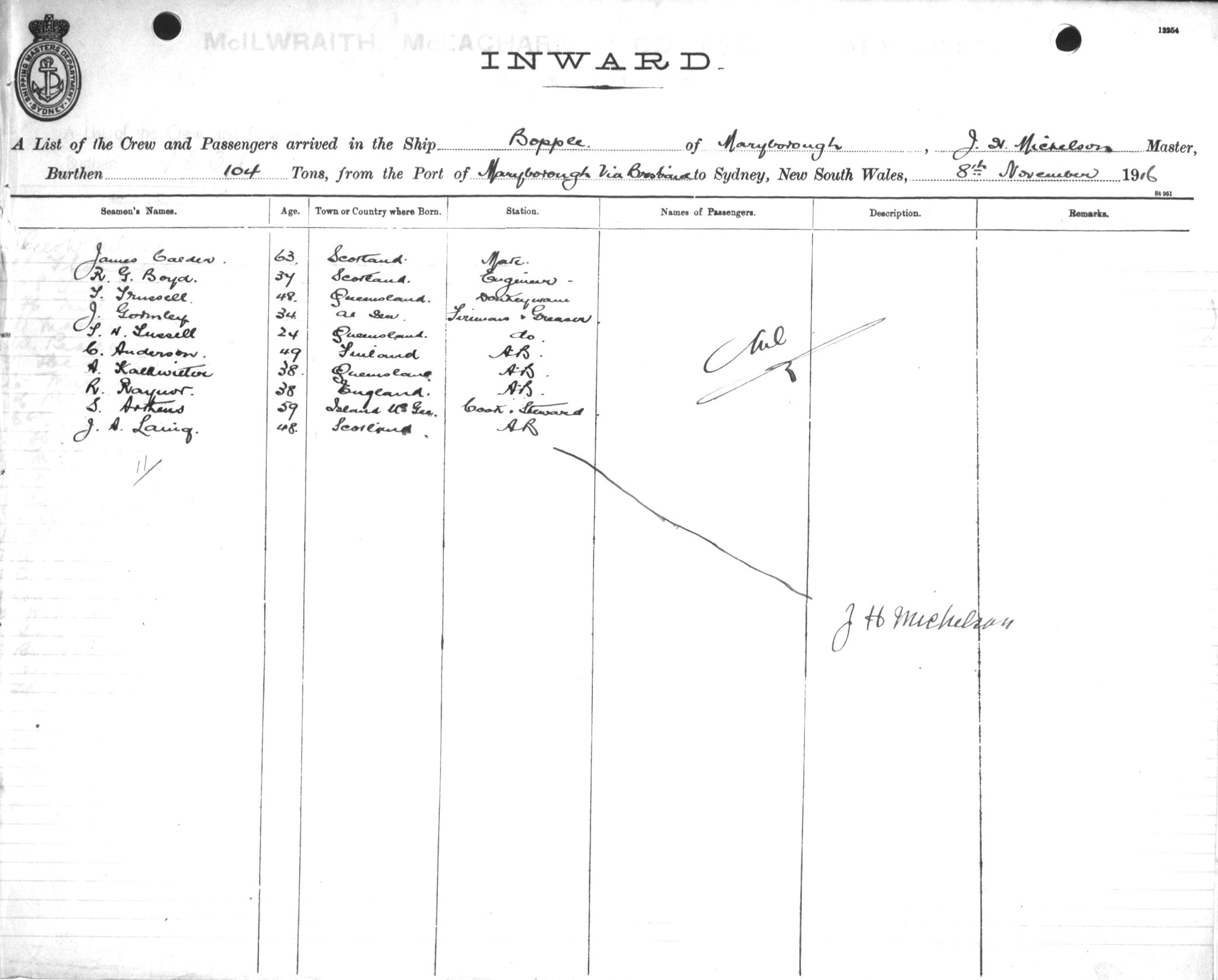BOPPLEOF MARYBOROUGH, J. H. NICHOLSON, MASTER, BURTHEN 104 TONS FROM THE PORT OF MARYBOROUGH via BRISBANE TO SYDNEY, NEW SOUTH WALES, 8TH NOVEMBER 1916 |