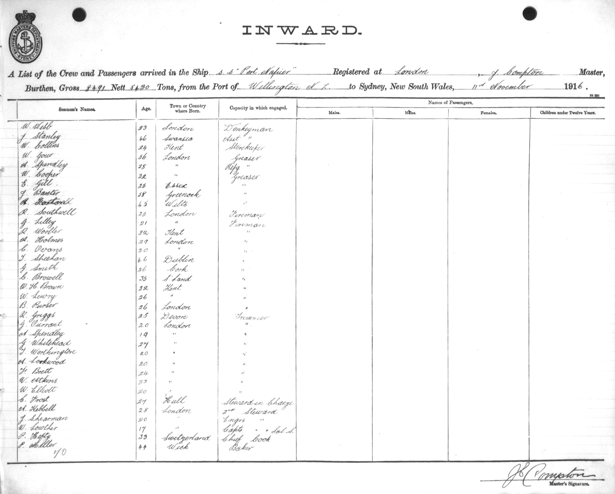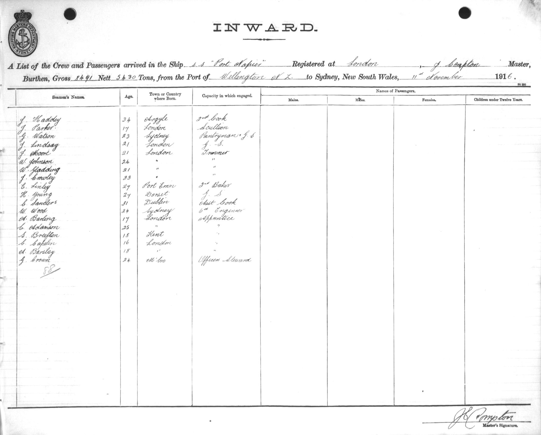 PORT NAPIEROF LONDON, J. COMPTON, MASTER, BURTHEN 8491/5430 TONS FROM THE PORT OF WELLINGTON, N.Z. TO SYDNEY, NEW SOUTH WALES, 11TH NOVEMBER 1916 |