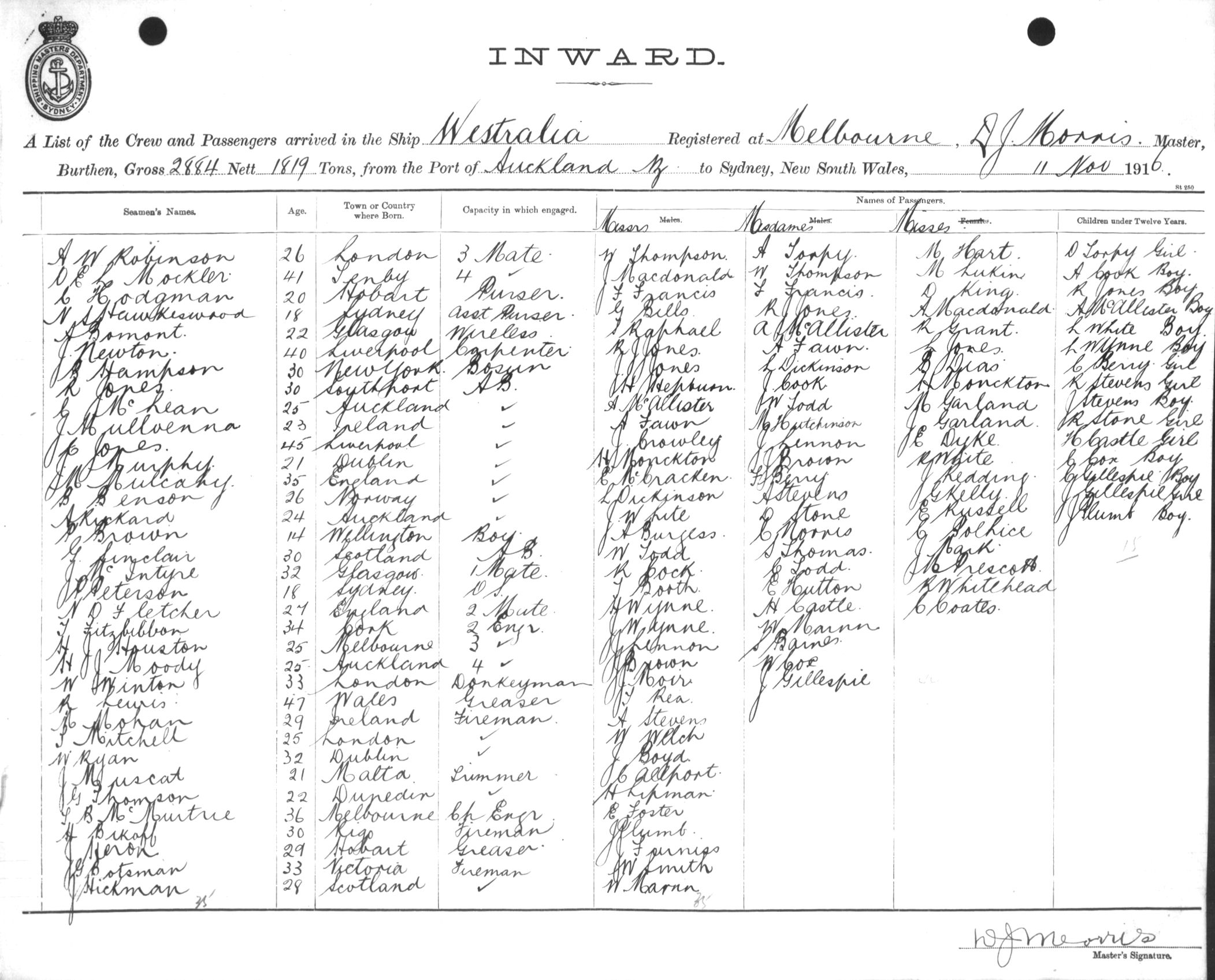 WESTRALIAOF MELBOURNE, D. J. MORRIS, MASTER, BURTHEN 2884/1819 TONS FROM THE PORT OF AUCKLAND TO SYDNEY, NEW SOUTH WALES, 11TH NOVEMBER 1916 |