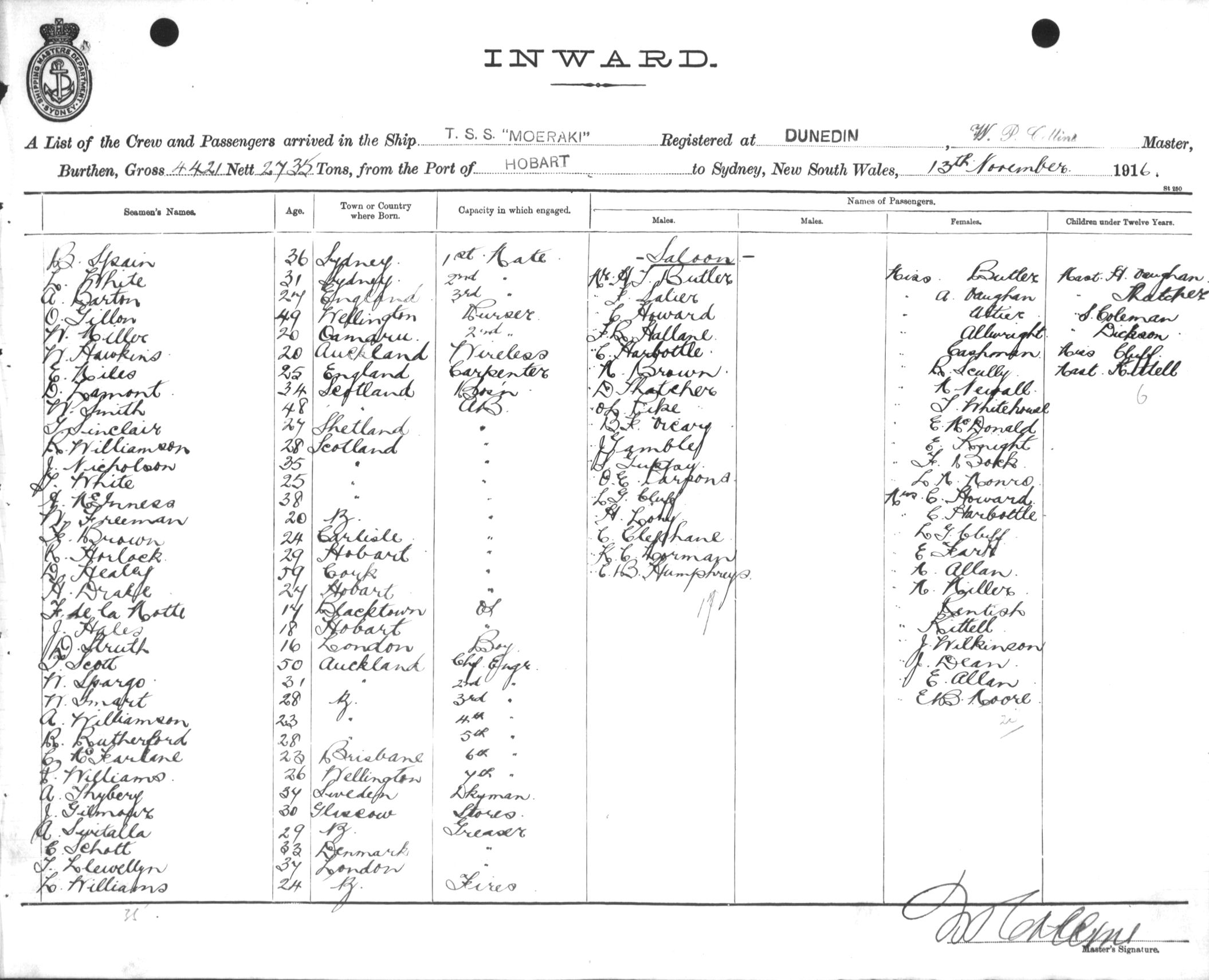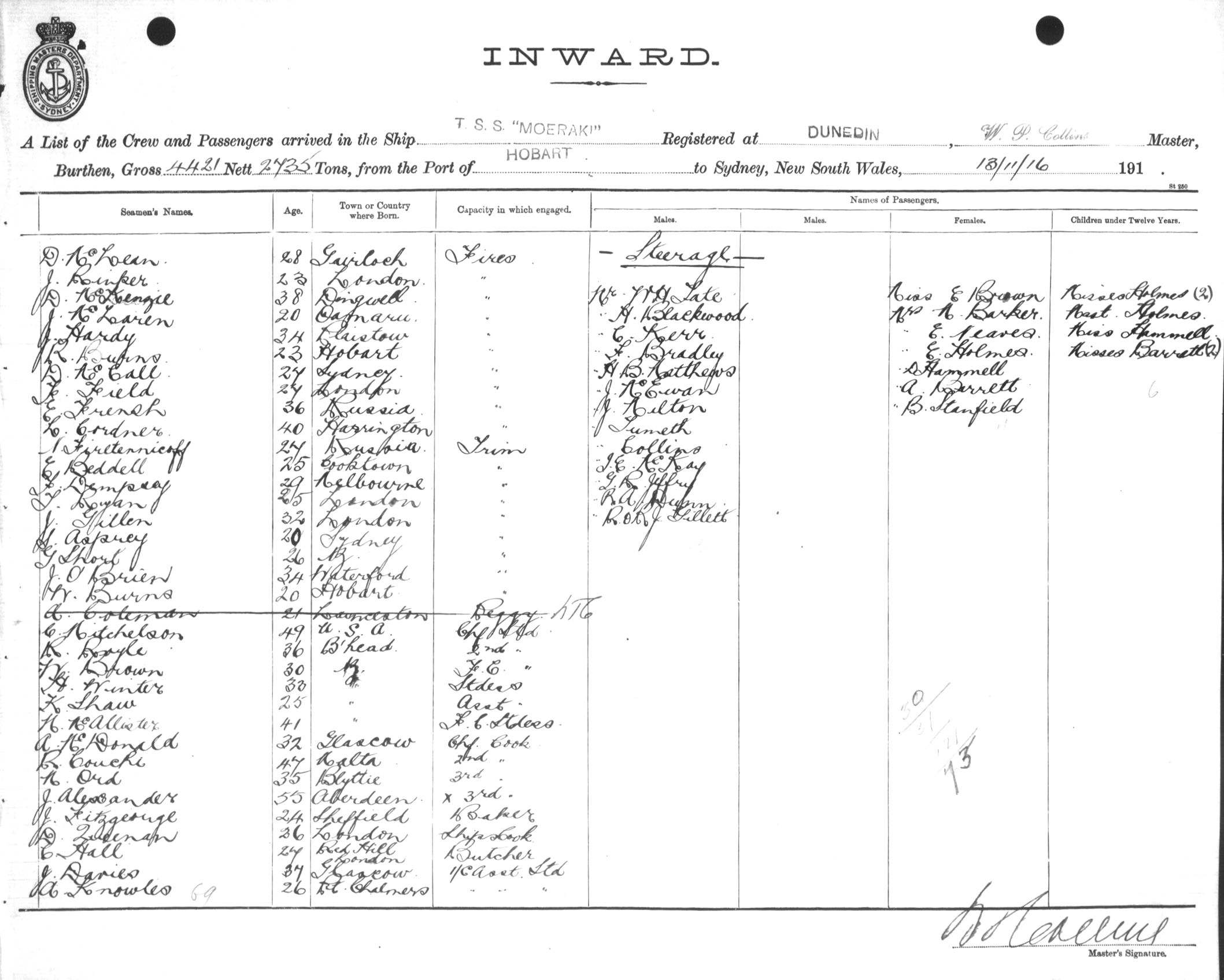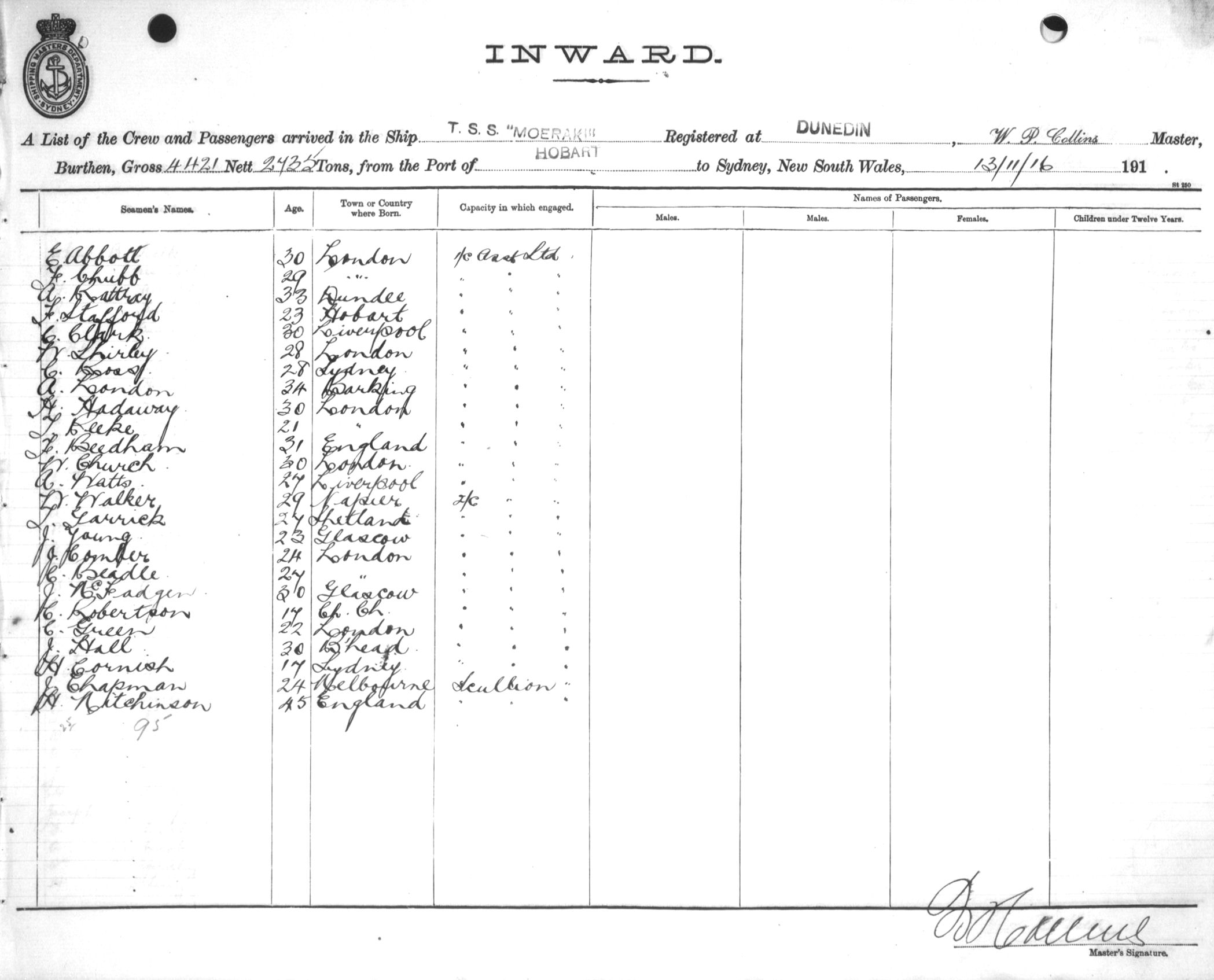 MOERAKIOF DUNEDIN, W. P. COLLINS, MASTER, BURTHEN 4421/2735 TONS FROM THE PORT OF HOBART TO SYDNEY, NEW SOUTH WALES, 13TH NOVEMBER 1916 |