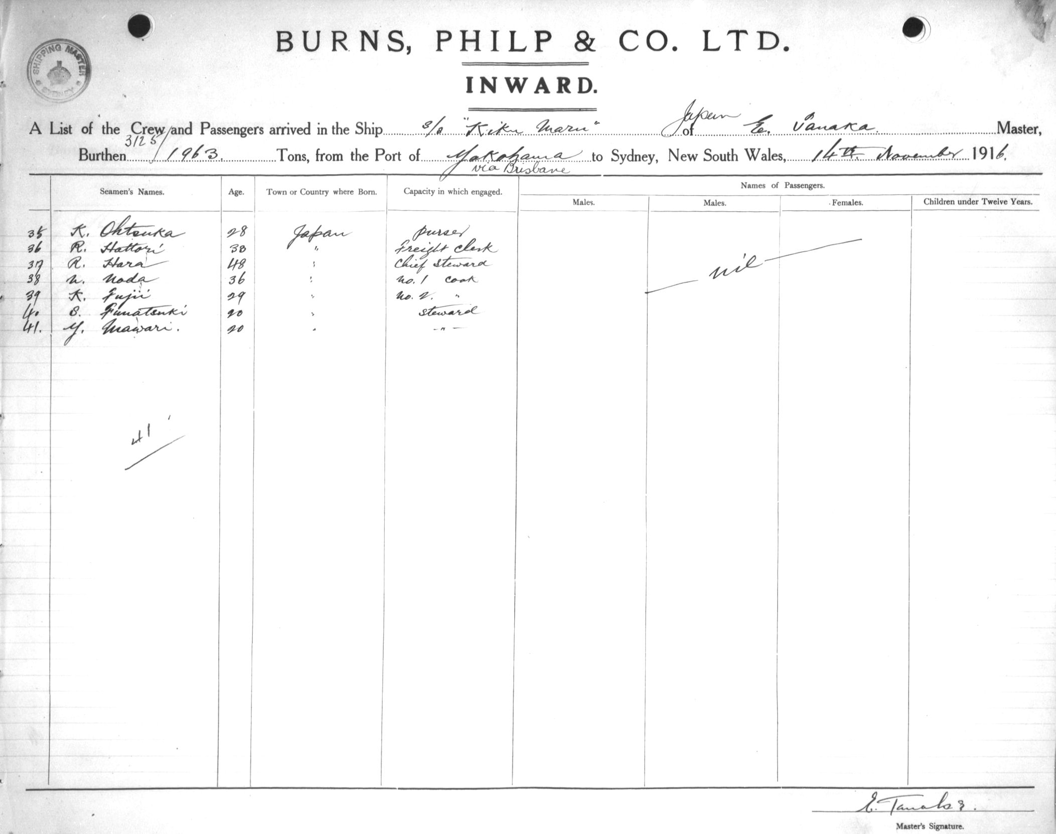 KIKU MARUOF JAPAN, E. TANAKA, MASTER, BURTHEN 3125/1963 TONS FROM THE PORT OF YOKOHAMA & PORTS via BRISBANE TO SYDNEY, NEW SOUTH WALES, 14TH NOVEMBER 1916 |