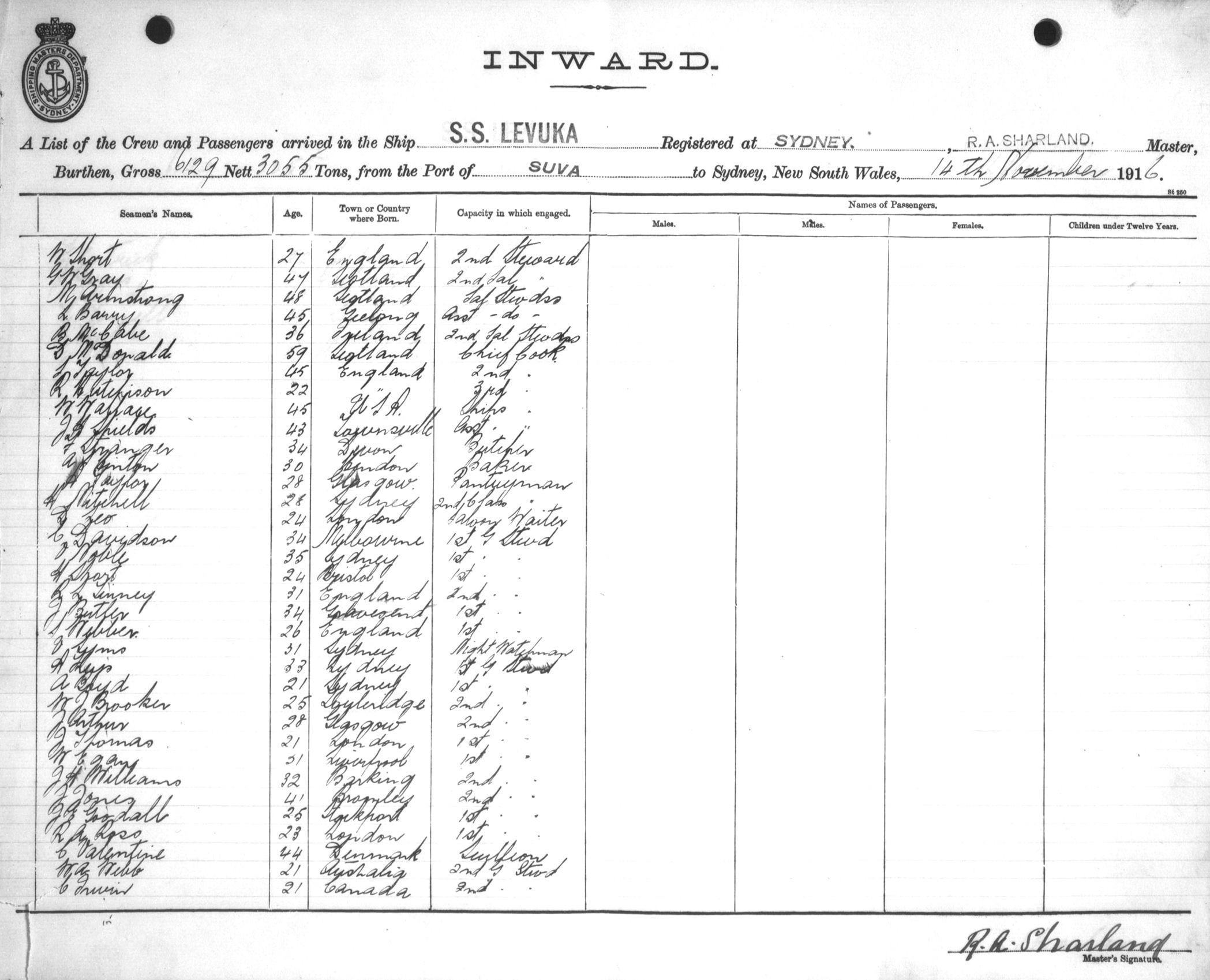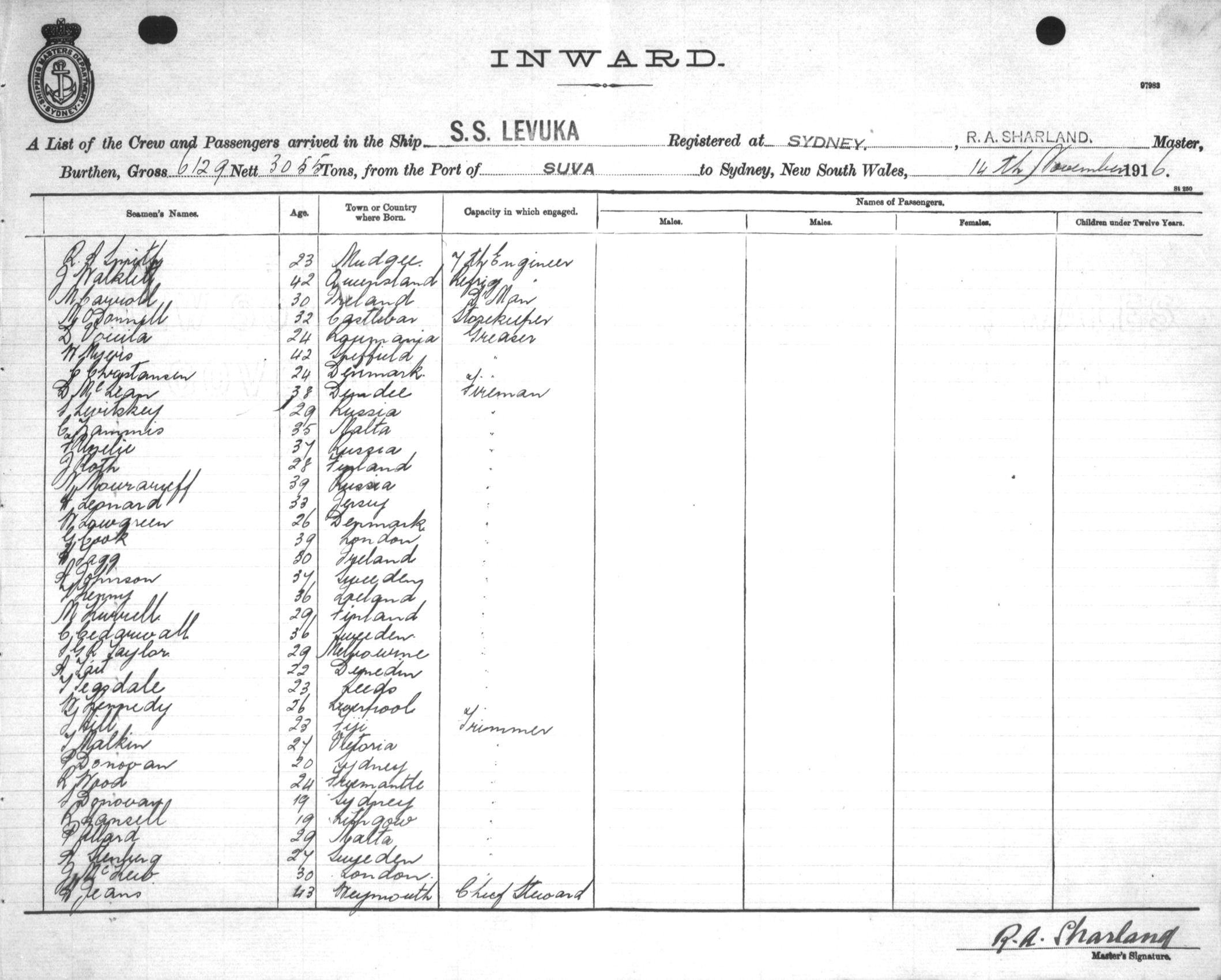 LEVUKAOF SYDNEY, R. A. SHARLAND, MASTER, BURTHEN 6129/3055 TONS FROM THE PORT OF SUVA TO SYDNEY, NEW SOUTH WALES, 14TH NOVEMBER 1916 |
