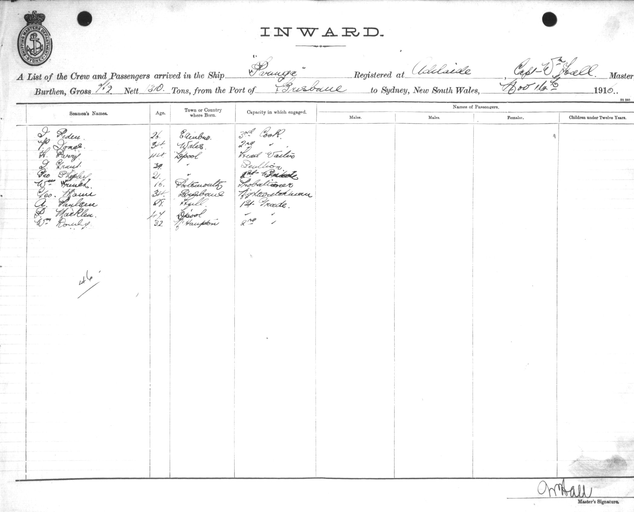 PARINGAOF ADELAIDE, WILLIAM HALL, MASTER, BURTHEN 1310/712 TONS FROM THE PORT OF BRISBANE TO SYDNEY, NEW SOUTH WALES, 16TH NOVEMBER 1916 |