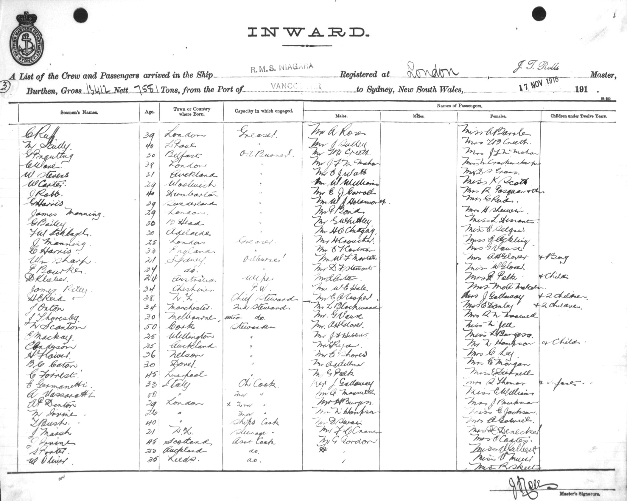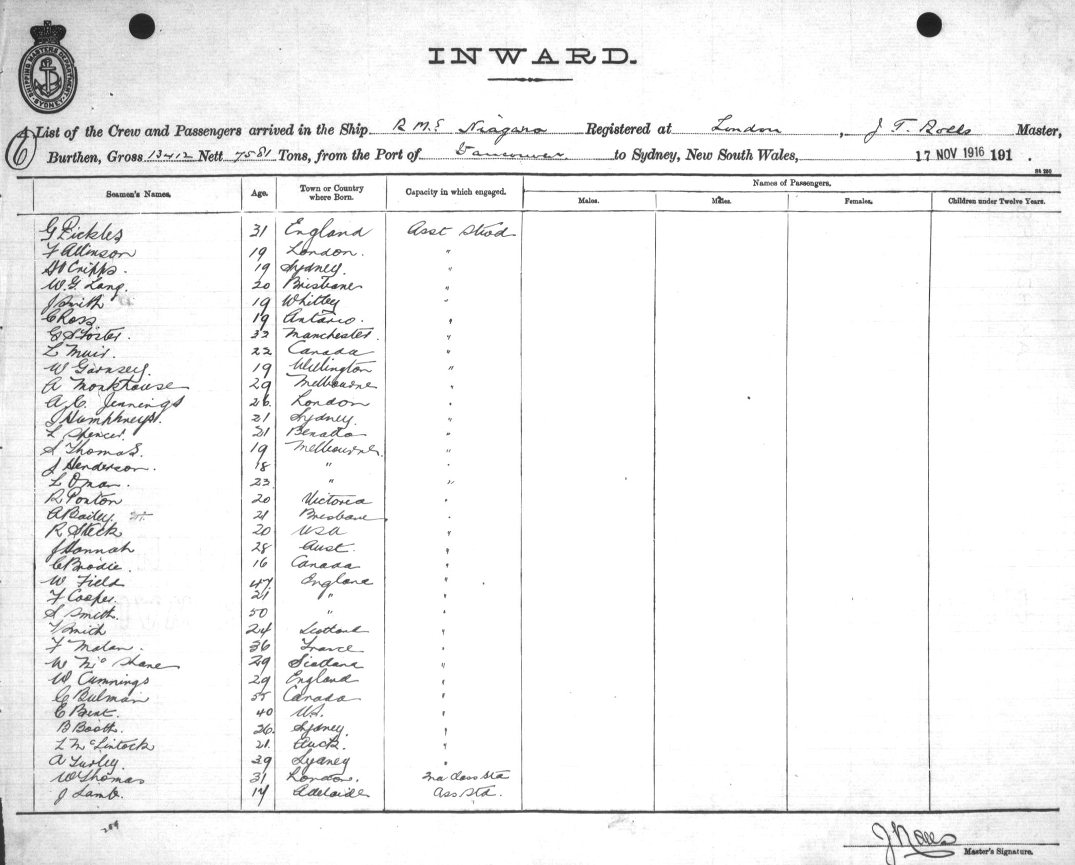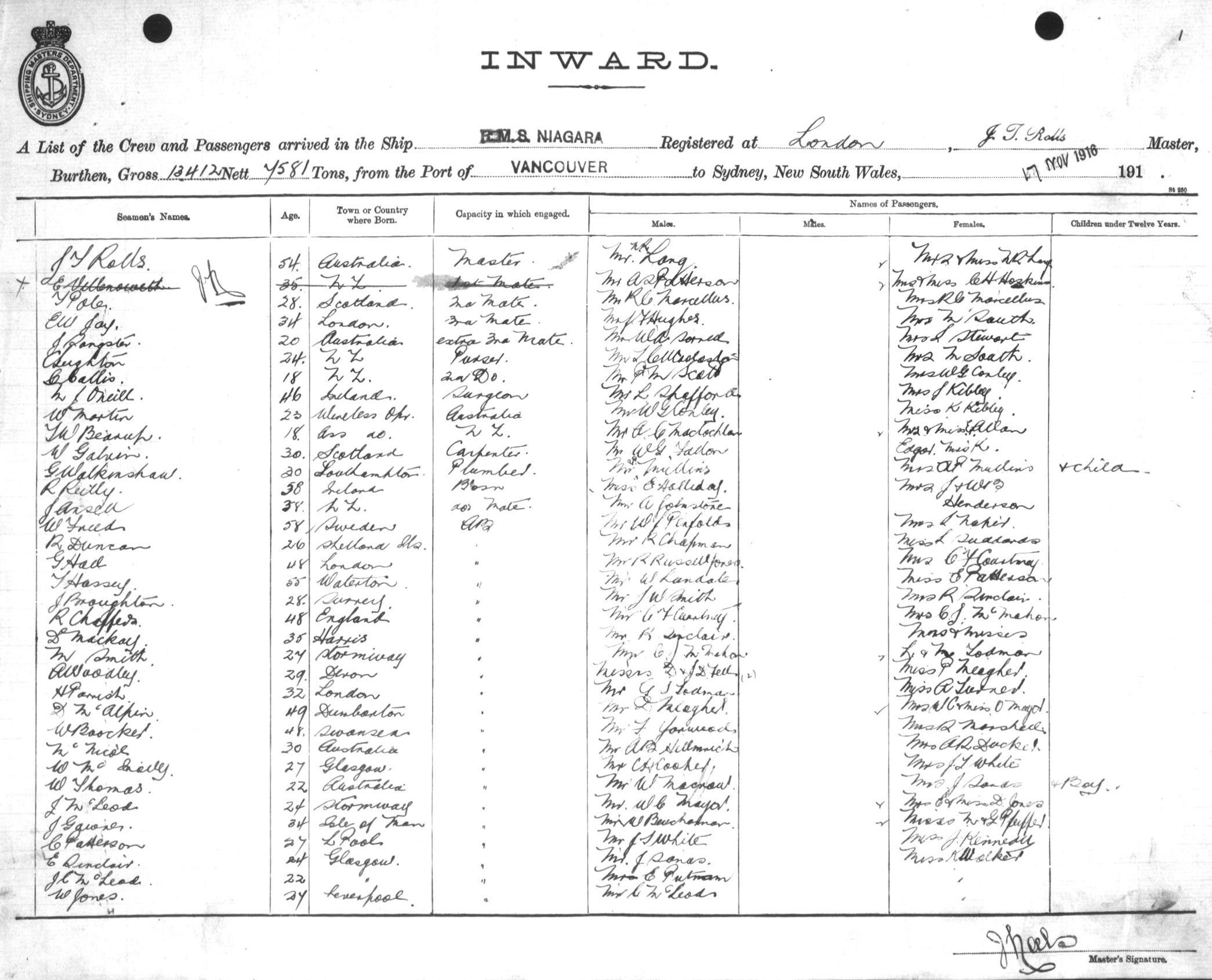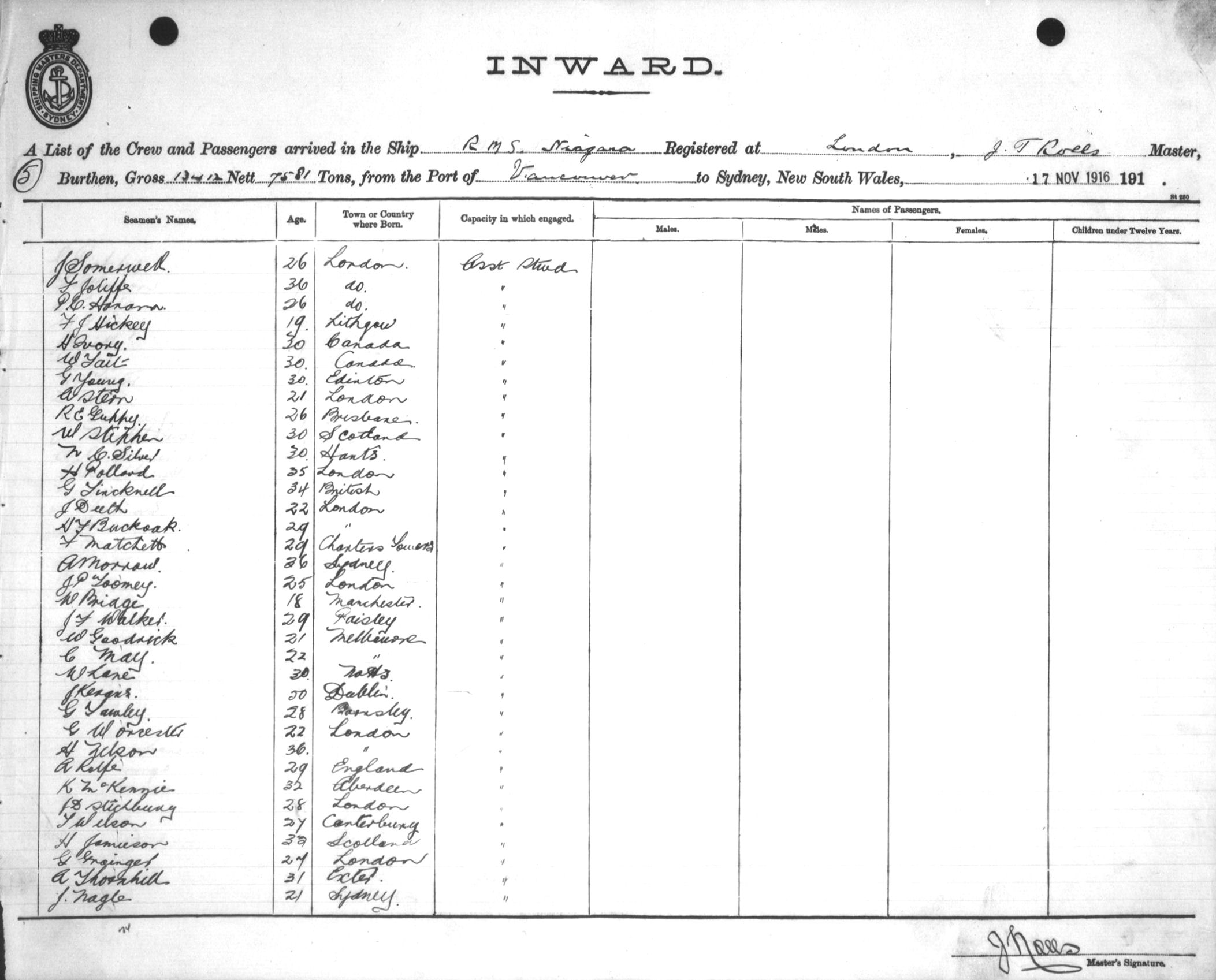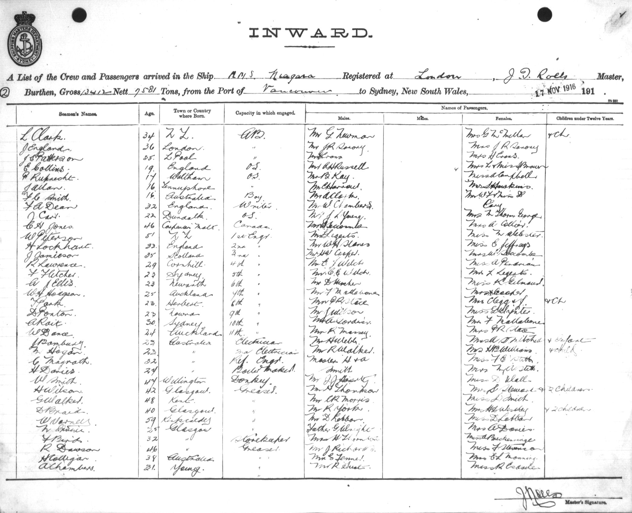 NIAGARAOF LONDON, J. T. ROLLS, MASTER, BURTHEN 13412/7581 TONS FROM THE PORT OF VANCOUVER TO SYDNEY, NEW SOUTH WALES, 17TH NOVEMBER 1916 |