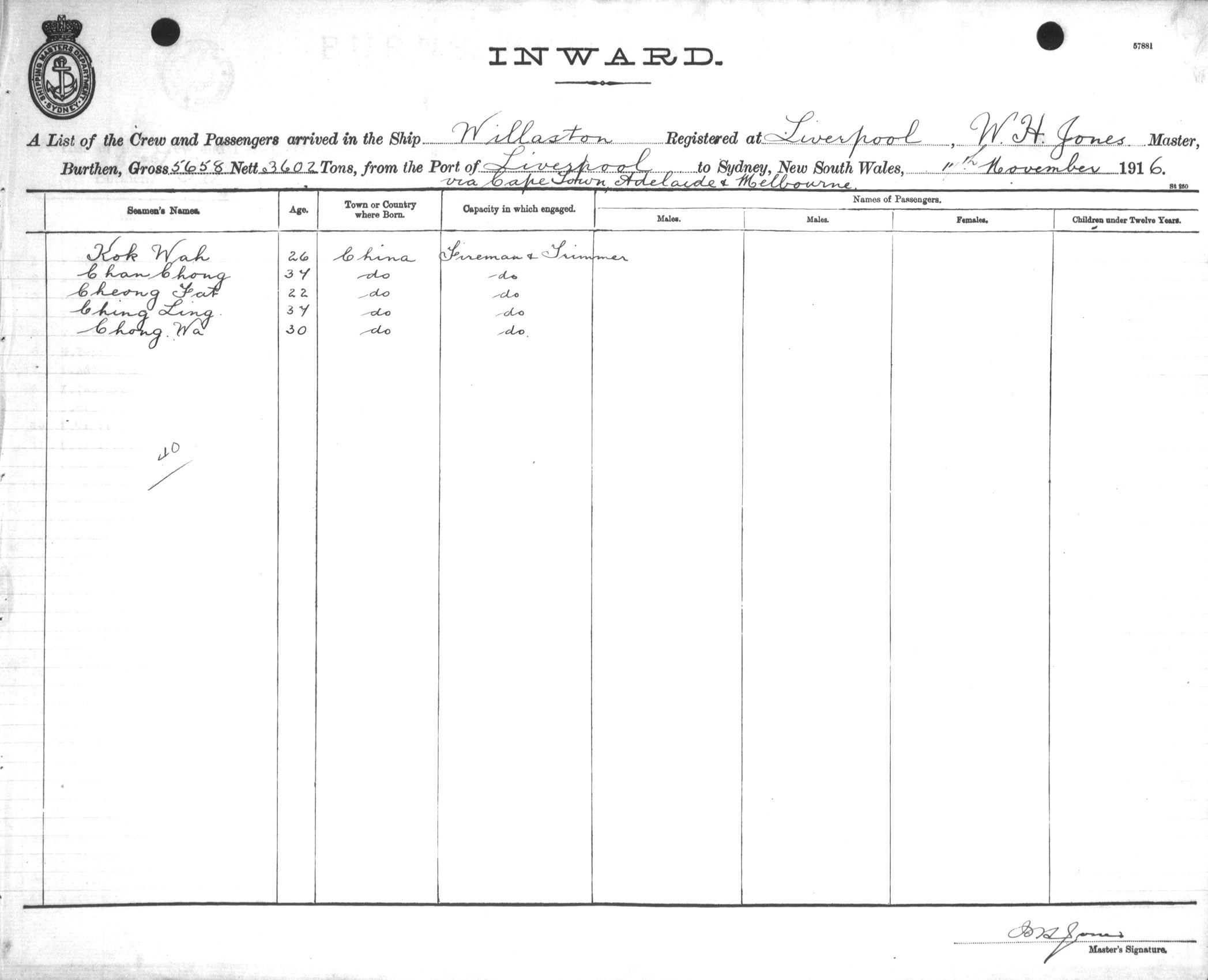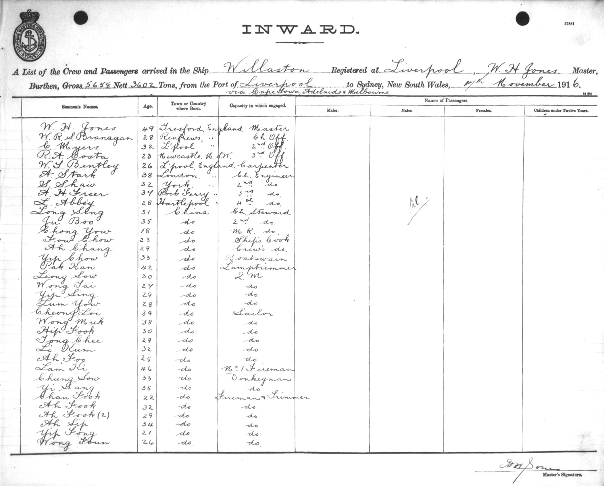 WILLASTONOF LIVERPOOL, W. H. JONES, MASTER, BURTHEN 5658/3602 TONS FROM THE PORT OF LIVERPOOL via CAPE TOWN, ADELAIDE & MELBOURNE TO SYDNEY, NEW SOUTH WALES, 17TH NOVEMBER 1916 |