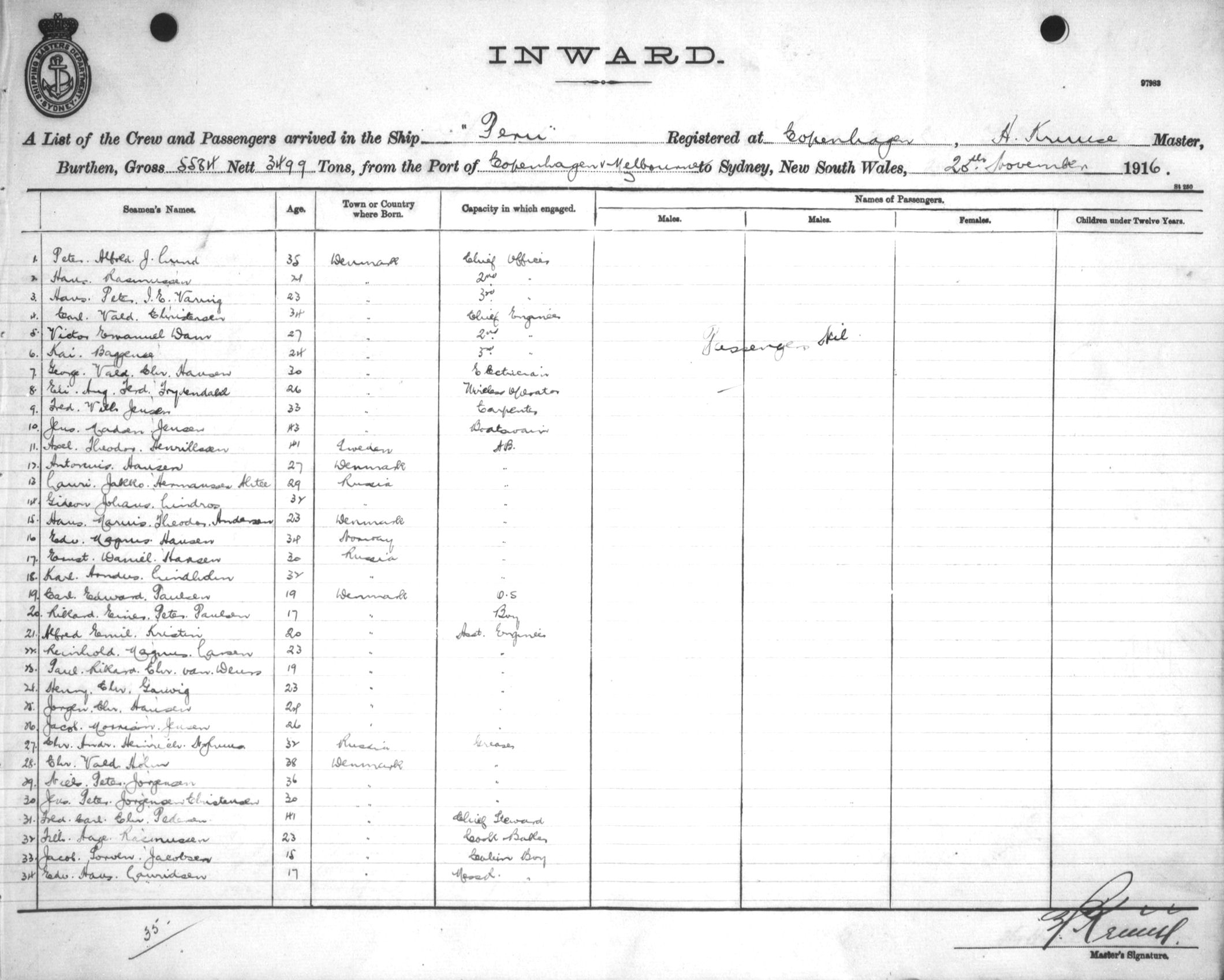 PERUOF COPENHAGEN, H. KRUUSE, MASTER, BURTHEN 5584/3499 TONS FROM THE PORT OF COPENHAGEN via MELBOURNE TO SYDNEY, NEW SOUTH WALES, 20TH NOVEMBER 1916 |