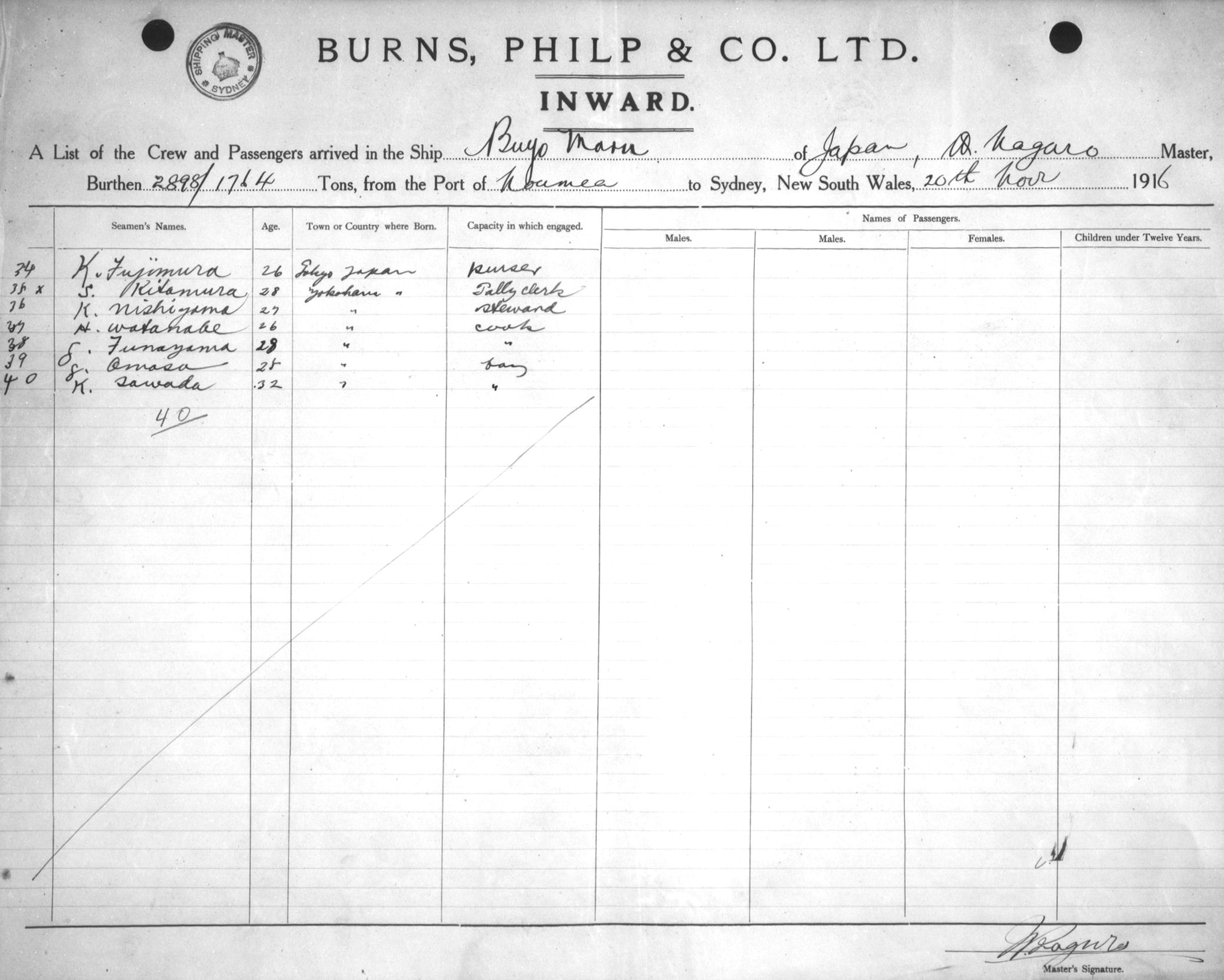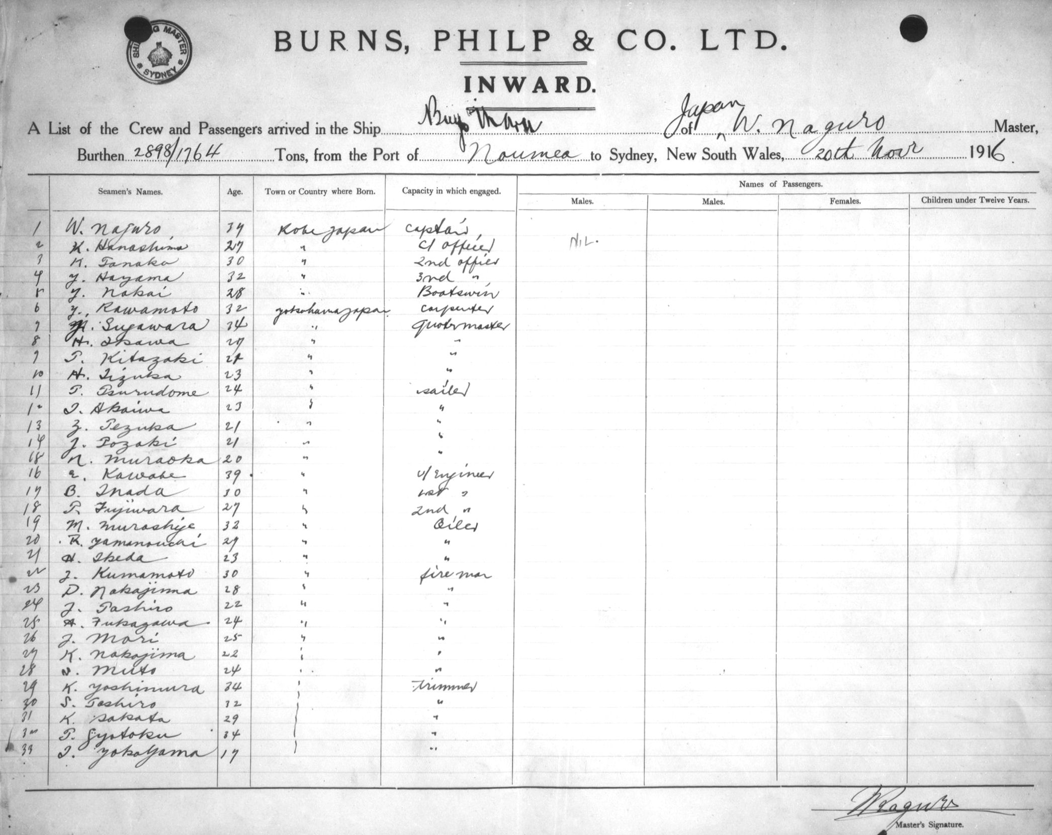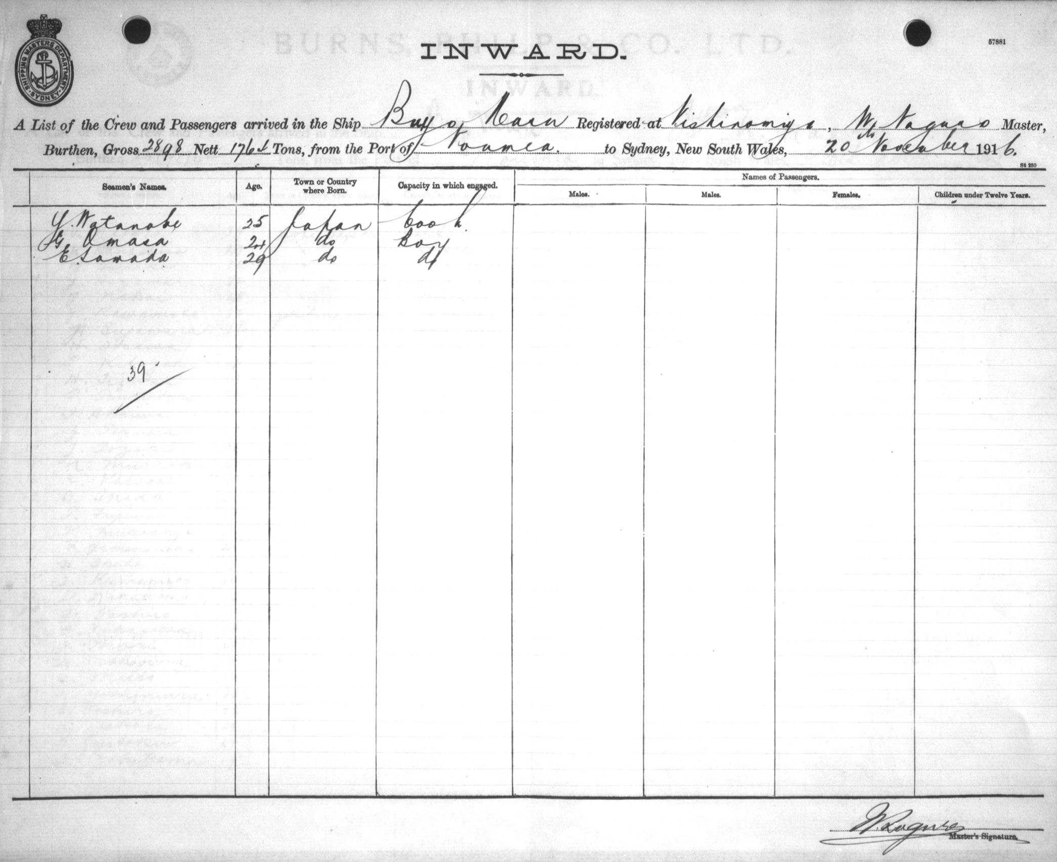 Mariners and ships in Australian Waters | BUYGO MARUOF NISHINOMIYA, W. NAGURO, MASTER, BURTHEN 2898/1764 TONS FROM THE PORT OF NOUMEA TO SYDNEY, NEW SOUTH WALES, 20 NOVEMBER 1916 |