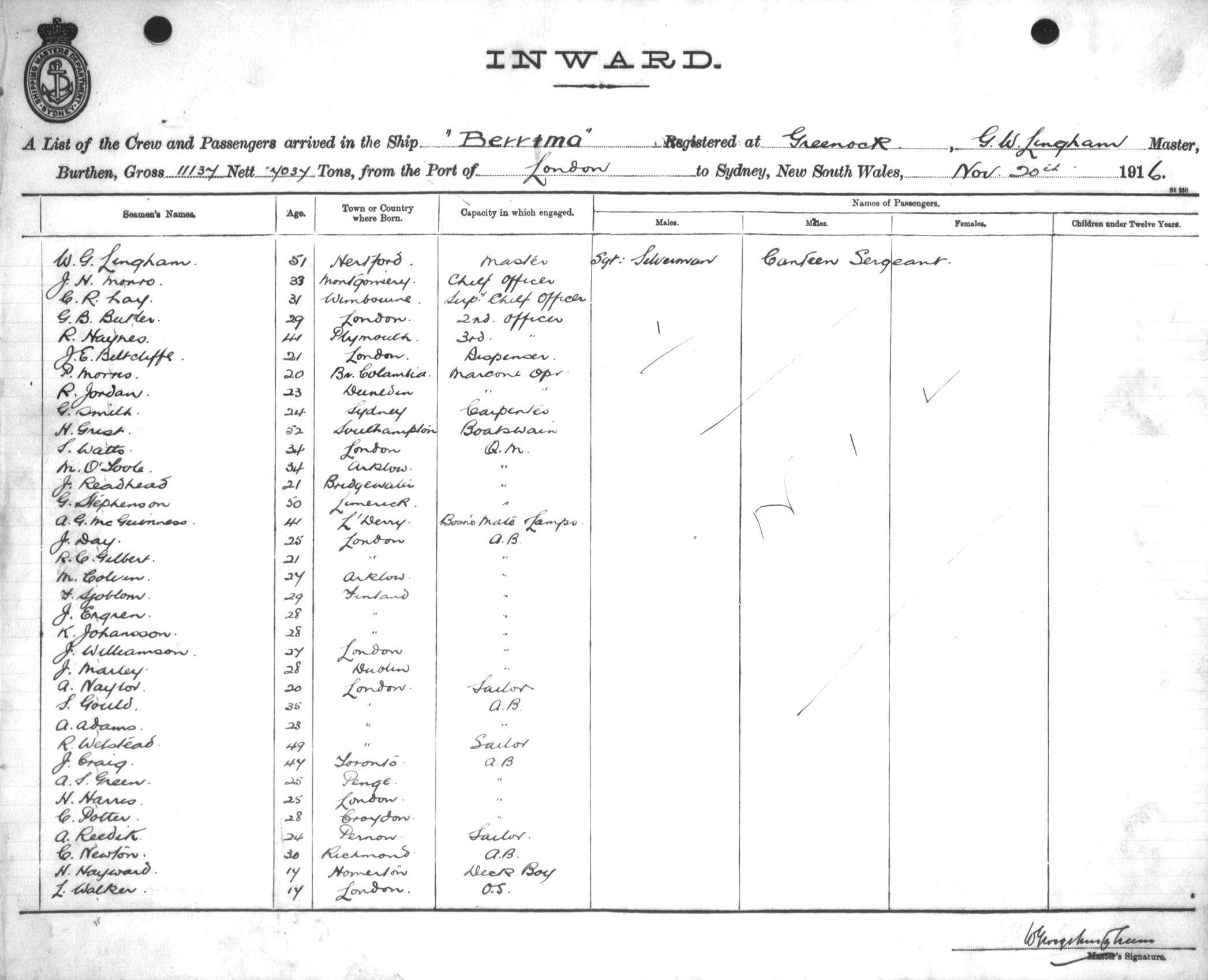 Mariners and ships in Australian Waters | BERRIMAOF GREENOCK, G. W. LINGHAM, MASTER, BURTHEN 11137/7037 TONS FROM THE PORT OF LONDON TO SYDNEY, NEW SOUTH WALES, 20TH NOVEMBER 1916 |