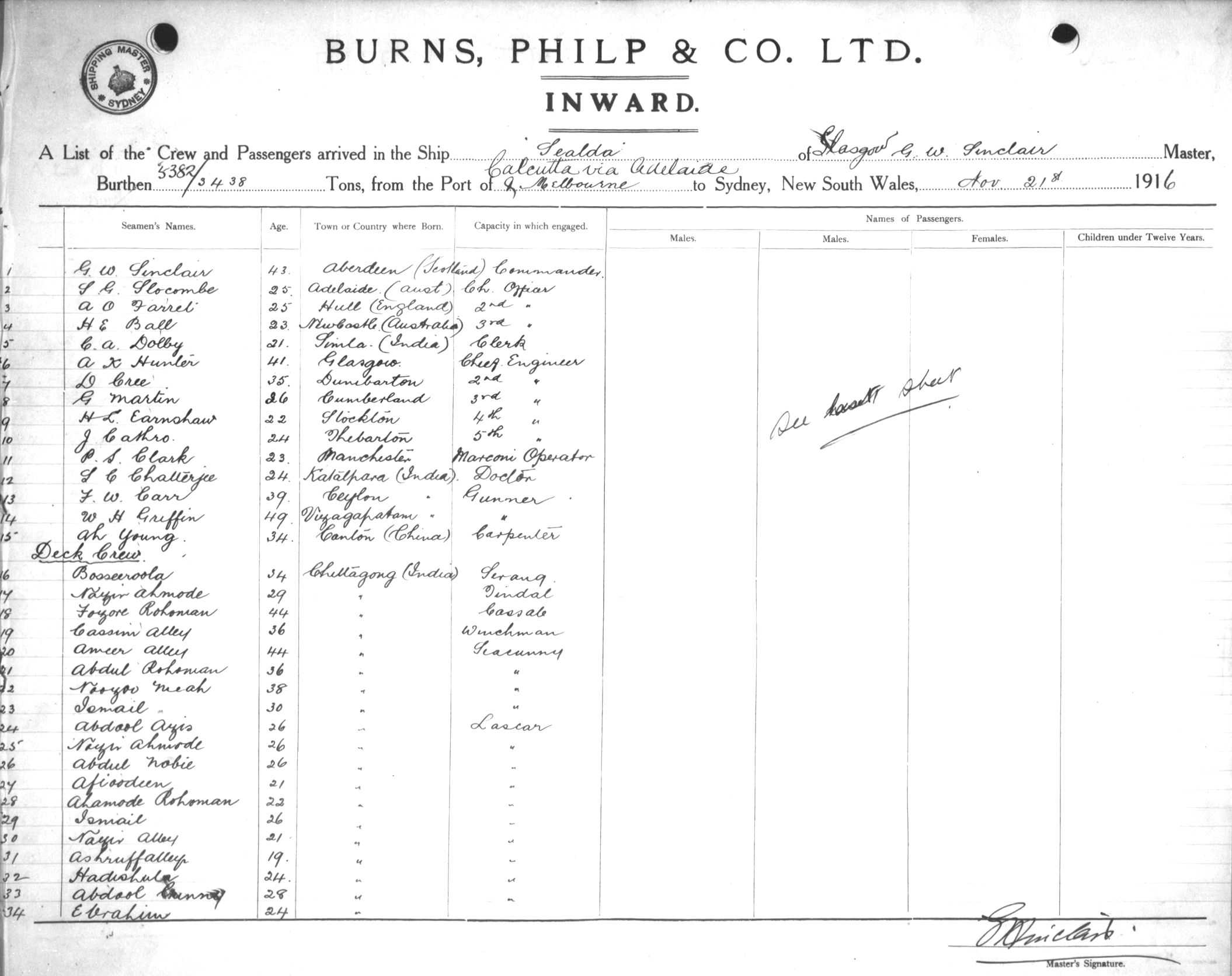 Mariners and ships in Australian Waters | SEALDAOF GLASGOW, G. W. SINCLAIR, MASTER, BURTHEN 5382/3438 TONS FROM THE PORT OF CALCUTTA via ADELAIDE & MELBOURNE TO SYDNEY, 21ST NOVEMBER 1916 |