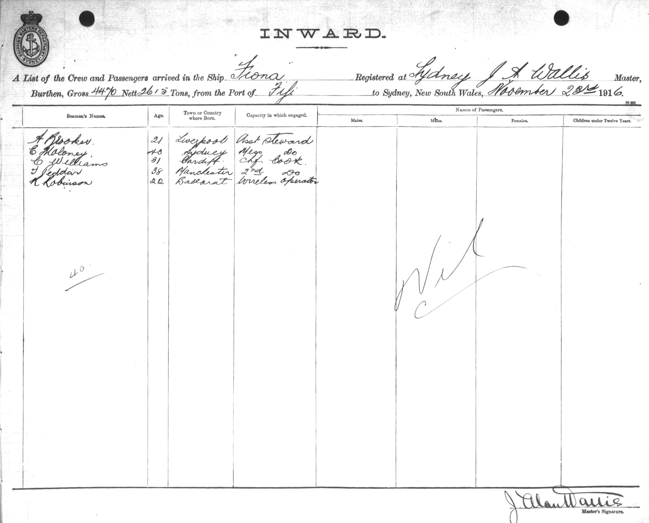 FIONAOF SYDNEY, J. A. WALLIS, MASTER, BURTHEN 4470/2615 TONS FROM THE PORT OF FIJI TO SYDNEY, NEW SOUTH WALES, 23RD NOVEMBER 1916 |