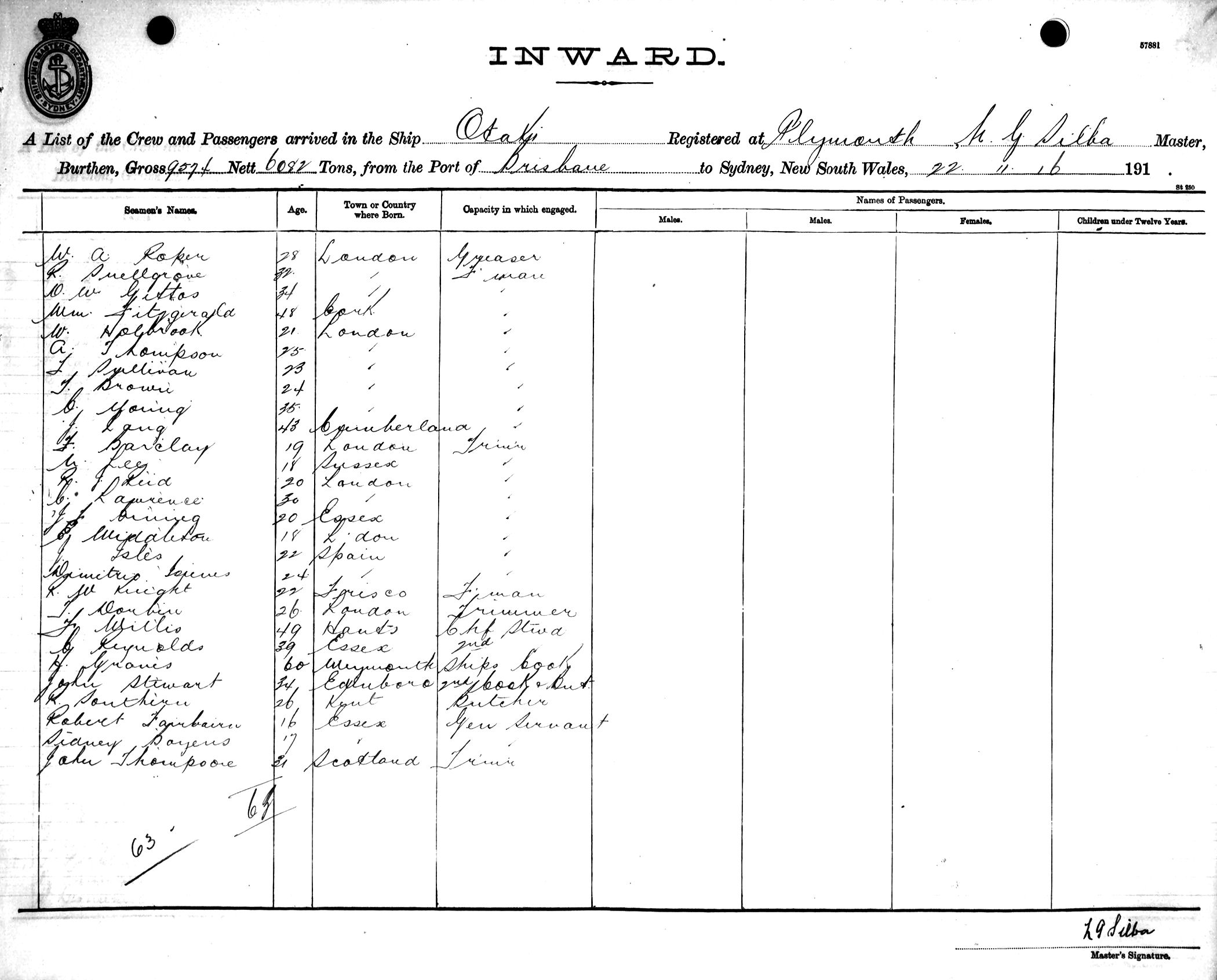 OTAKIOF PLYMOUTH, L. G. SILBA, MASTER, BURTHEN 9574/6082 TONS FROM THE PORT OF BRISBANE TO SYDNEY, NEW SOUTH WALES, 22ND NOVEMBER 1916 |