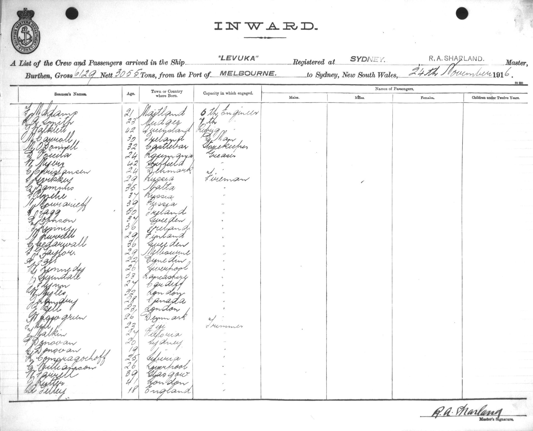 LEVUKAOF SYDNEY, R. A. SHARLAND, MASTER, BURTHEN 6129/3055 TONS FROM THE PORT OF MELBOURNE TO SYDNEY, NEW SOUTH WALES, 24TH NOVEMBER 1916 |
