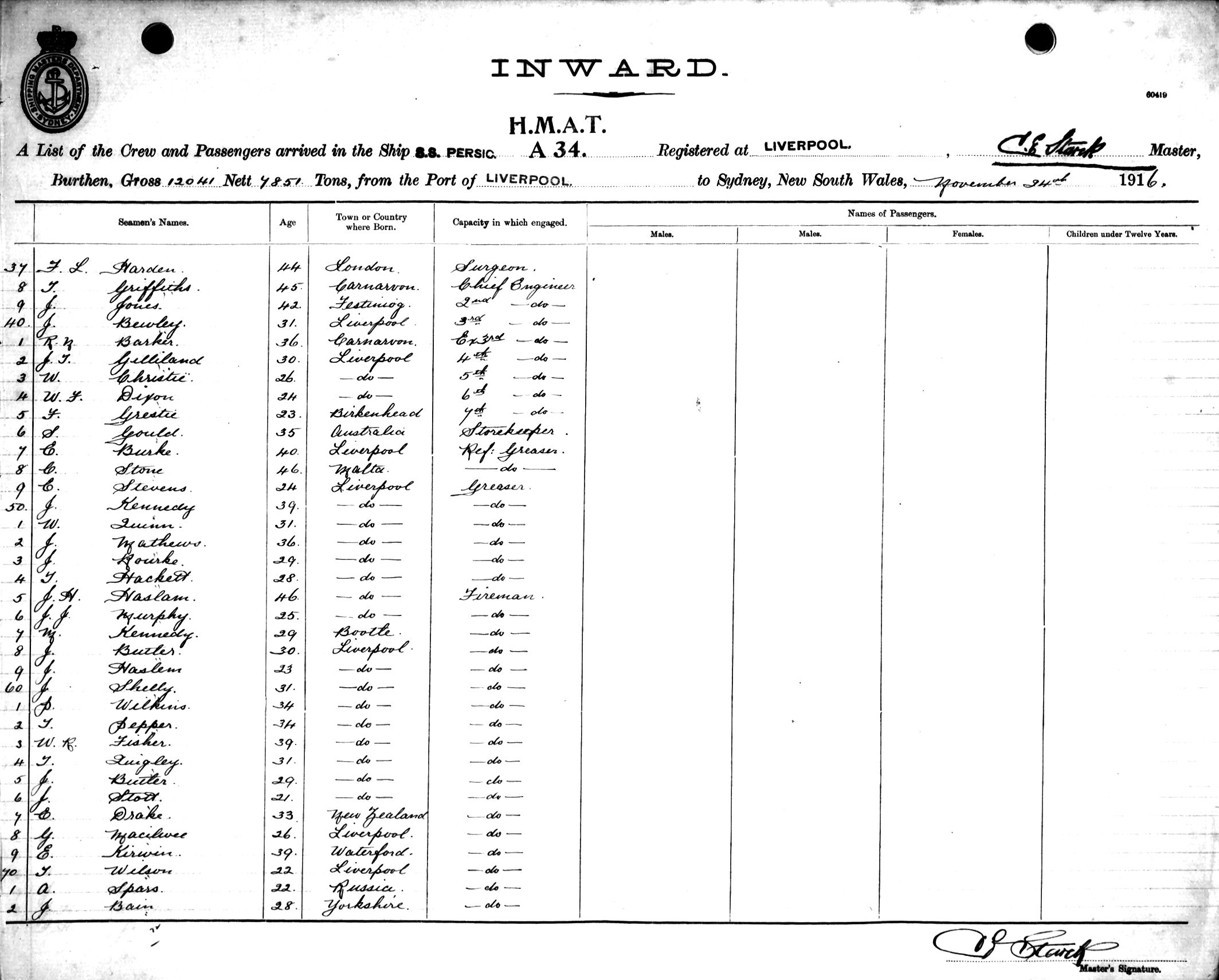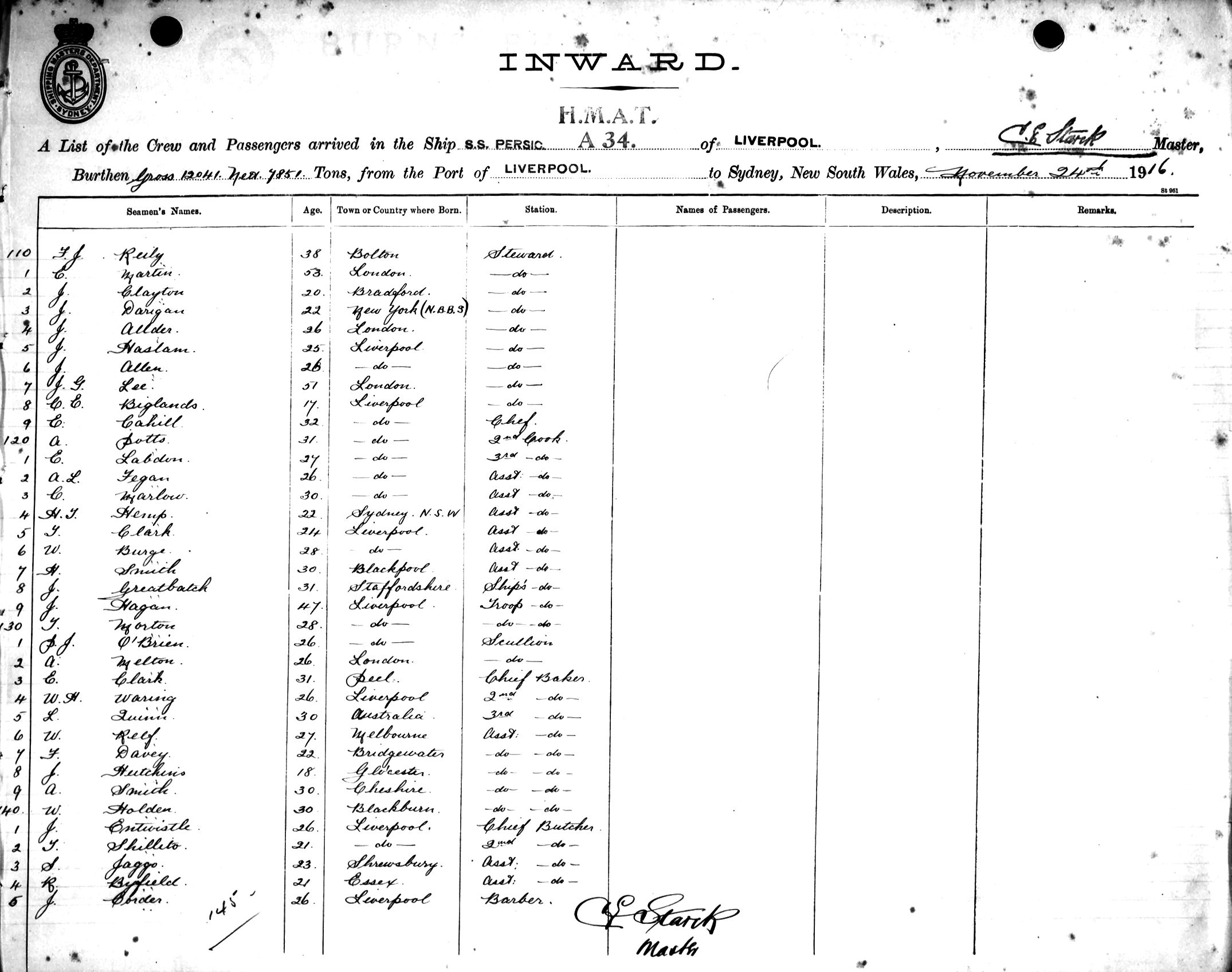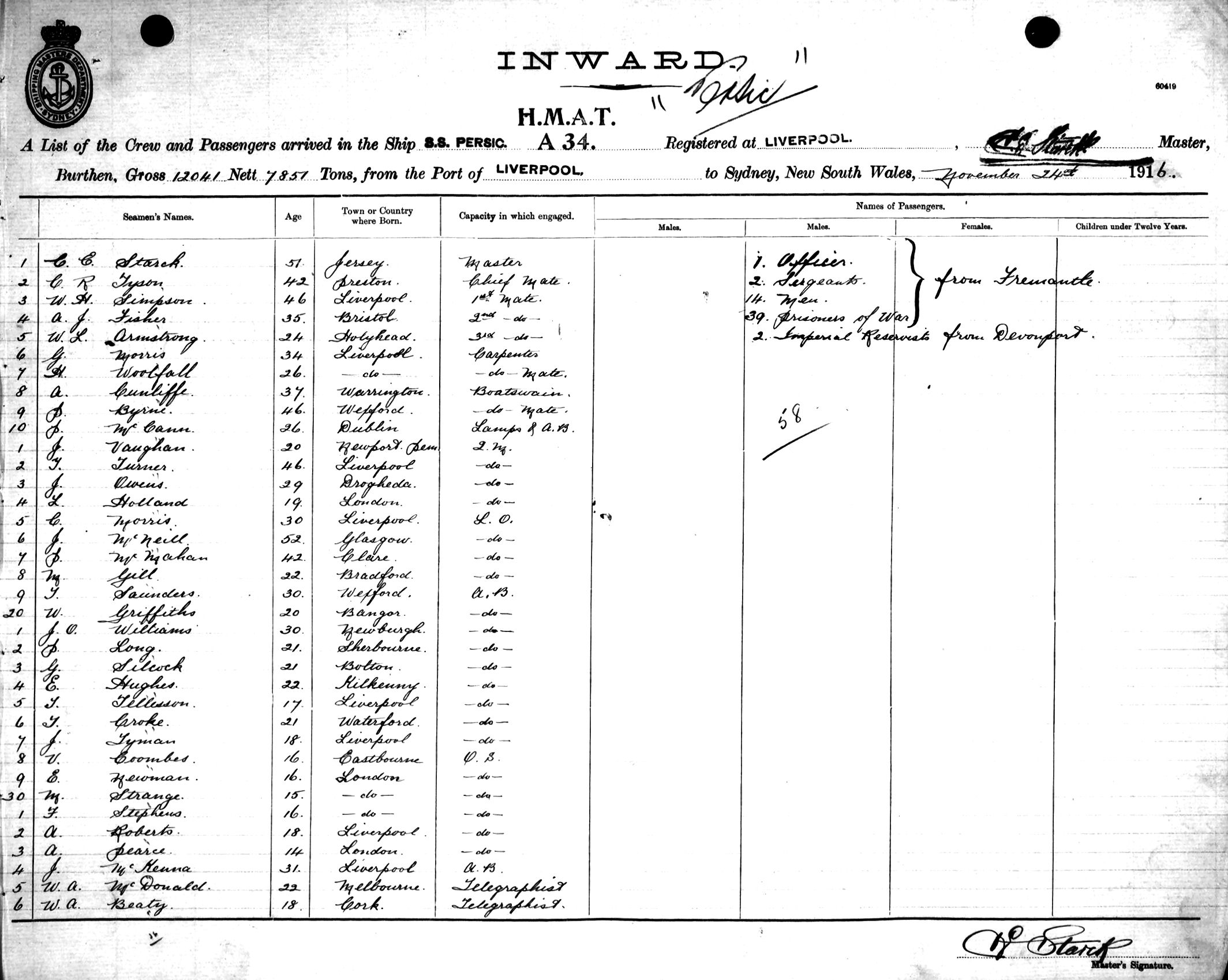 PERSICOF LIVERPOOL, C. E. STARCK, MASTER, BURTHEN 12,041/7851 TONS FROM THE PORT OF LIVERPOOL TO SYDNEY, NEW SOUTH WALES, 24TH NOVEMBER 1916 |
