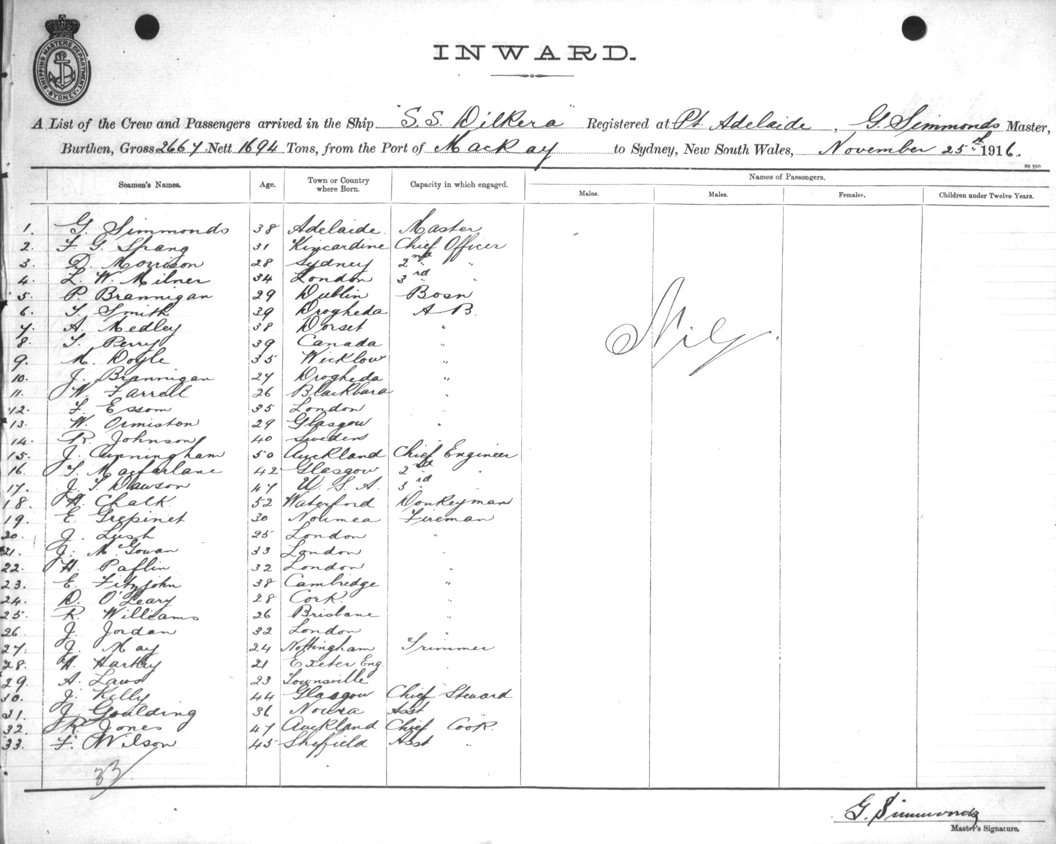 DILKERAOF PORT ADELAIDE, G. SIMMONDS, MASTER, BURTHEN 2667/1694 TONS FROM THE PORT OF MACKAY TO SYDNEY, NEW SOUTH WALES, 25TH NOVEMBER 1916 |