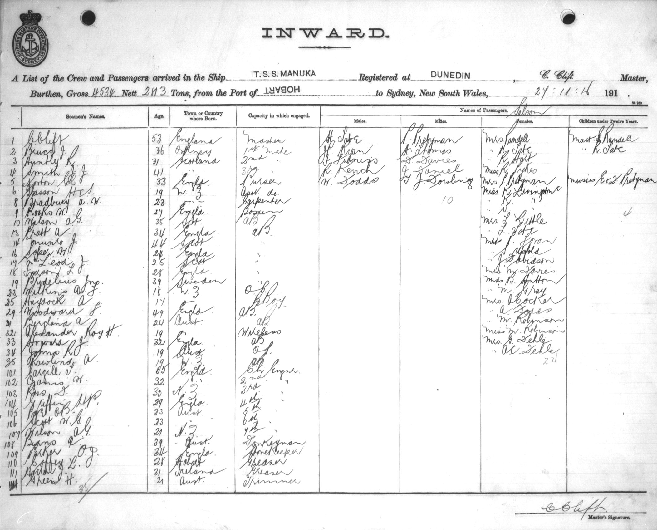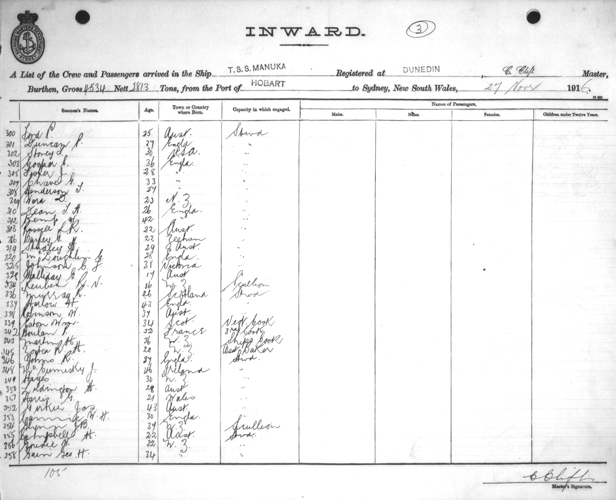 MANUKAOF DUNEDIN, C. CLIFT, MASTER, BURTHEN 4534/2813 TONS FROM THE PORT OF HOBART TO SYDNEY, NEW SOUTH WALES, 27TH NOVEMBER 1916 |