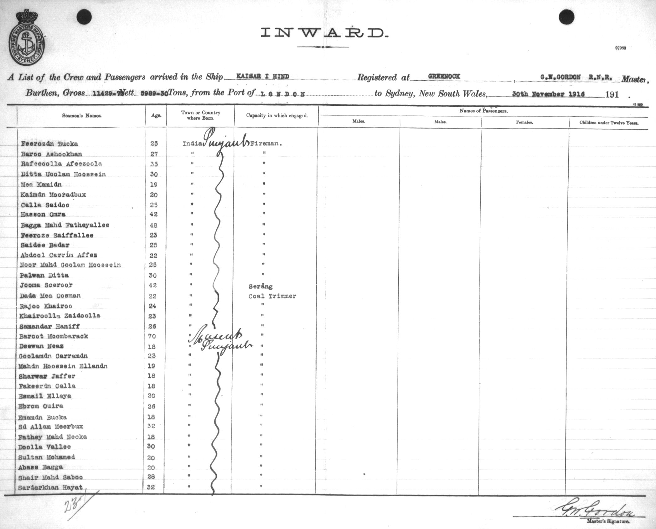 Mariners and ships in Australian Waters | KAISAR-I-HINDOF GREENOCK, G. W. GORDON, MASTER, BURTHEN 11429.70/5989.30 TONS FROM THE PORT OF LONDON via FREMANTLE, ADELAIDE & MELBOURNE TO SYDNEY, NEW SOUTH WALES, 30TH NOVEMBER 1916 |