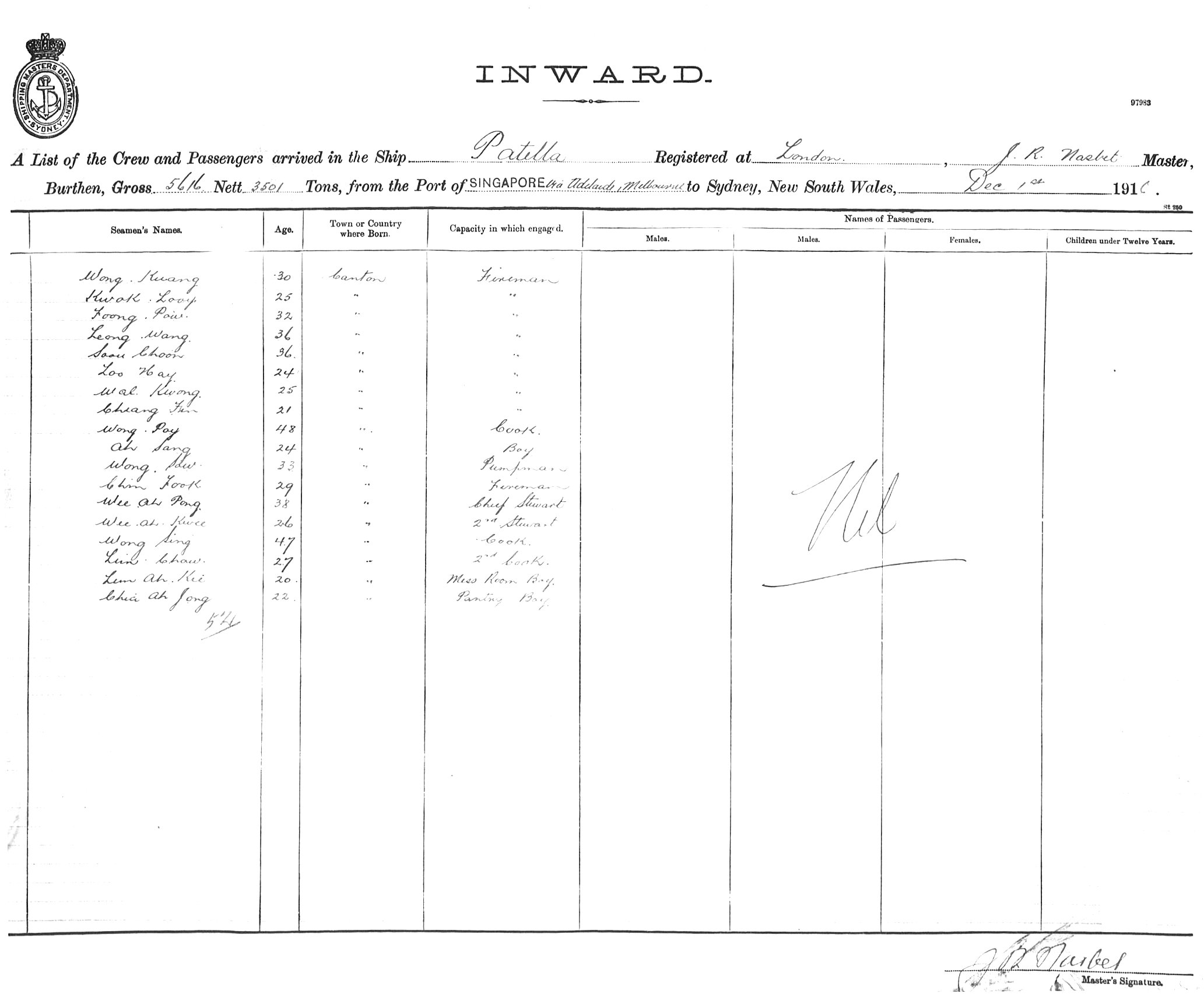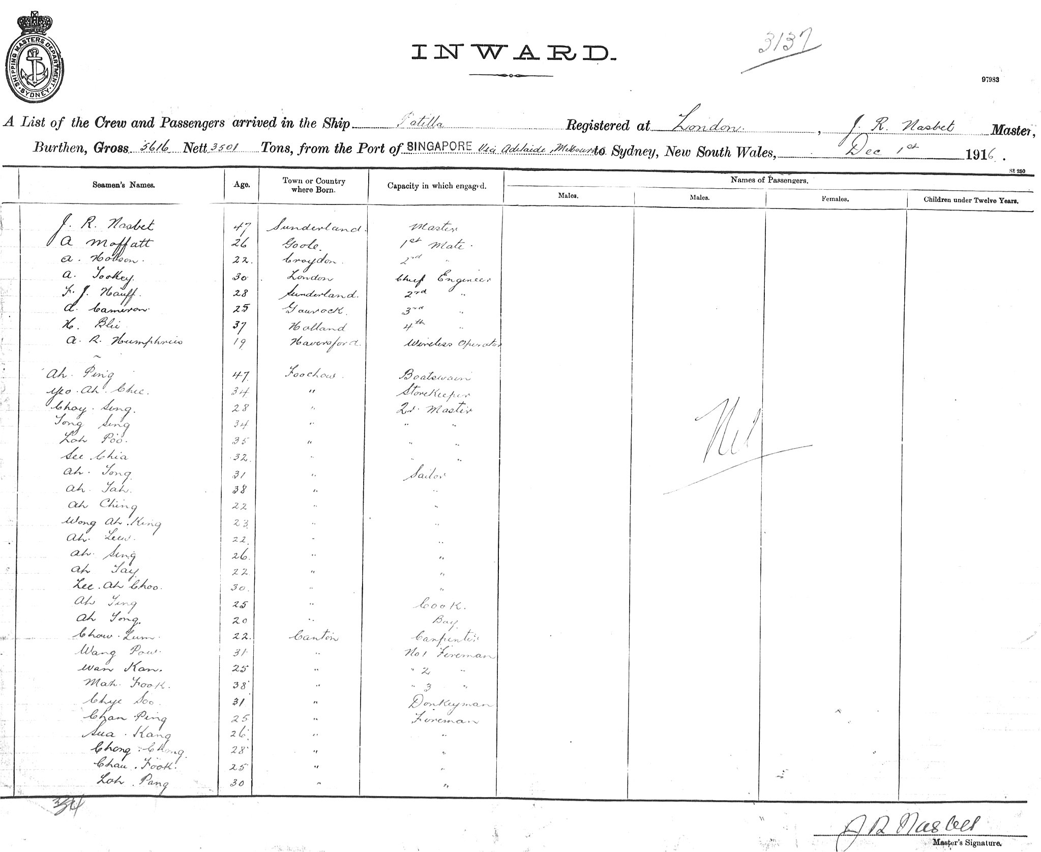 PATELLAOF LONDON, J. R. NASBET, MASTER, BURTHEN 5616/3501 TONS FROM THE PORT OF SINGAPORE via ADELAIDE & MELBOURNE TO SYDNEY, NEW SOUTH WALES, 1ST DECEMBER 1916 |