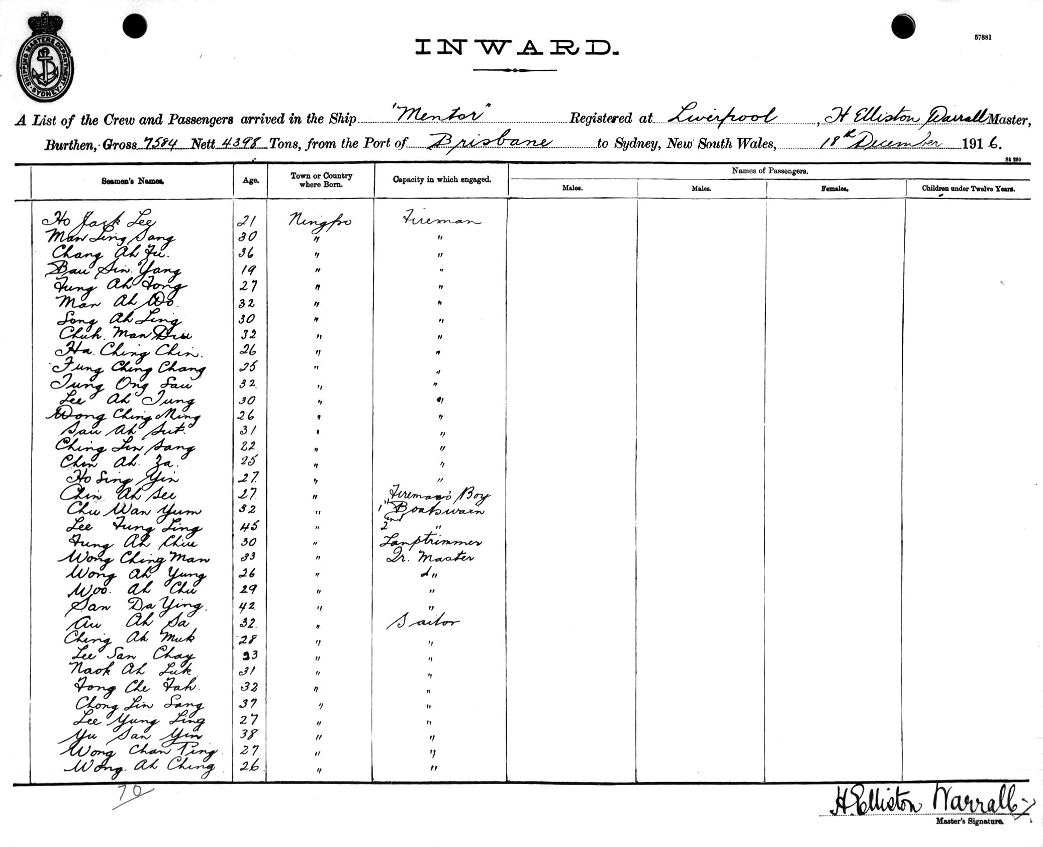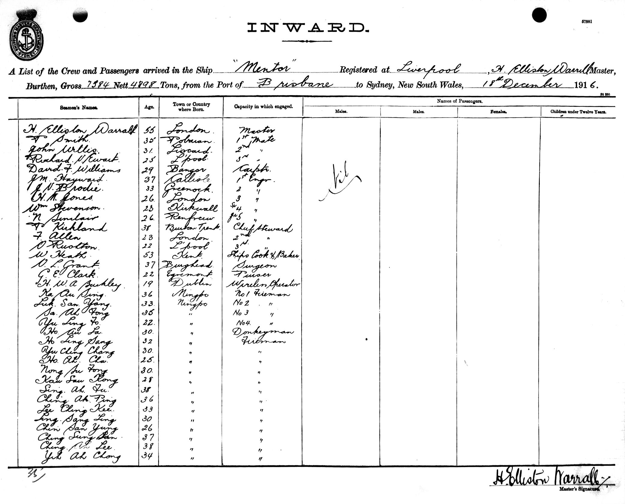 MENTOROF LIVERPOOL, H. ELLISTON WARRALL, MASTER, BURTHEN 7584/4798 TONS FROM THE PORT OF BRISBANE TO SYDNEY, NEW SOUTH WALES, 17TH DECEMBER 1916 |