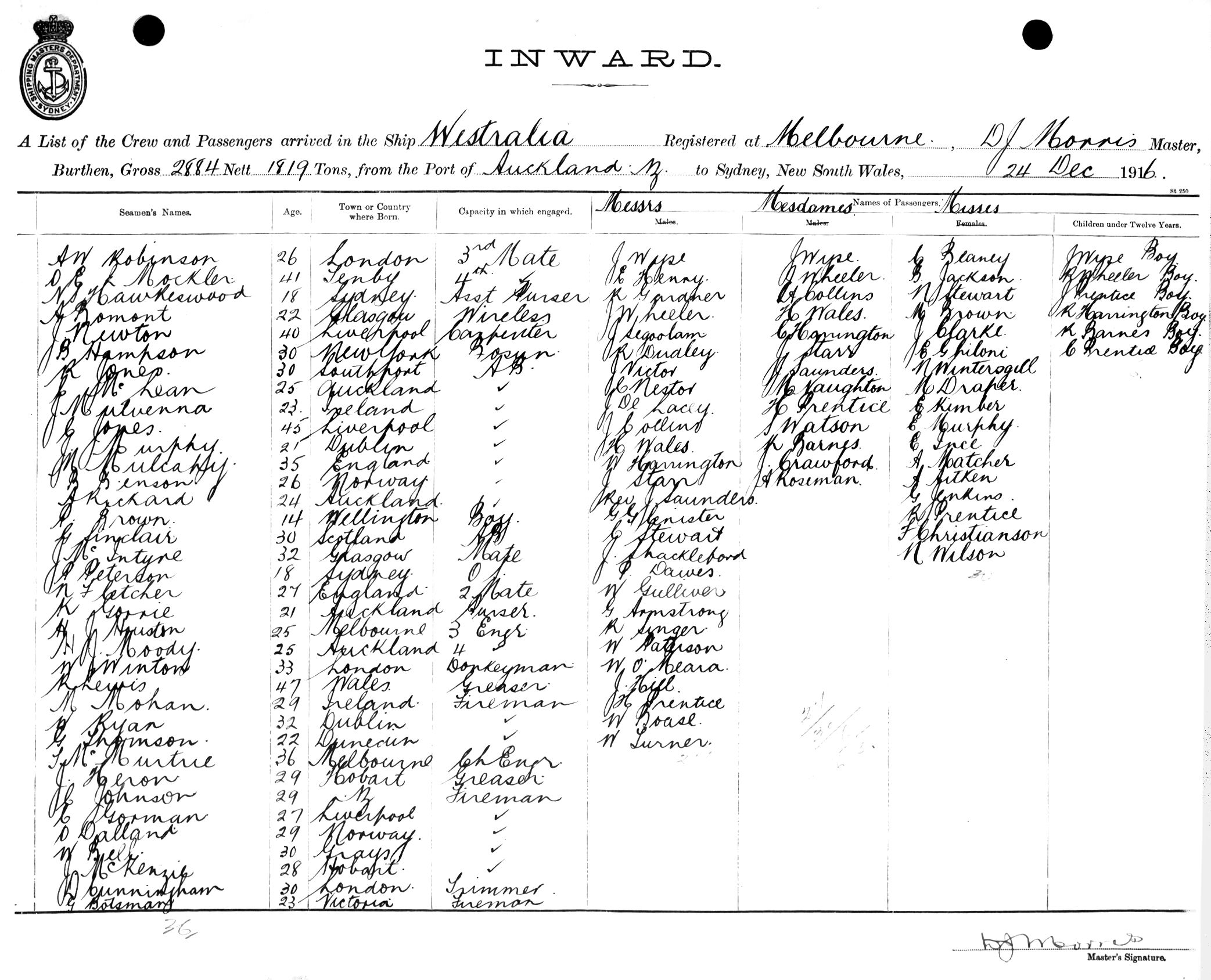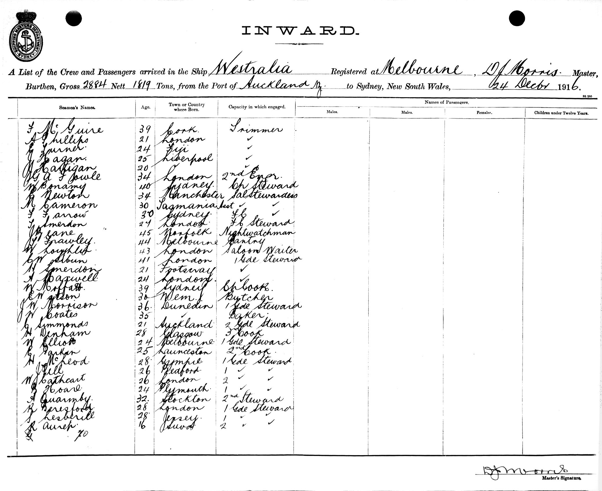 WESTRALIAOF MELBOURNE, D. J. MORRIS, MASTER, BURTHEN 2884/1819 TONS FROM THE PORT OF AUCKLAND TO SYDNEY, NEW SOUTH WALES, 24TH DECEMBER 1916 |