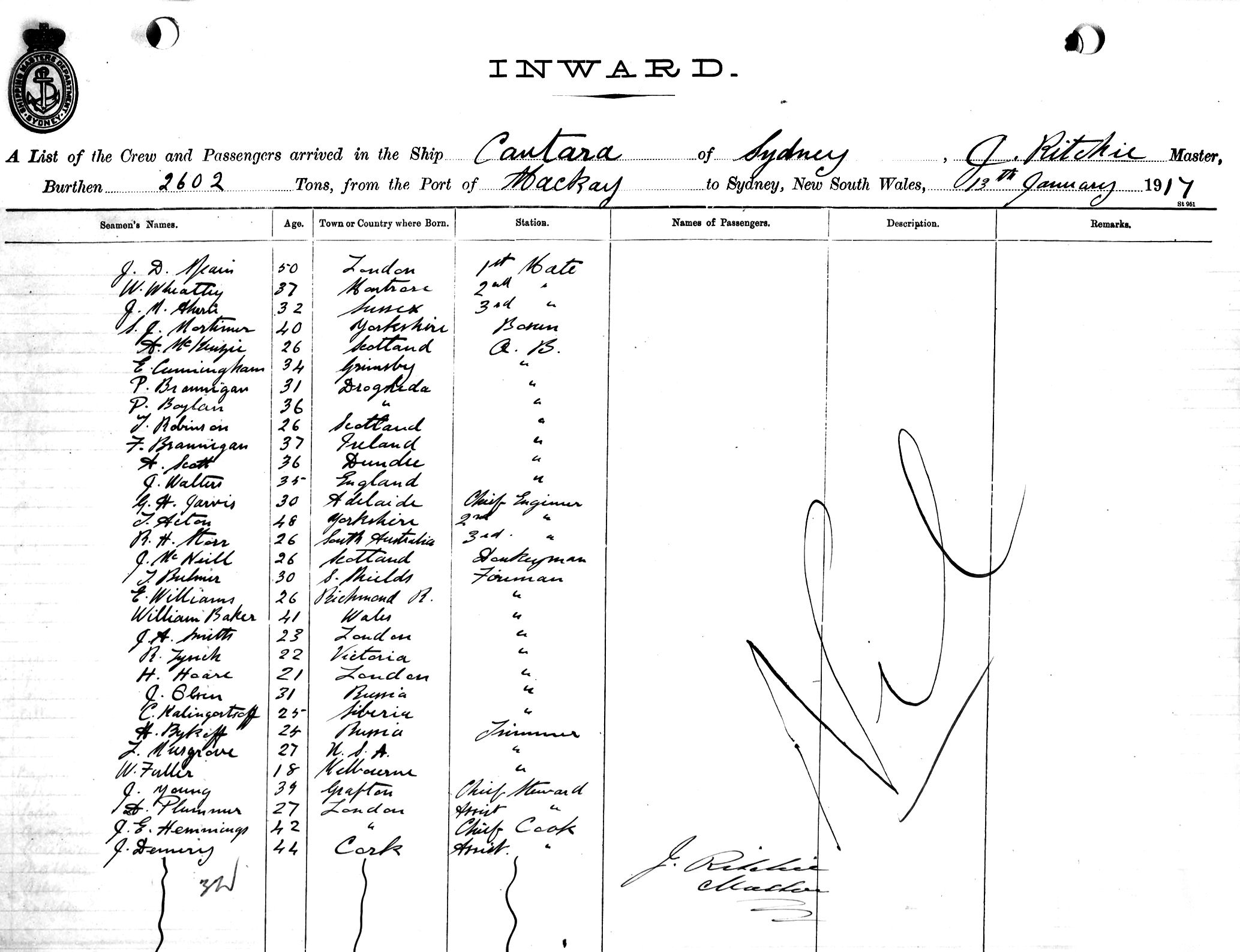 CANTARAOF SYDNEY, J. RITCHIE, MASTER, BURTHEN 2602 TONS FROM THE PORT OF MACKAY TO SYDNEY, NEW SOUTH WALES, 13TH JANUARY 1917 |