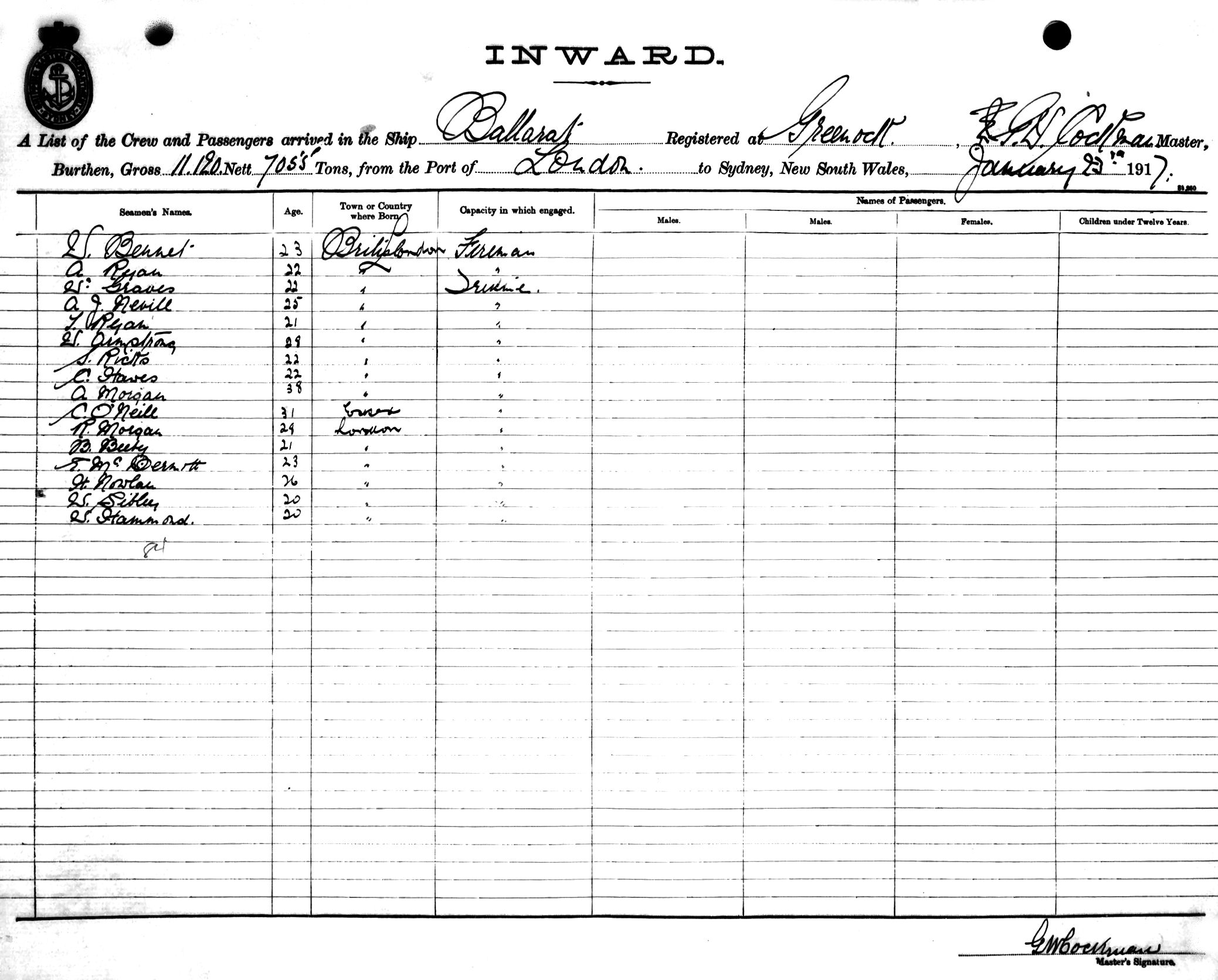 BALLARATOF GREENOCK, G. D. COCKMAN, MASTER, BURTHEN 11120/7055 TONS FROM THE PORT OF LONDON TO SYDNEY, NEW SOUTH WALES, 23RD JANUARY 1917 |