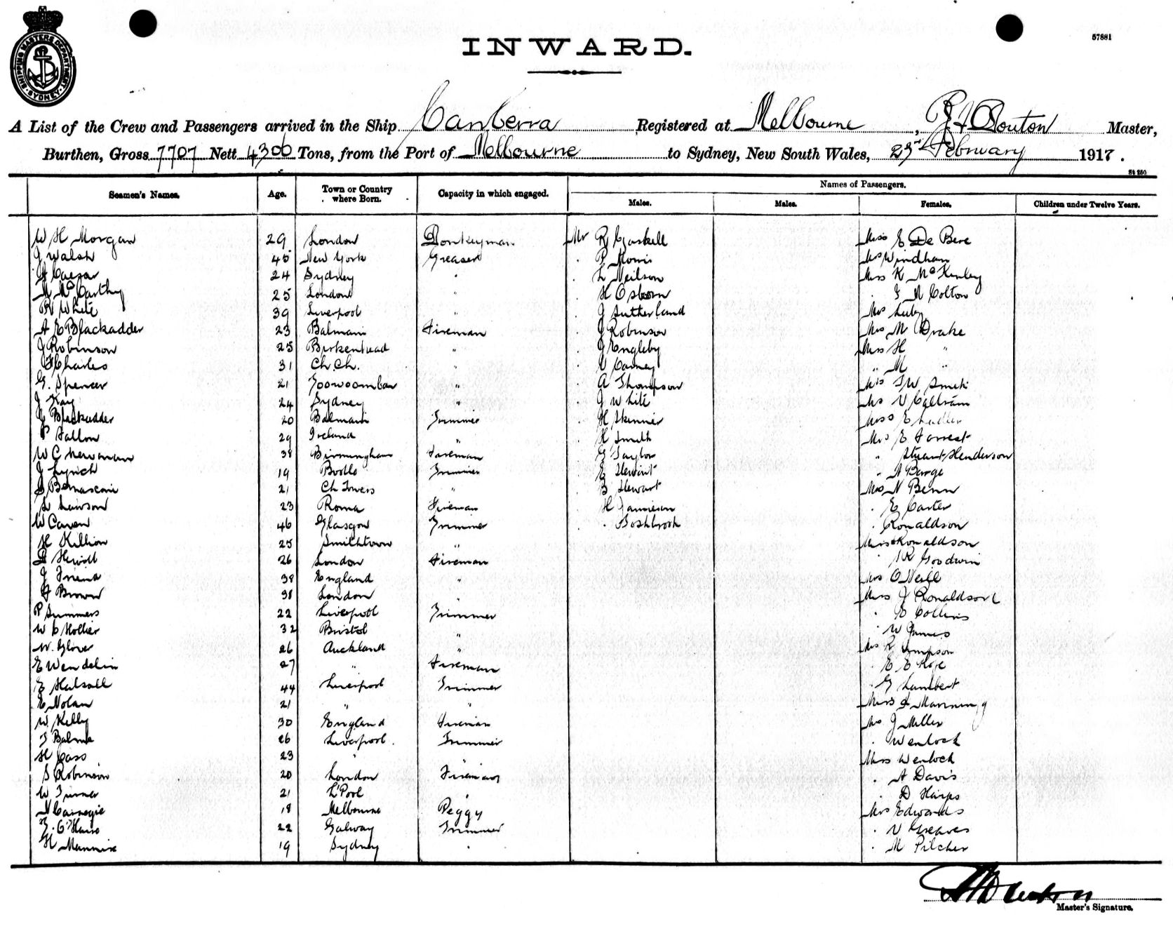 CANBERRAOF MELBOURNE, R. F. DOUTON, MASTER, BURTHEN 7707/4306 TONS FROM THE PORT OF MELBOURNE TO SYDNEY, NEW SOUTH WALES, 23RD FEBRUARY 1917 |