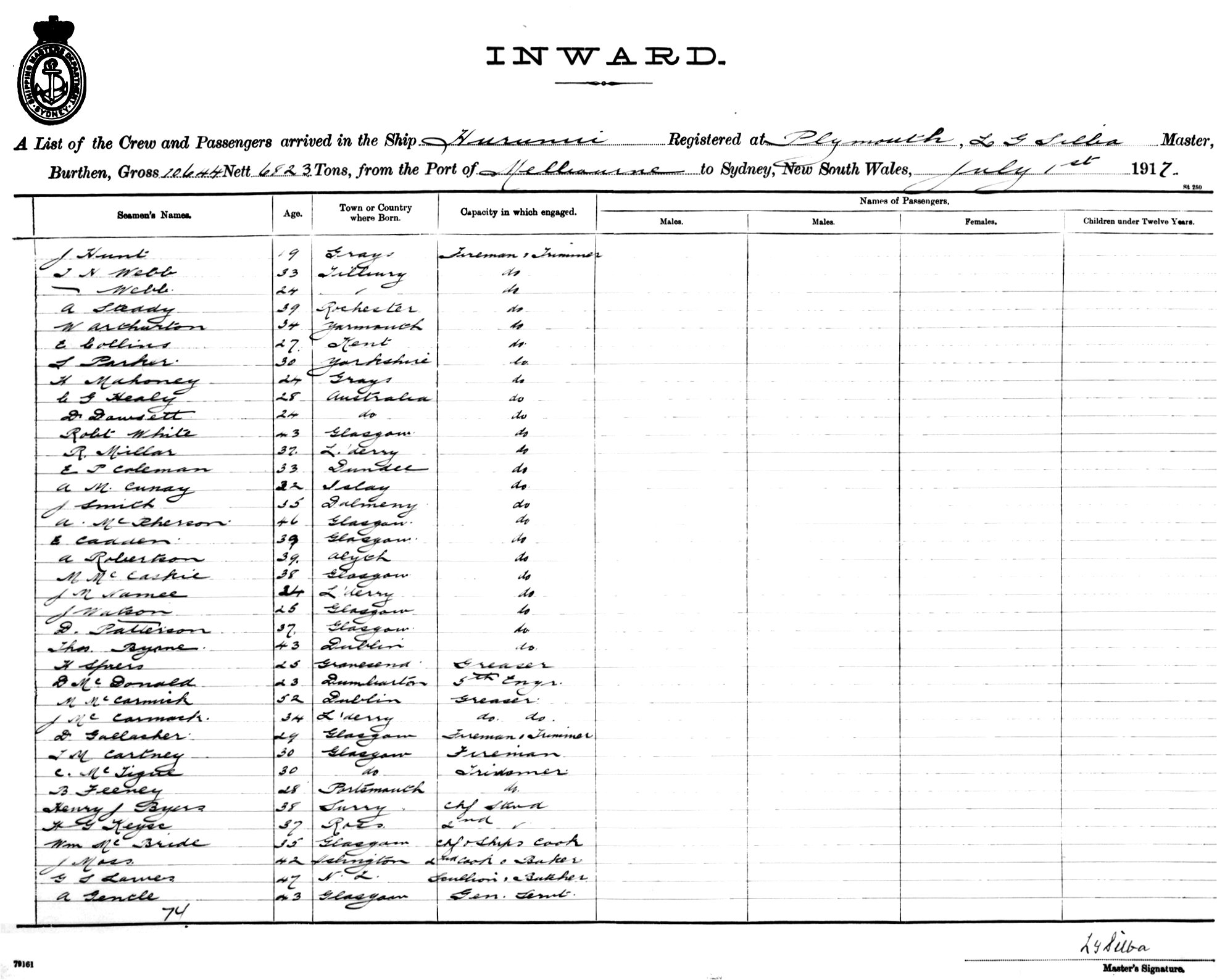 HURUNUIOF PLYMOUTH, L. G. SILBA, MASTER, BURTHEN 10644/6823 TONS FROM THE PORT OF LONDON VIA FREMANTLE, ADELAIDE & MELBOURNE TO SYDNEY, NEW SOUTH WALES, 1ST JULY 1917 |