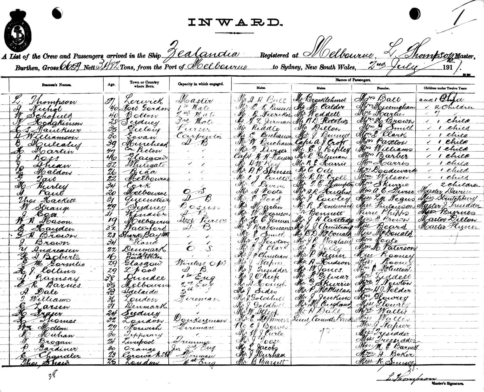 Mariners and ships in Australian Waters | ZEALANDIAOF MELBOURNE, L. THOMPSON, MASTER, BURTHEN 6659/3482 TONS FROM THE PORT OF MELBOURNE TO SYDNEY, NEW SOUTH WALES, 2ND JULY 1917 |