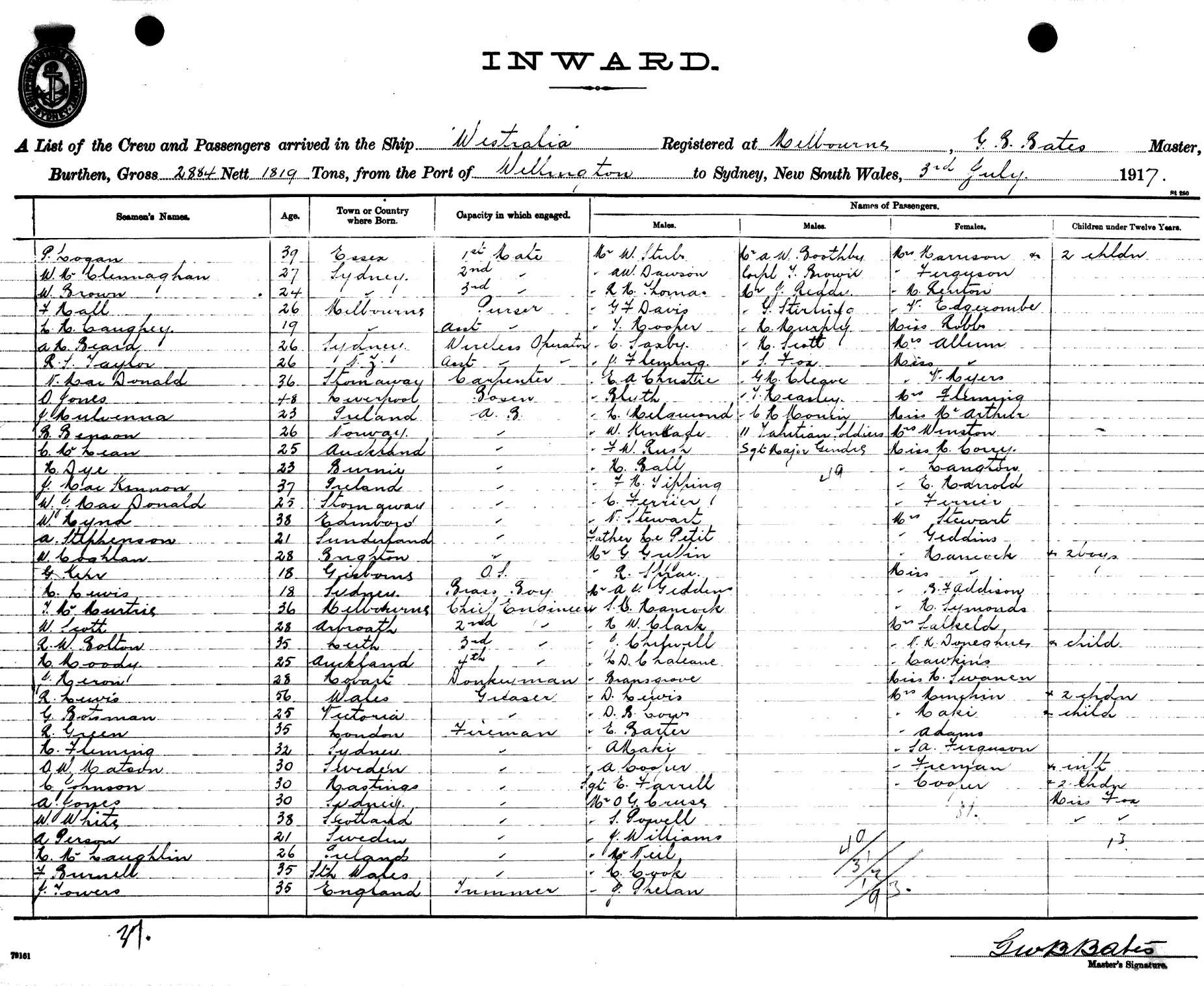WESTRALIAOF MELBOURNE, G. B. BATES, MASTER, BURTHEN 2884/1819 TONS FROM THE PORT OF WELLINGTON TO SYDNEY, NEW SOUTH WALES, 3RD JULY 1917 |
