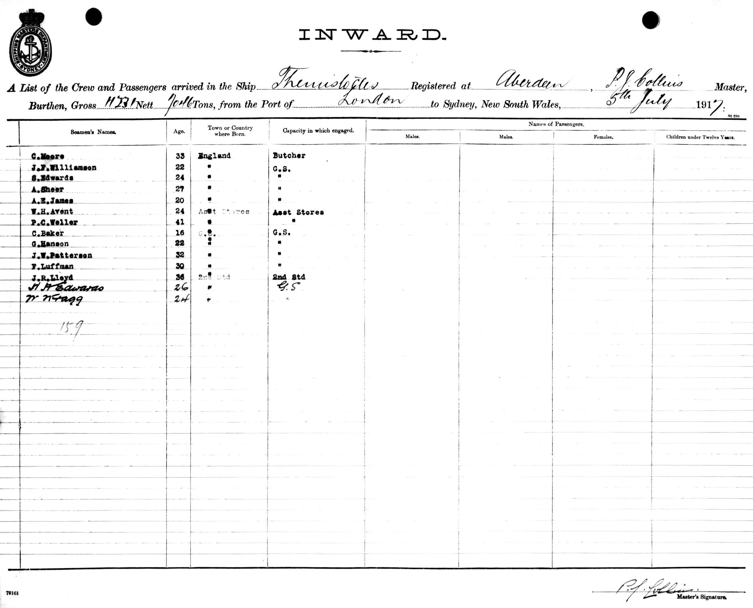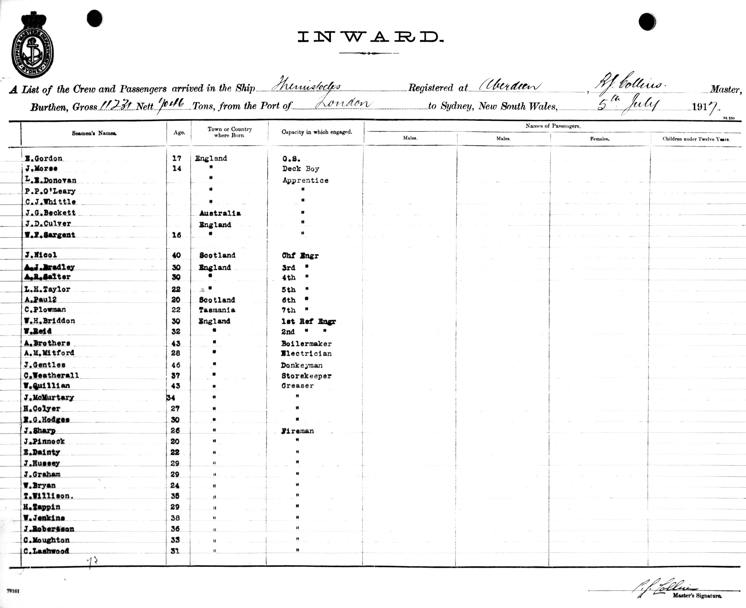 THEMISTOCLESOF ABERDEEN, P. J COLLINS, MASTER, BURTHEN 11231/7046 TONS FROM THE PORT OF LONDON TO SYDNEY, NEW SOUTH WALES, 5TH JULY 1917 |