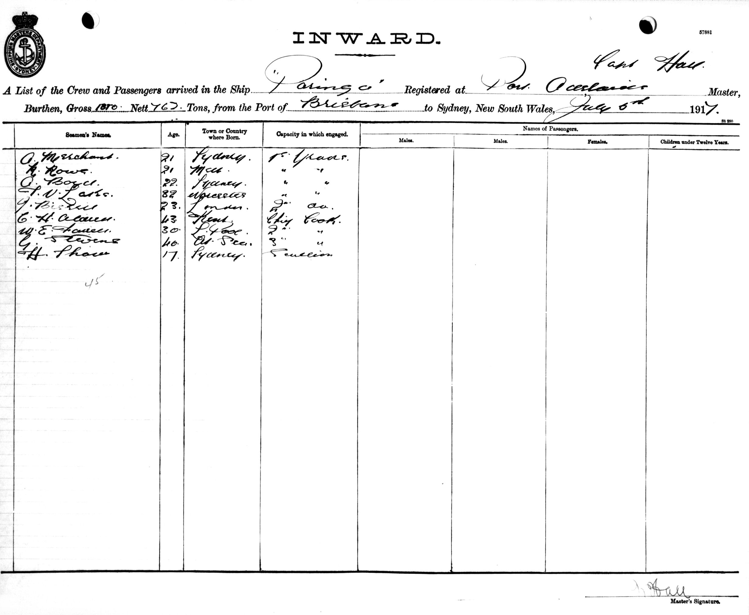 PARINGAOF PORT ADELAIDE, W. HALL, MASTER, BURTHEN 1310/762 TONS FROM THE PORT OF BRISBANE TO SYDNEY, NEW SOUTH WALES, 5TH JULY 1917 |