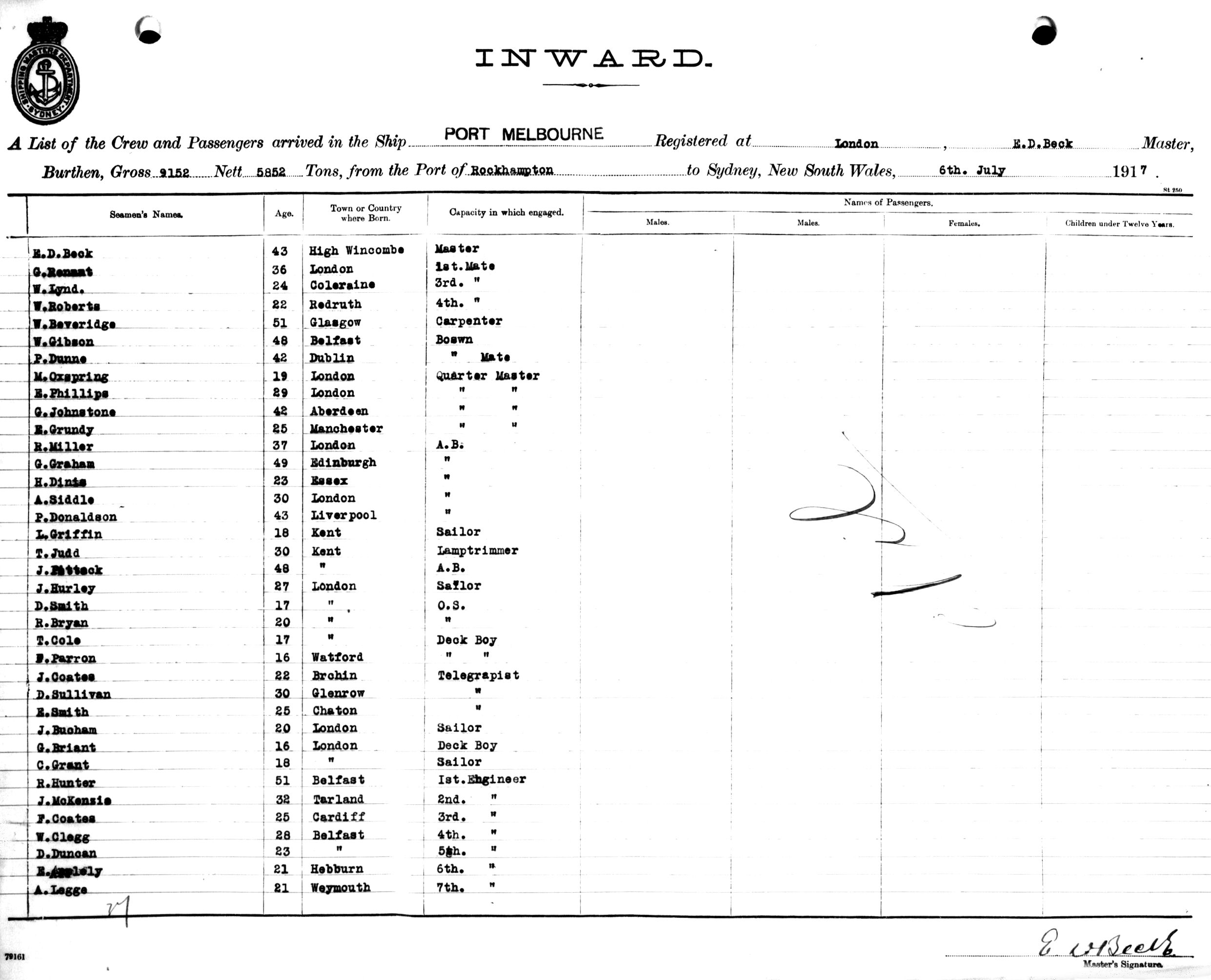 PORT MELBOURNEOF LONDON, E. D. BECK, MASTER, BURTHEN 9152/5852 TONS FROM THE PORT OF ROCKHAMPTON TO SYDNEY, NEW SOUTH WALES, 6TH JULY 1917 |
